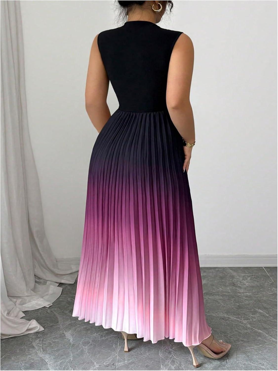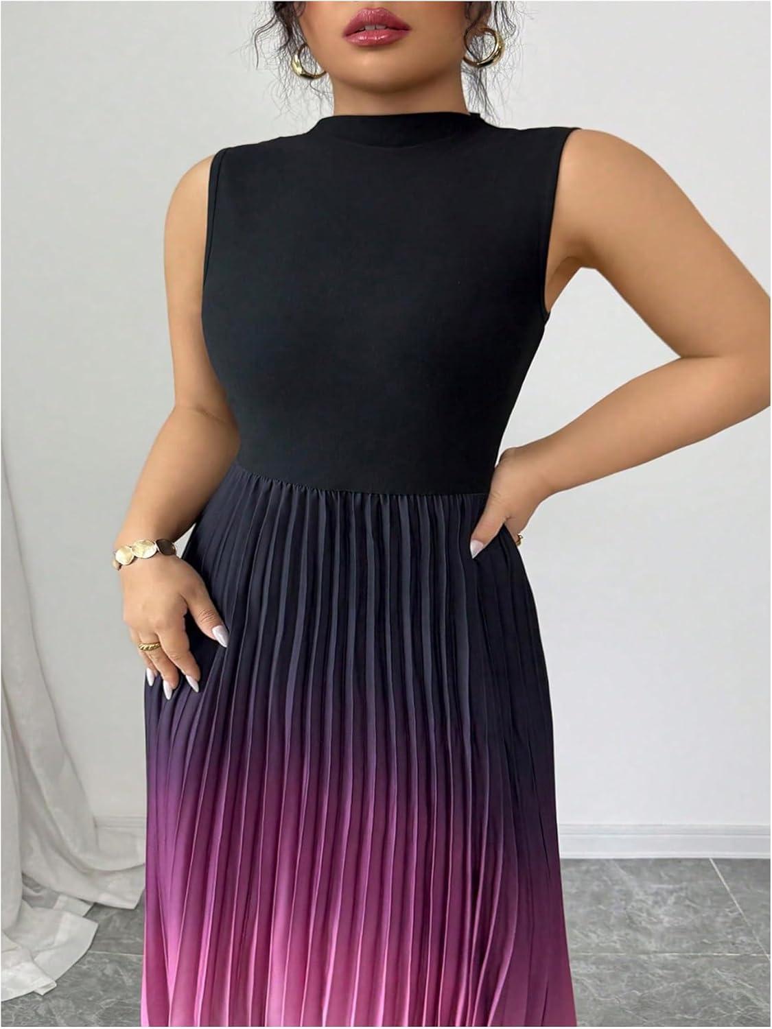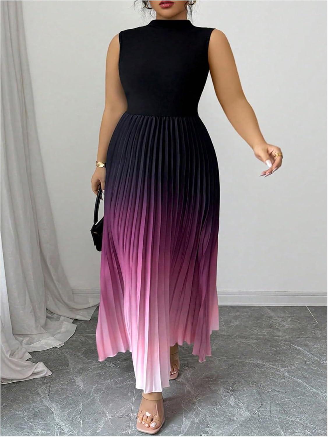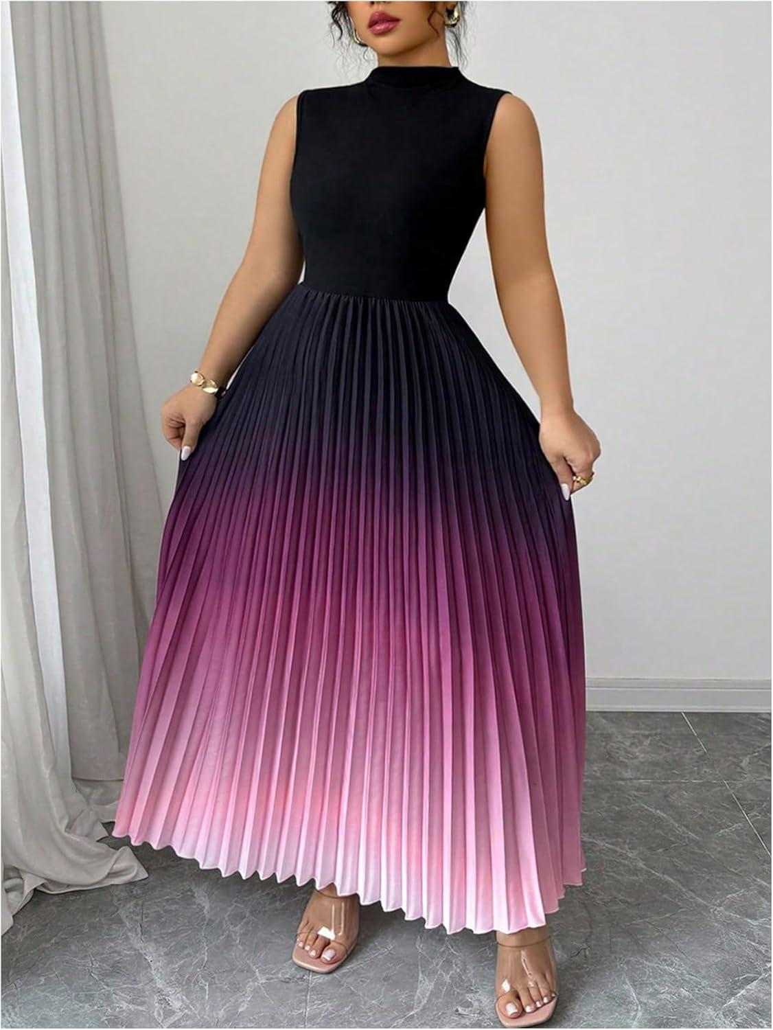 SOLY HUX Women’s Plus Size Maxi Dress Ombre Mock Neck Sleeveless Pleated A Line Flowy Long Dresses(Multicoloured Gradient)