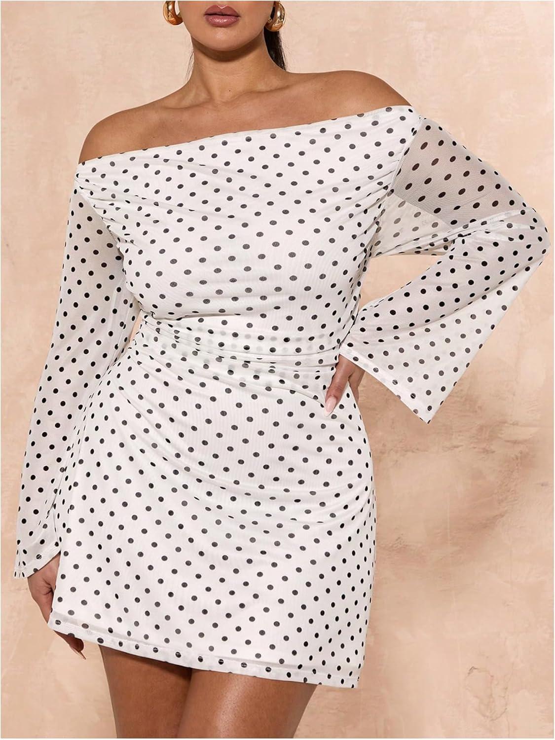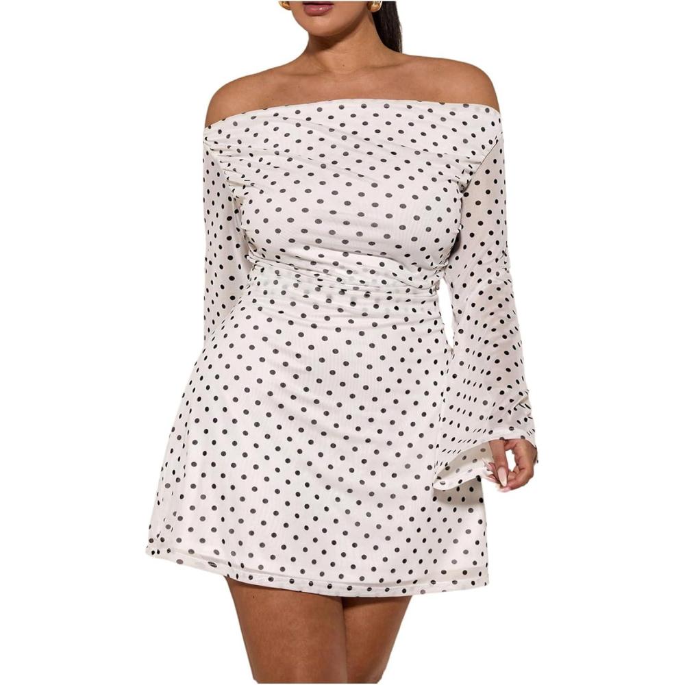 SOLY HUX Women’s Plus Size Off The Shoulder Tie Dye Mini Dress Flared Long Sleeve Bodycon Party Dress(White Polka Dots)