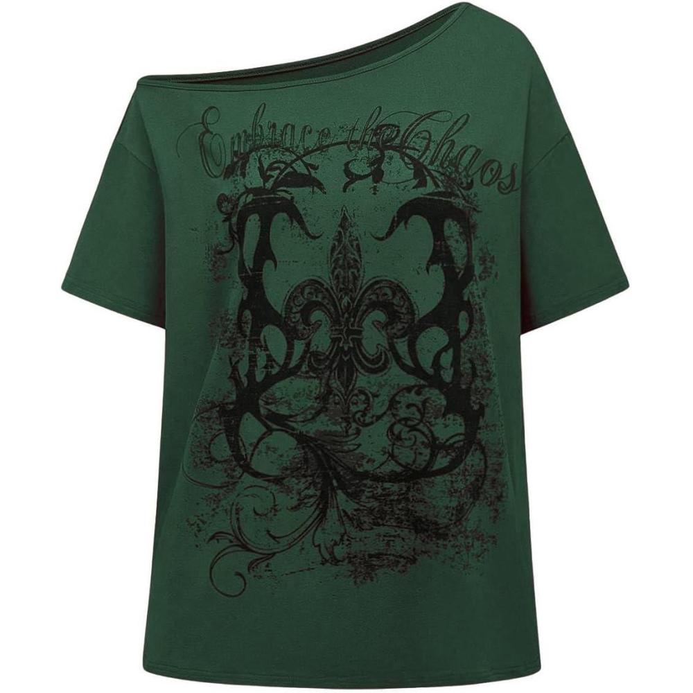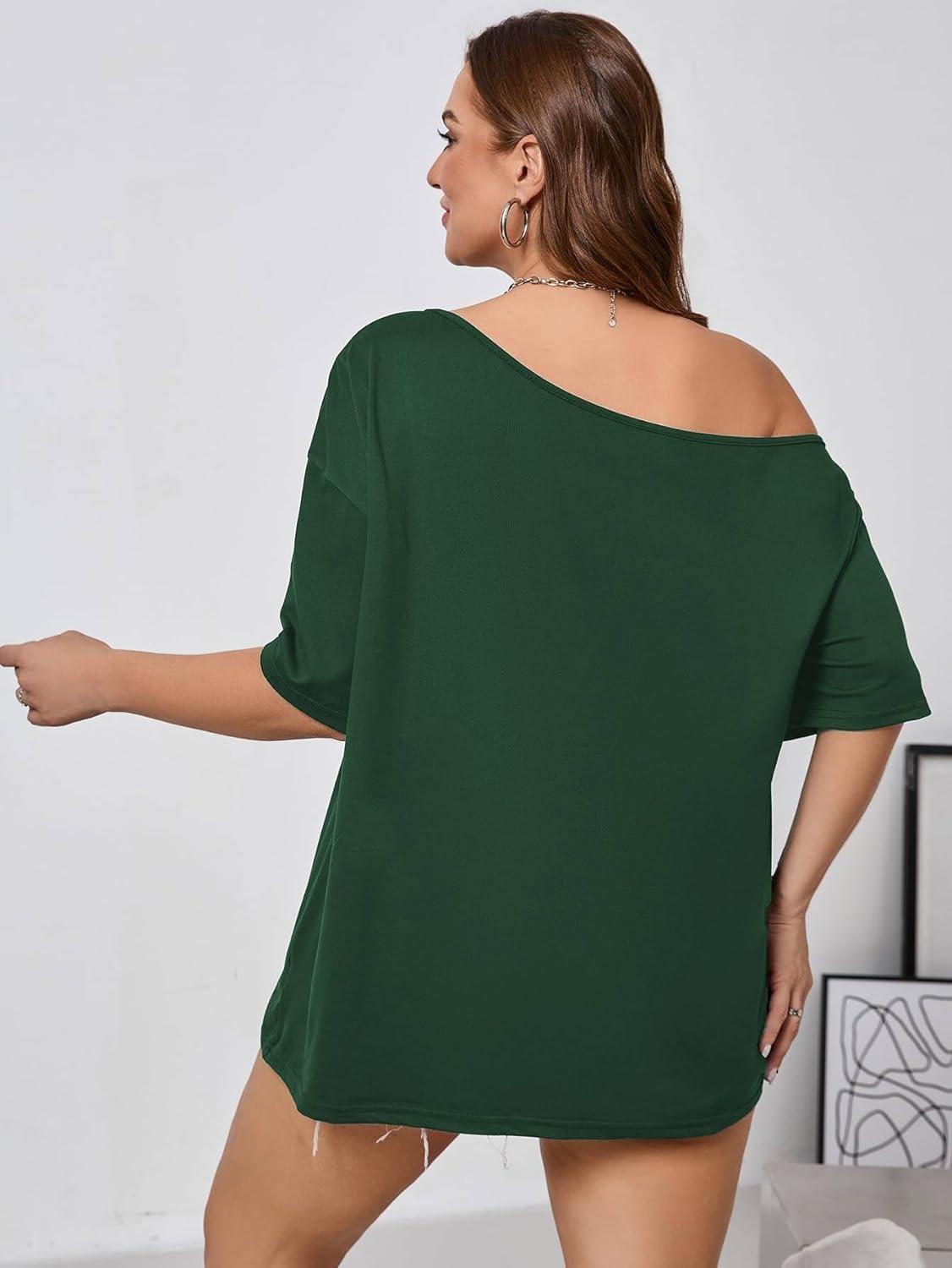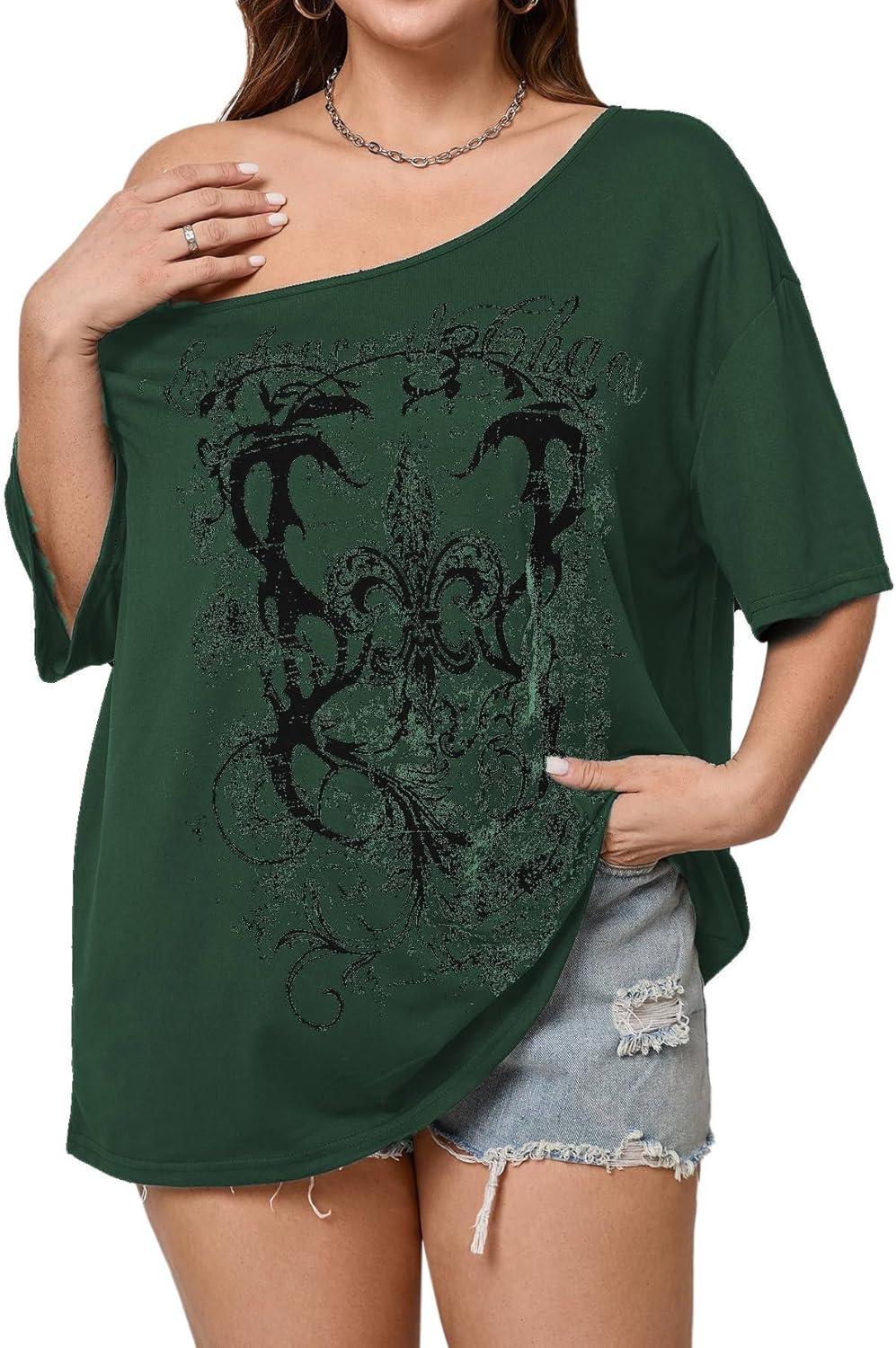 SOLY HUX Women’s Plus Size Off The Shoulder Tops Graphic Tees Y2K Clothes Casual Short Sleeve Oversized T Shirts(Dark Green Graphic)