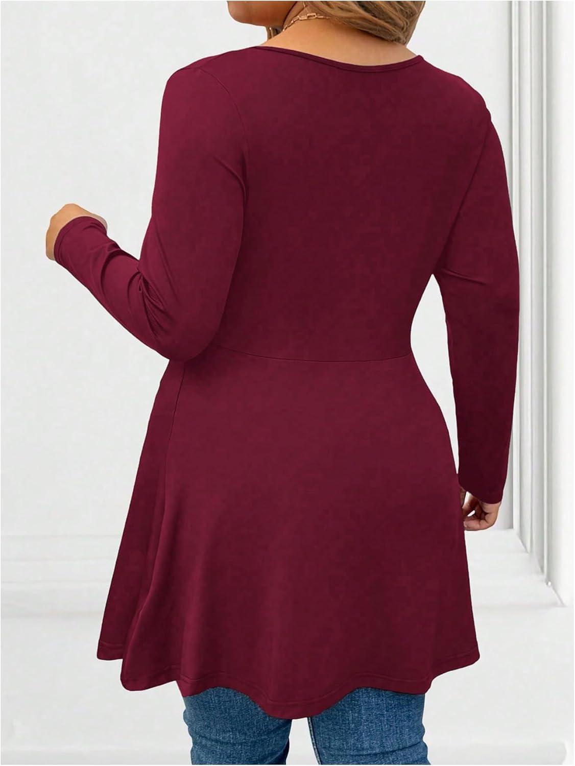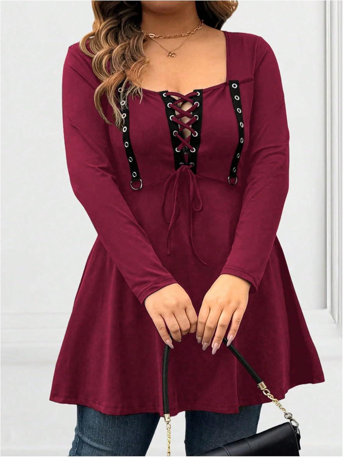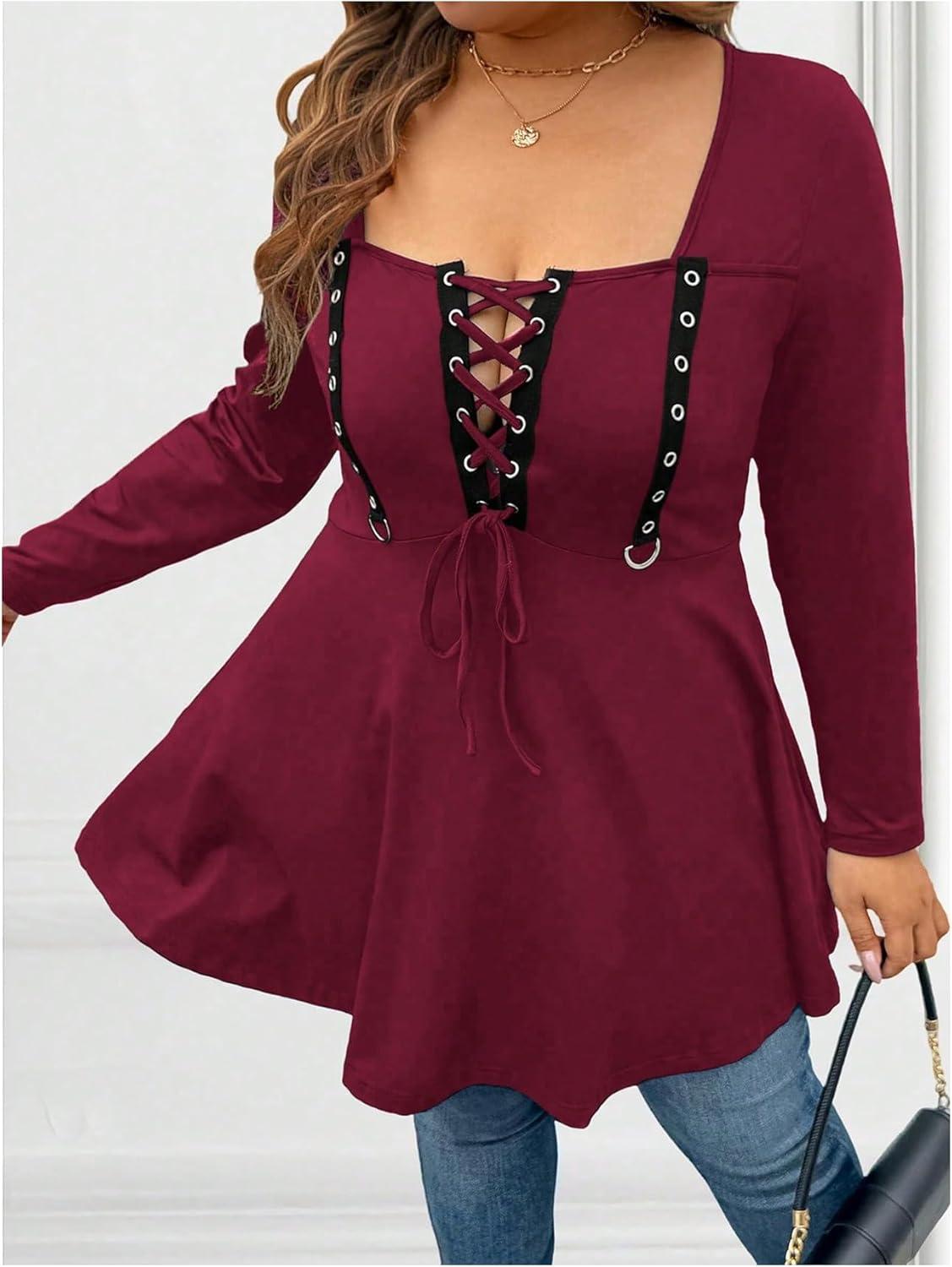 SOLY HUX Women’s Plus Size Peplum Tops Lace Up Square Neck Long Sleeve Ruffle Hem Tee Flowy Casual T Shirt(Pure Burgundy)