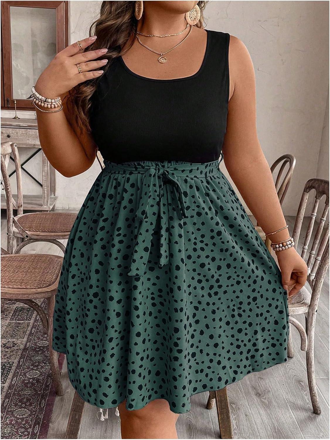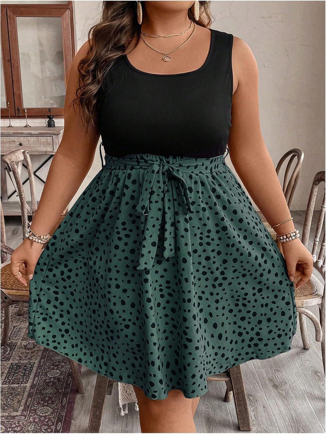 SOLY HUX Women’s Plus Size Polka Dots Sleeveless Summer Tank Dress Belted Vacation Beach Flowy Short Dresses(Dark Green Black Multi)