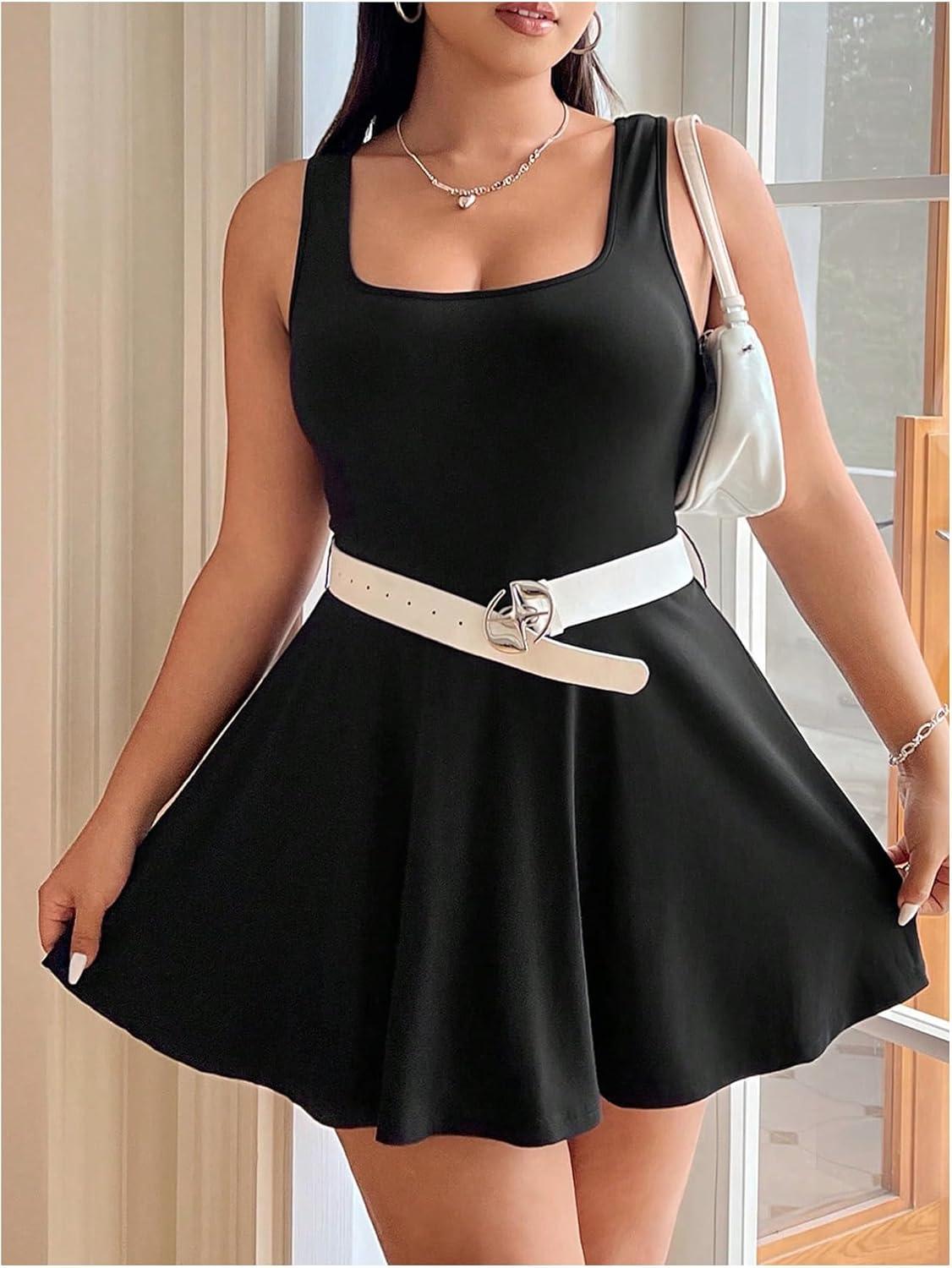 SOLY HUX Women’s Plus Size Sleeveless Rompers Square Neck Athletic Tennis Dress Built in Shorts(Plain Black)