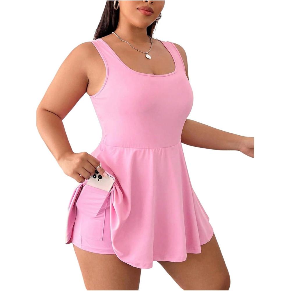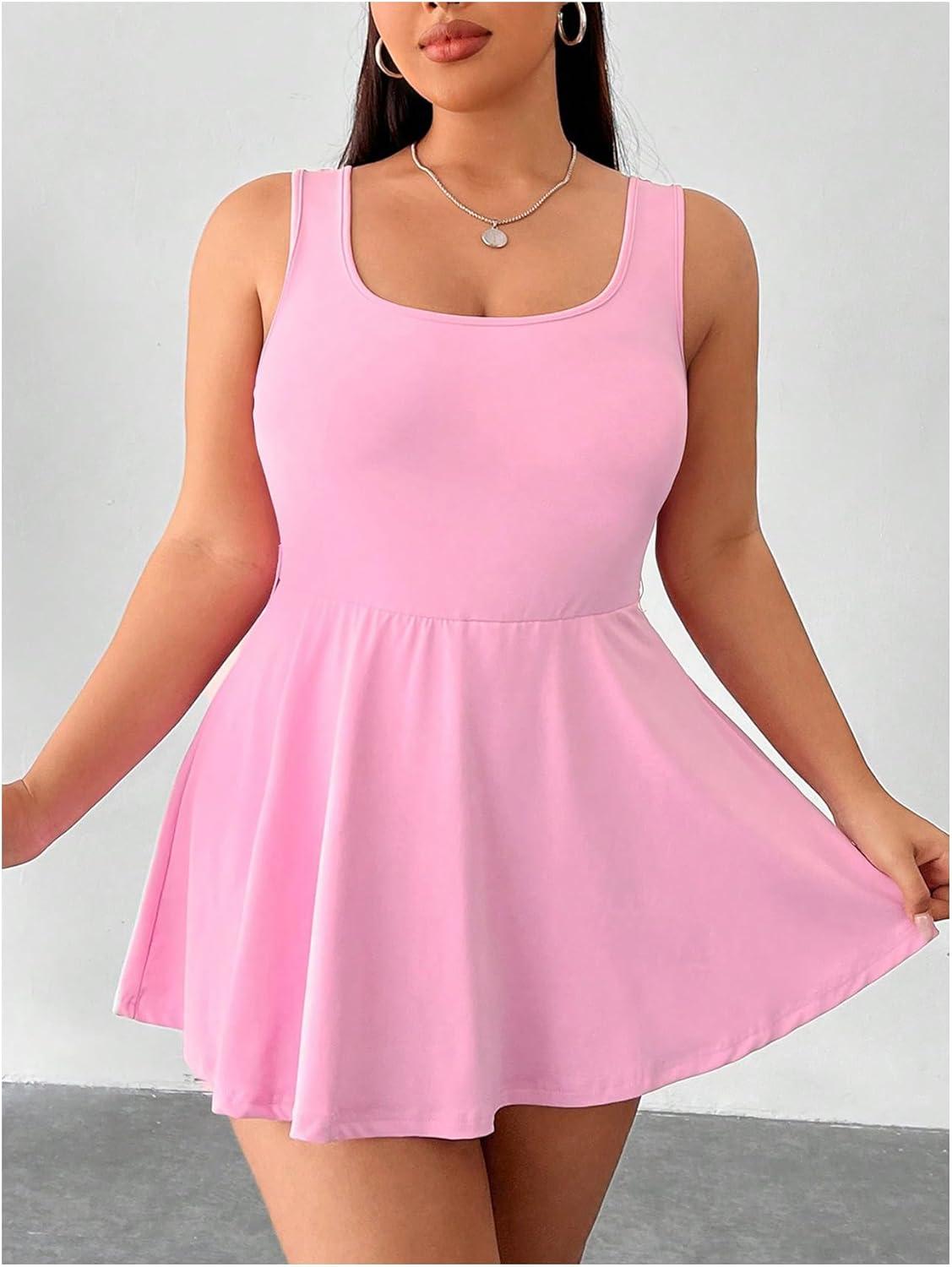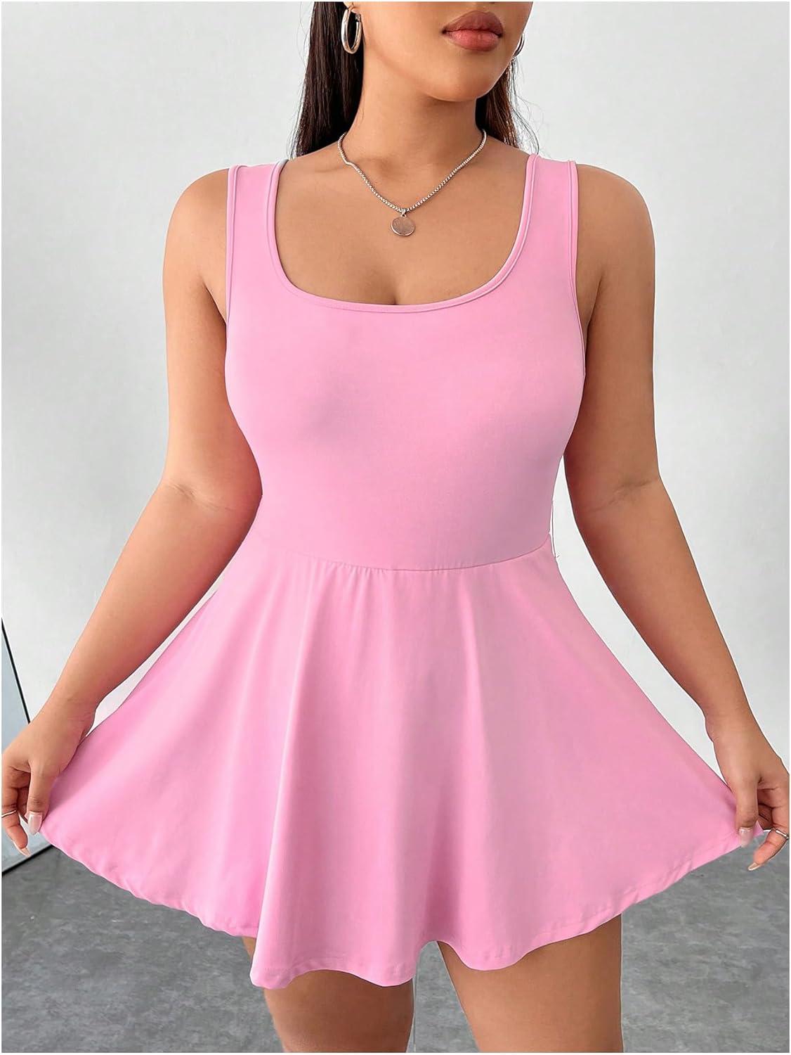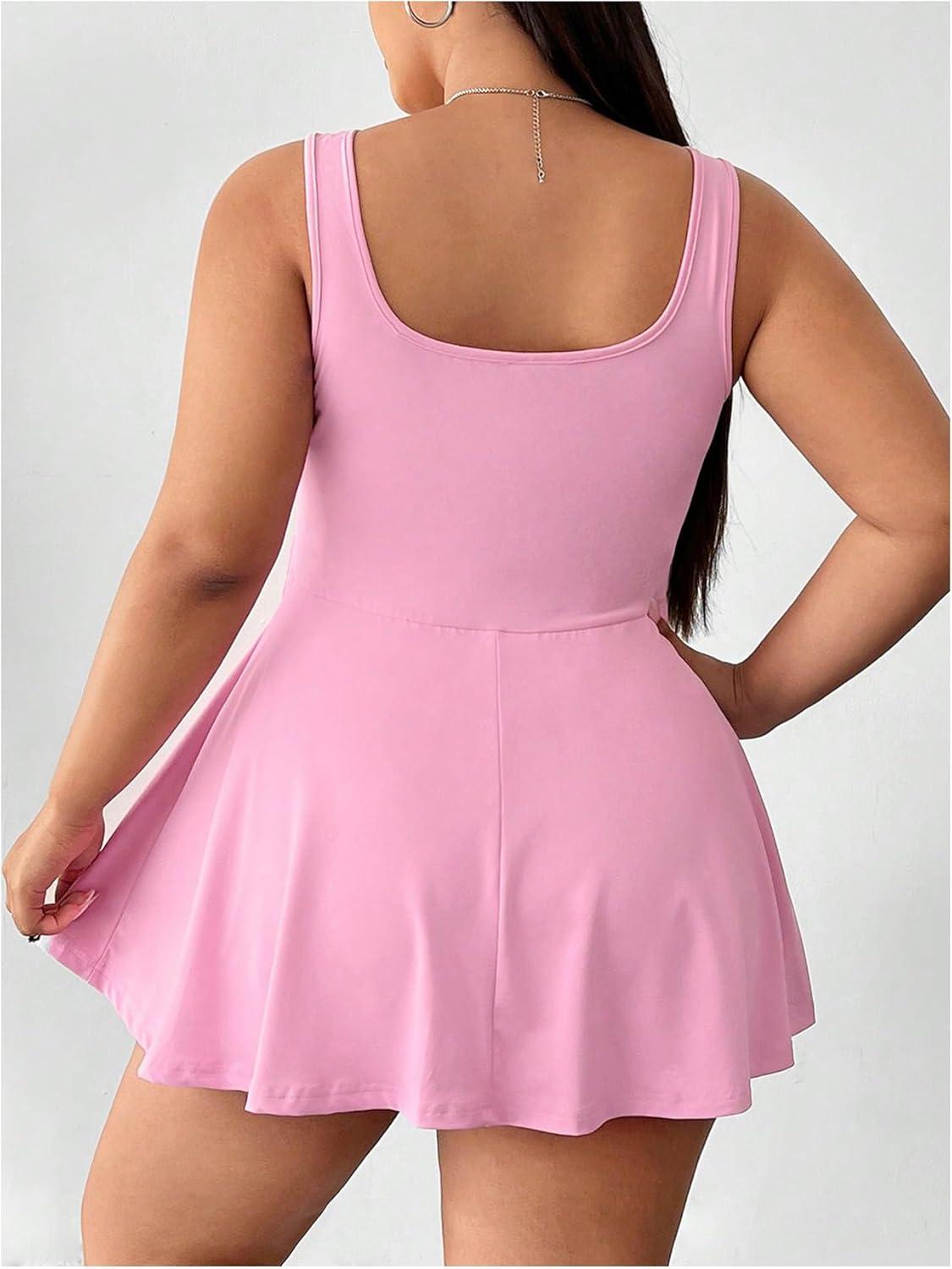SOLY HUX Women’s Plus Size Sleeveless Rompers Square Neck Athletic Tennis Dress Built in Shorts(Plain Pink)