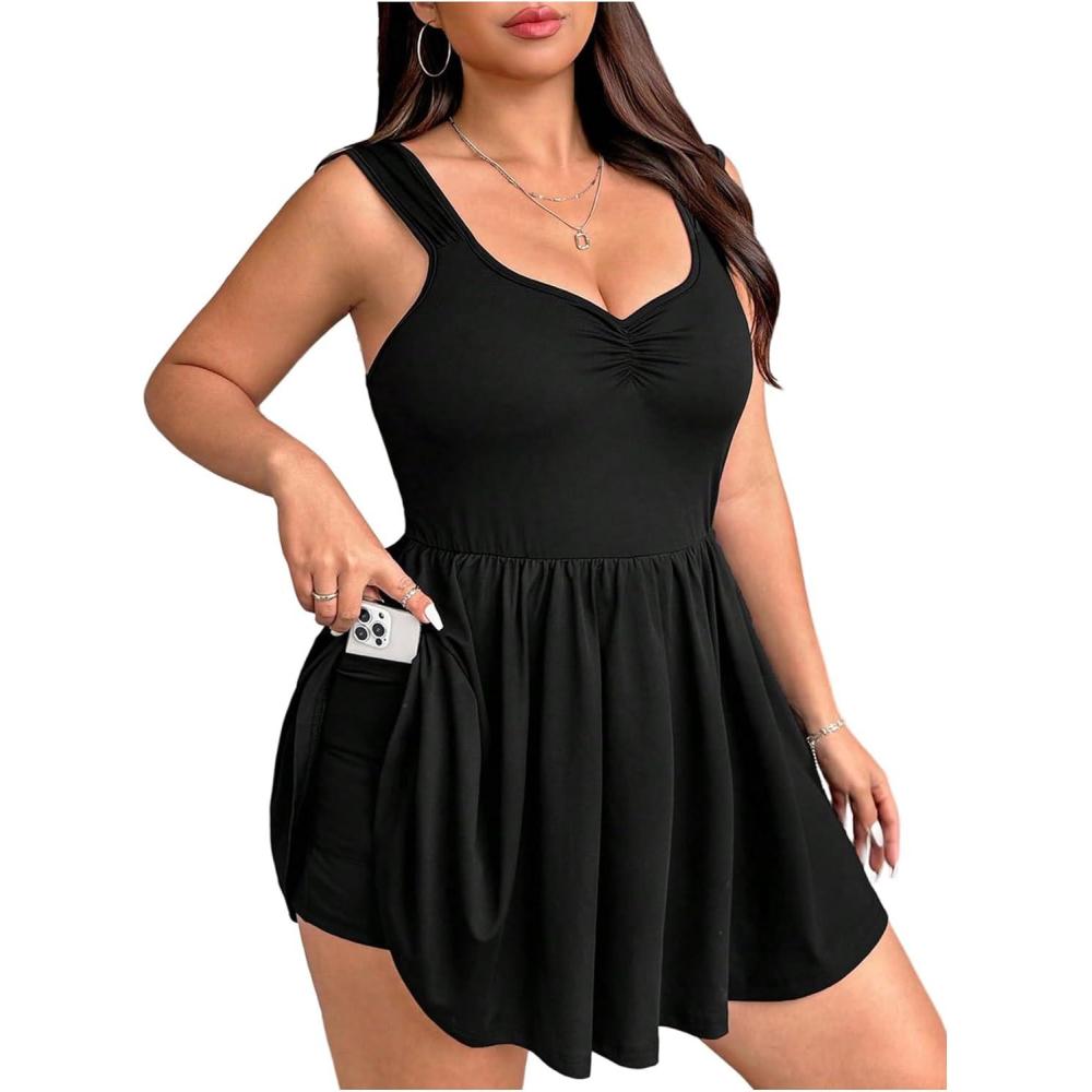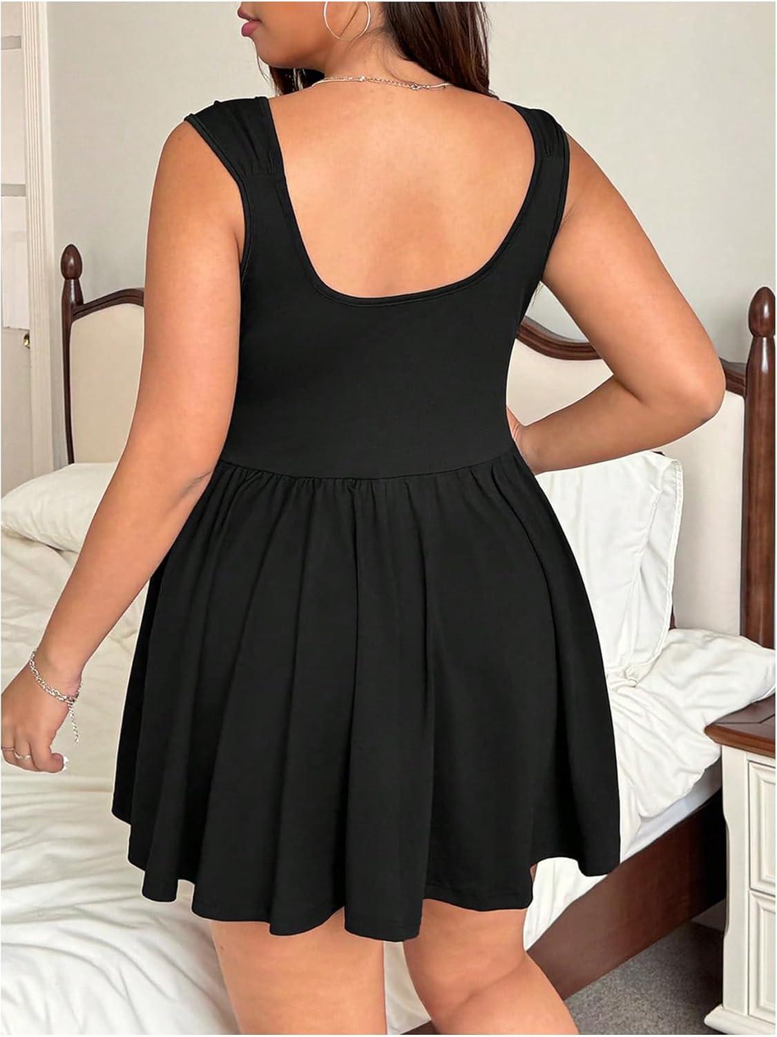 SOLY HUX Women’s Plus Size Sleeveless Rompers Square Neck Athletic Tennis Dress Built in Shorts(Solid Plain Black)