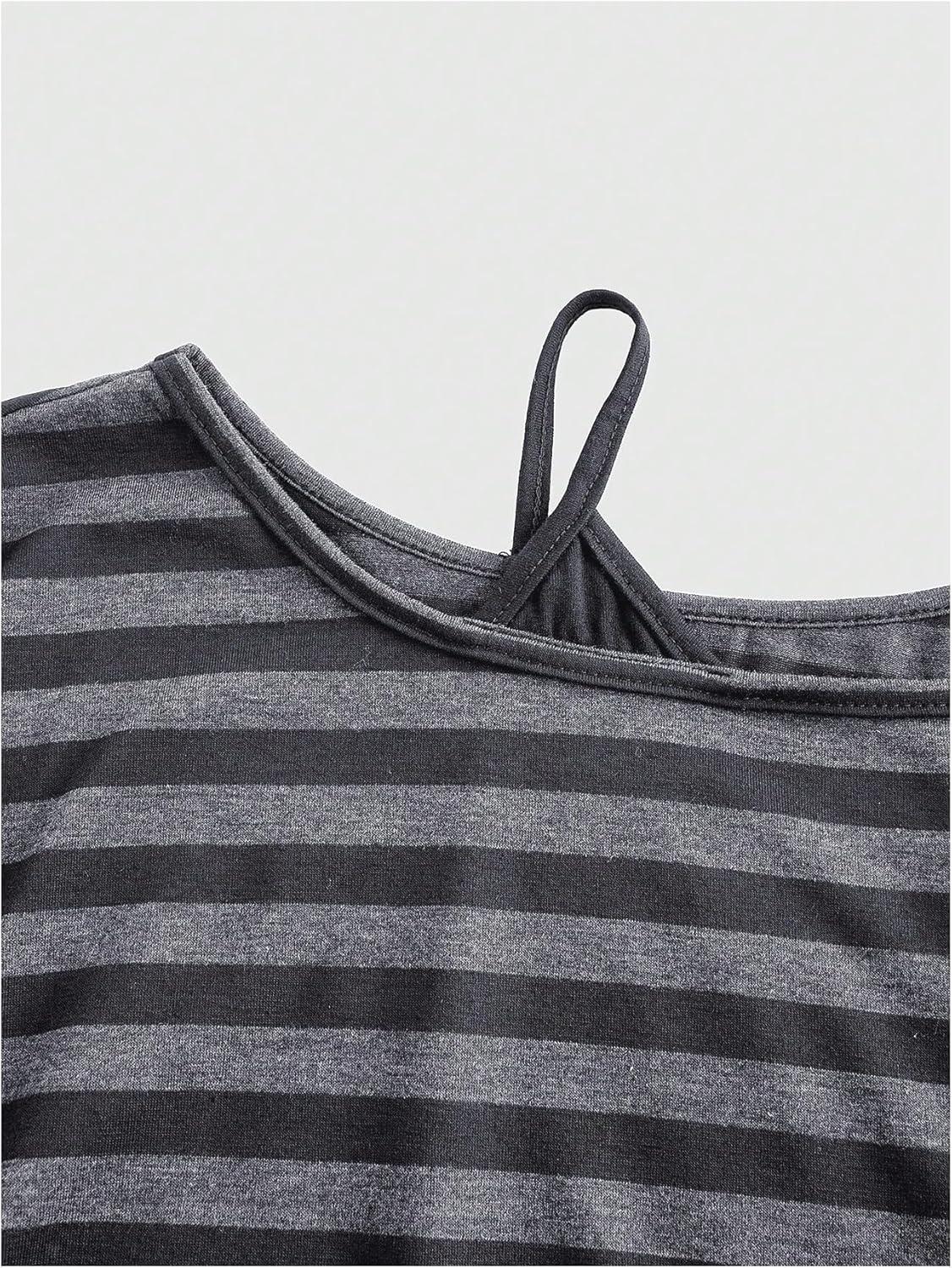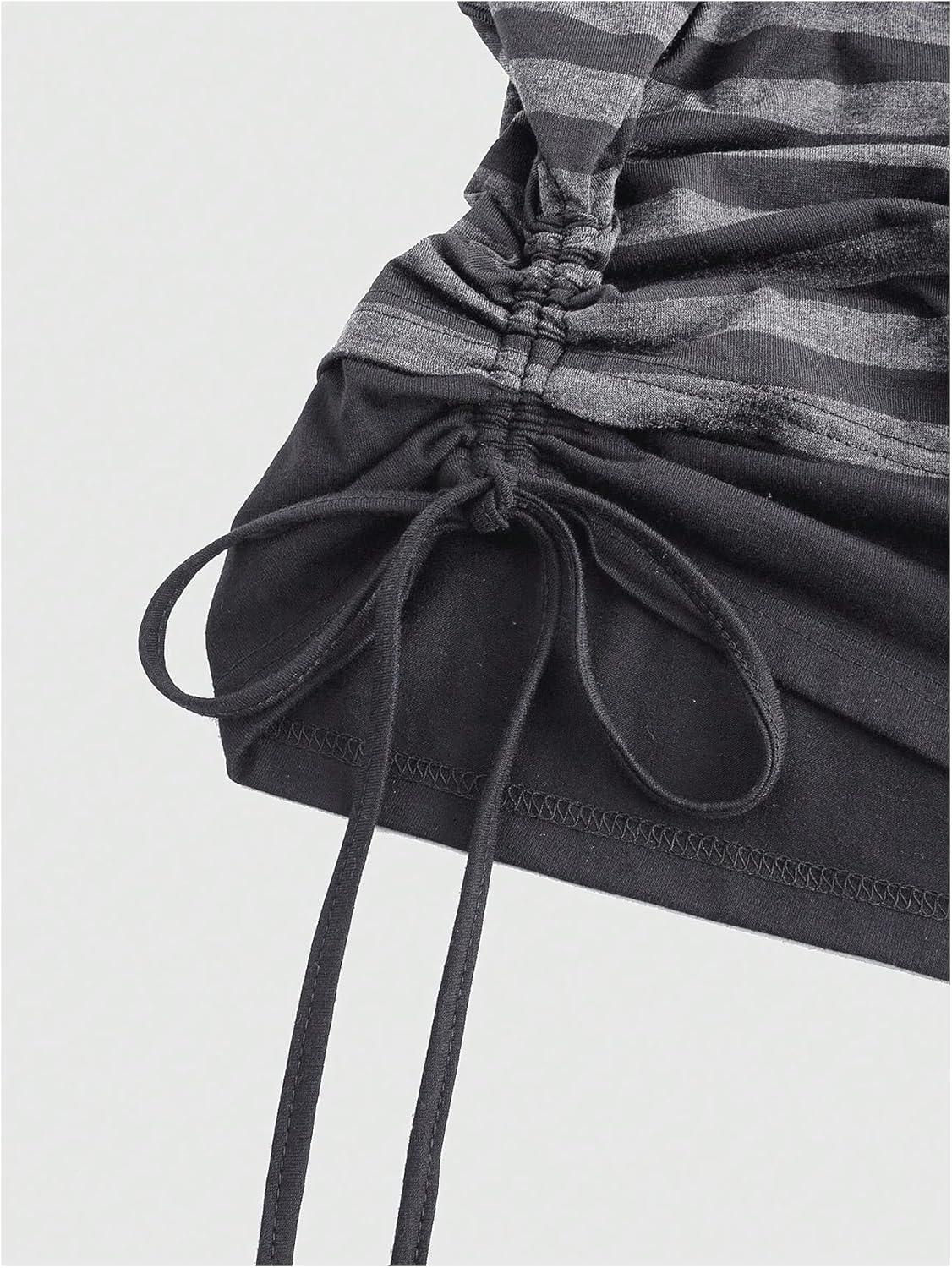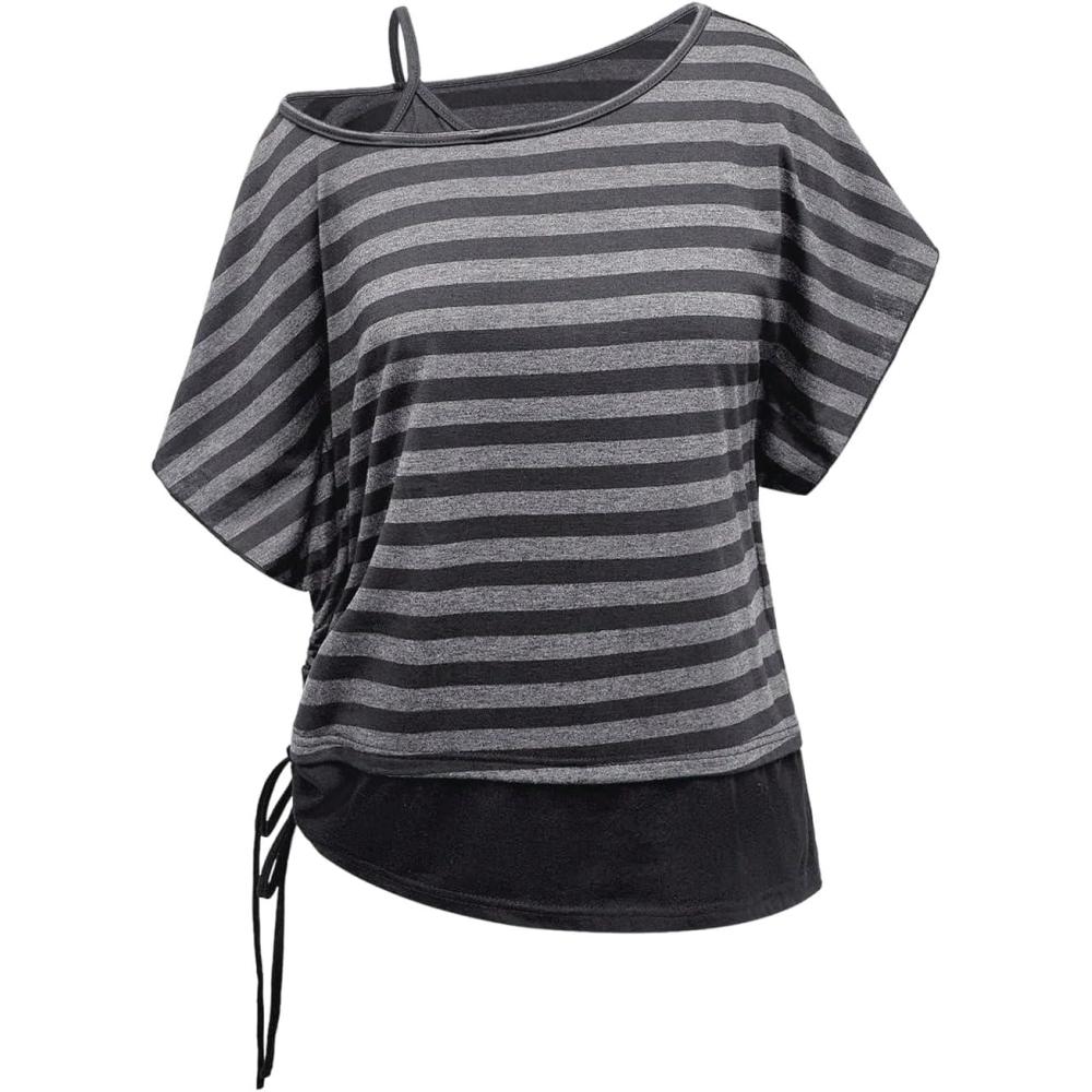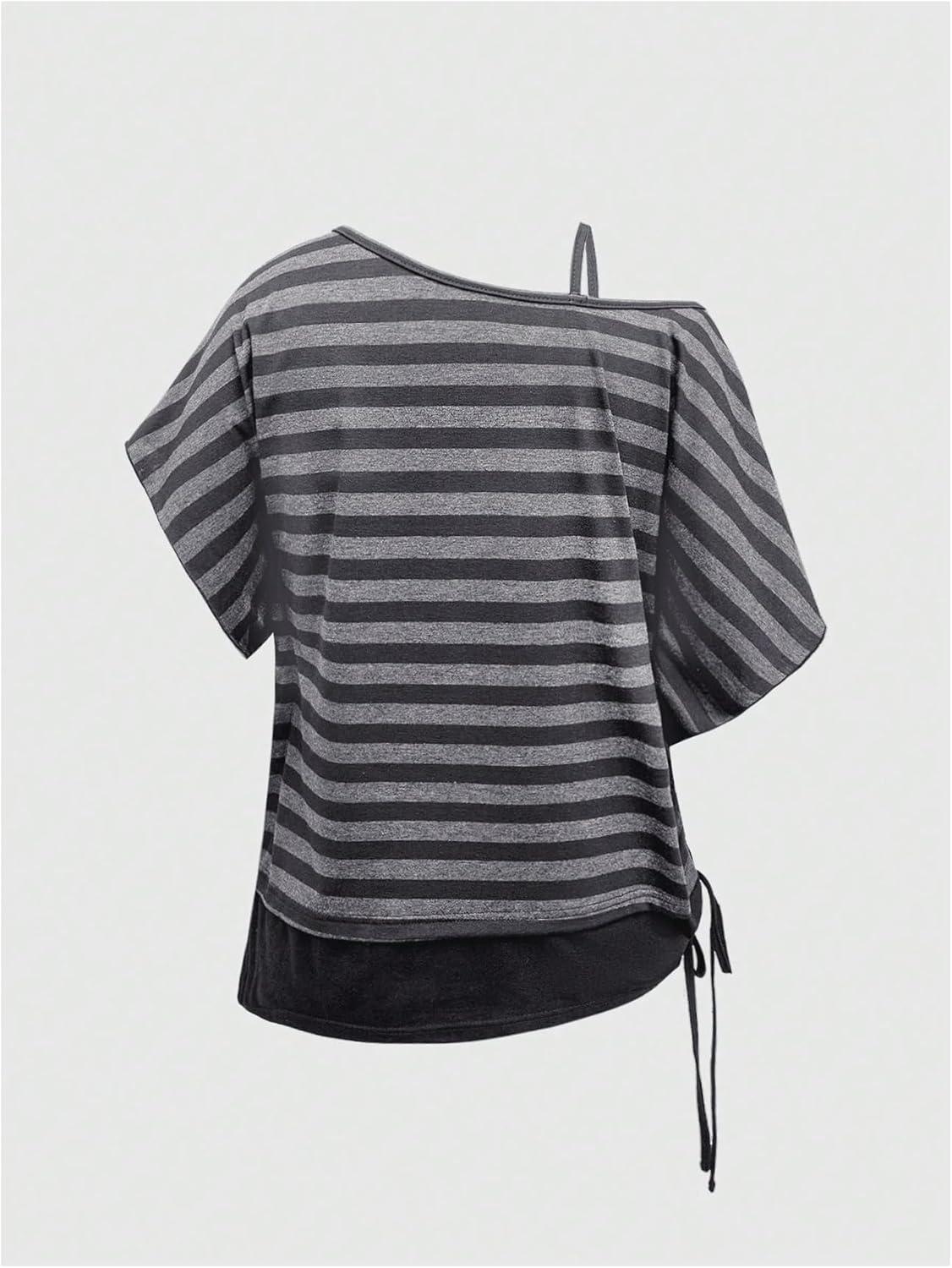 SOLY HUX Women’s Plus Size Striped T Shirt Y2k Cold Shoulder Short Sleeve Summer Tops Drawstring Side Casual Tee(Grey Striped)