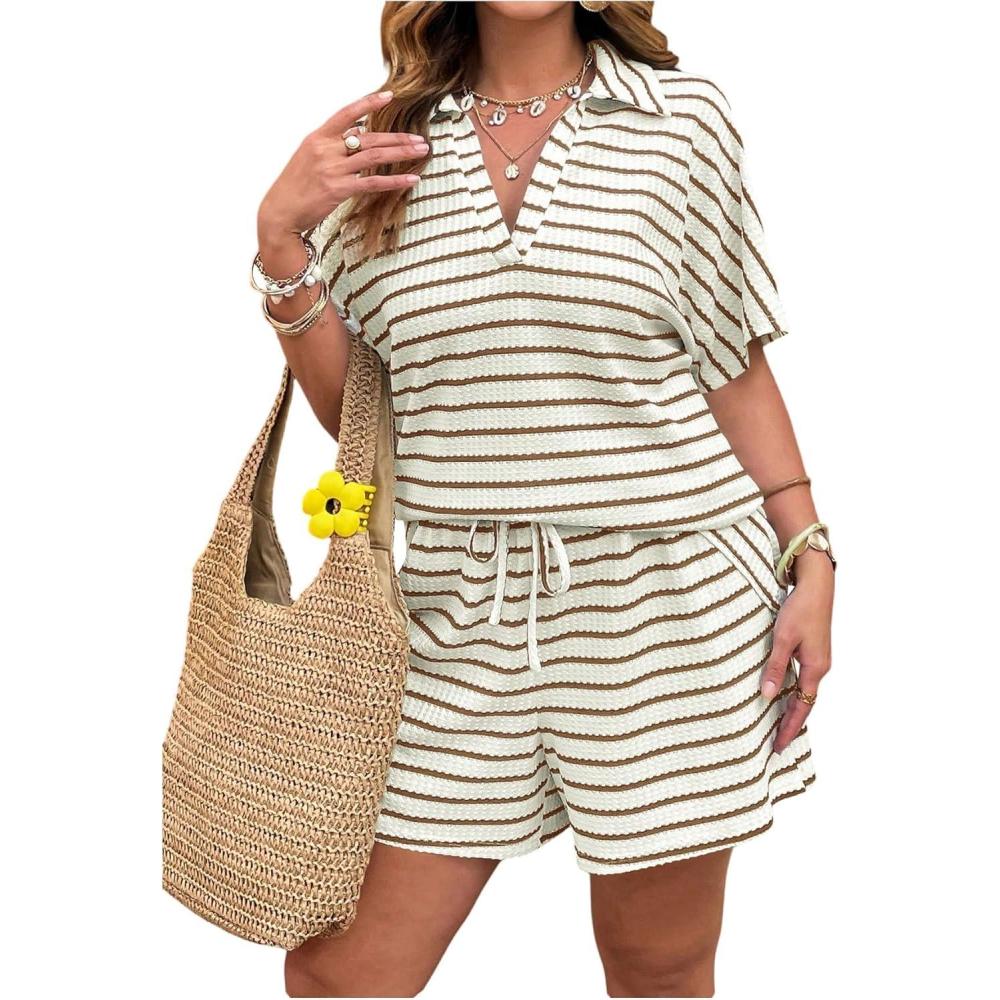 SOLY HUX Women’s Plus Size Summer Outfits Striped Print Short Sleeve Top and Shorts 2 Piece Set(Khaki Striped)