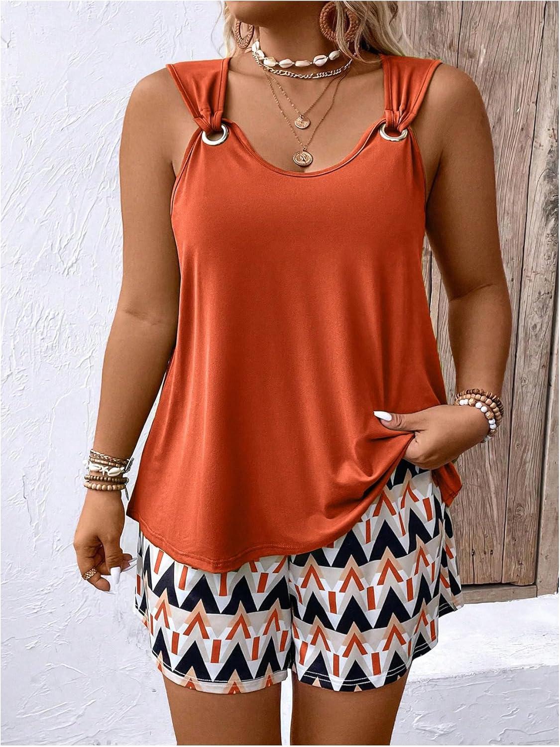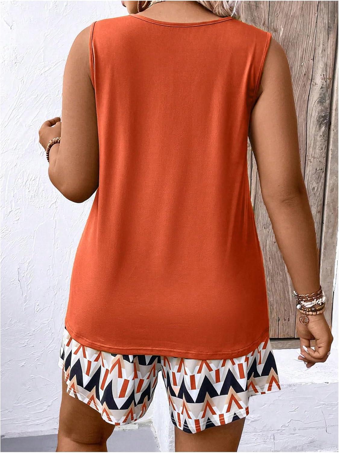 SOLY HUX Women’s Plus Size Summer Vacation Outfits Sleeveless Tank Top and Printed Shorts 2 Piece Set(Orange Multi)
