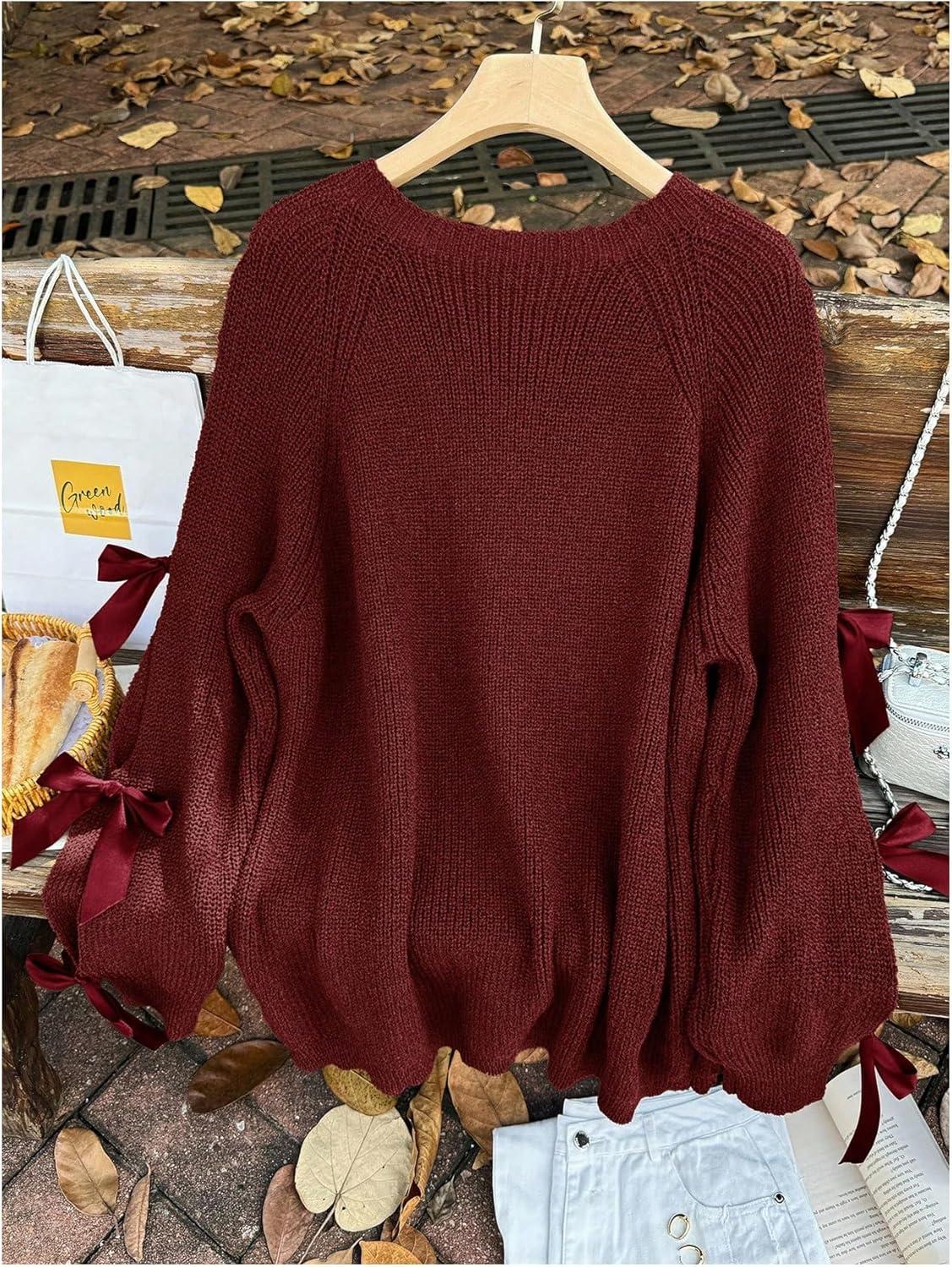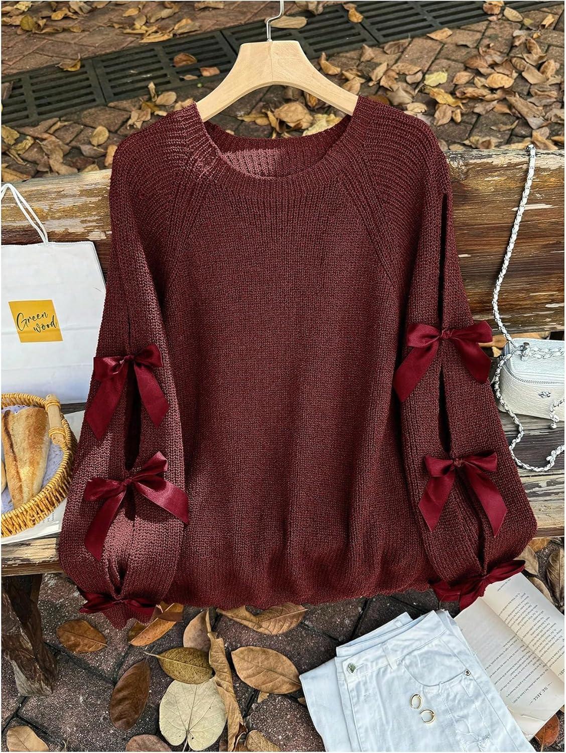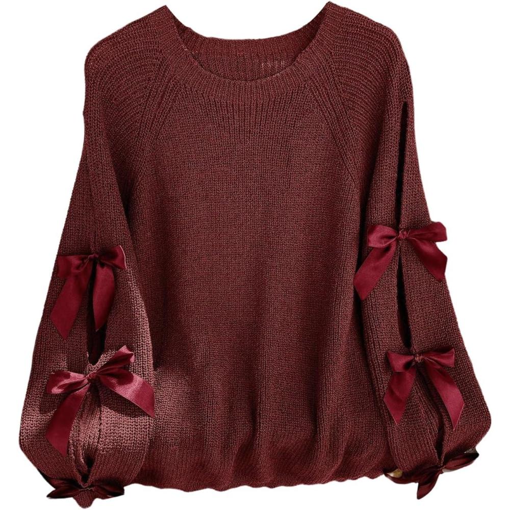 SOLY HUX Women’s Plus Size Sweaters Pullover Bowknot Long Sleeve Crew Neck Knit Fall Tops(Plain Burgundy)