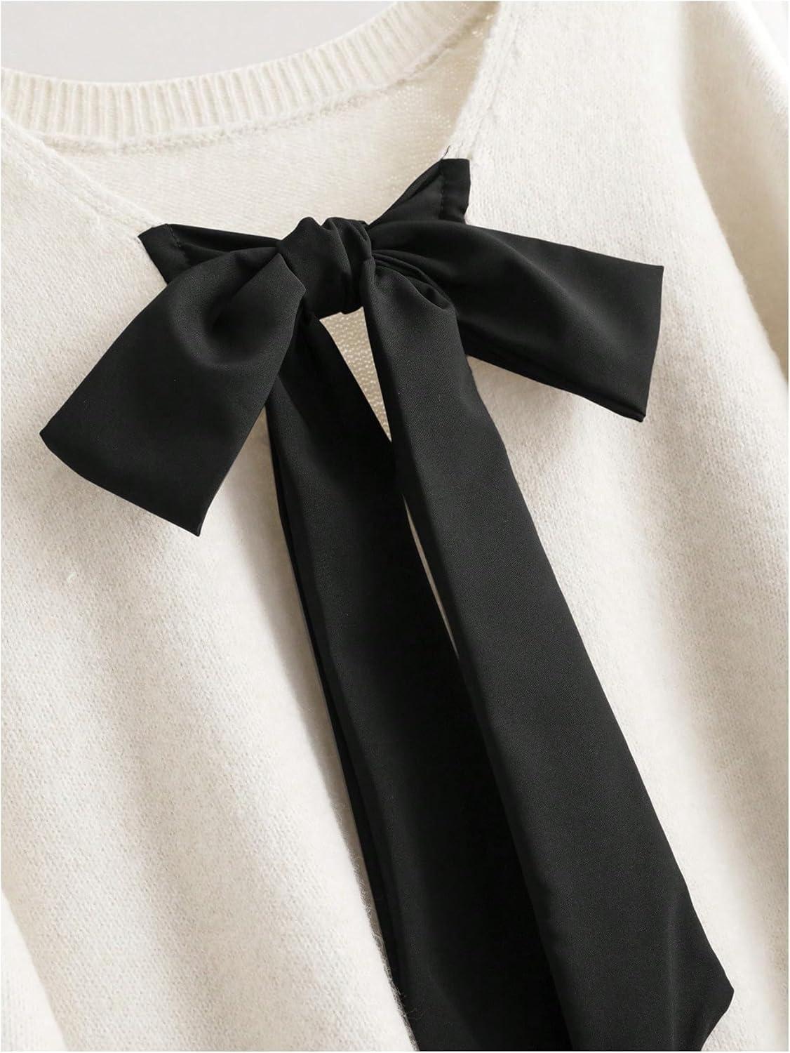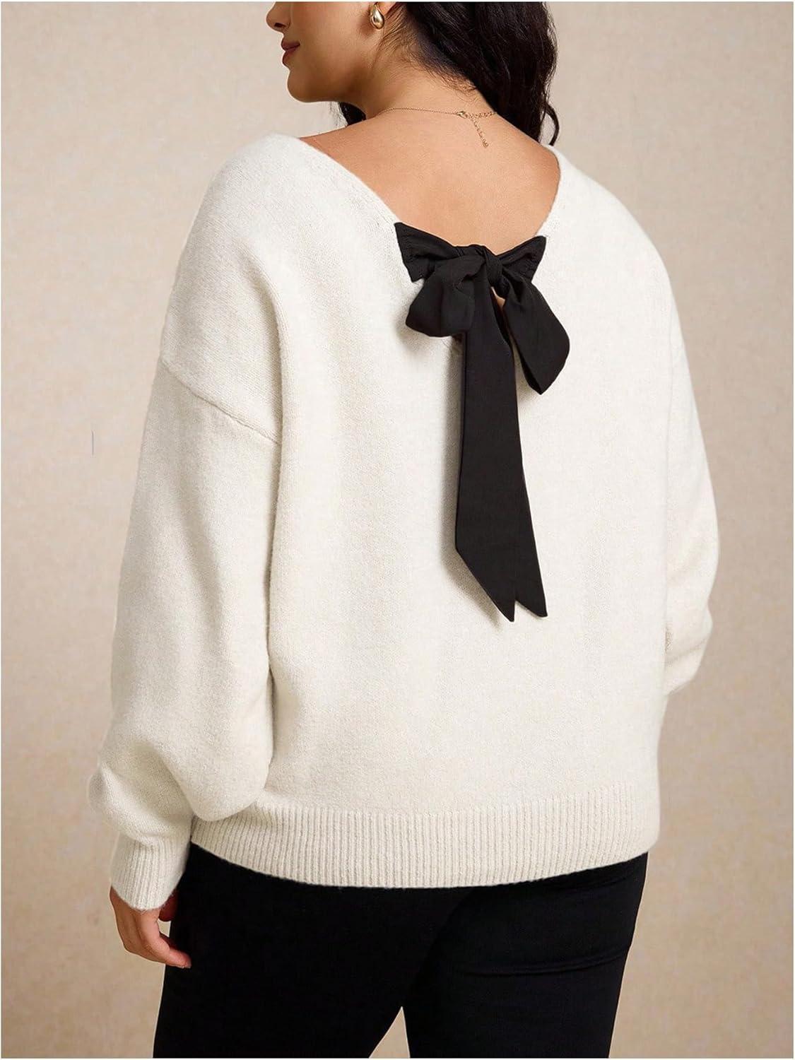 SOLY HUX Women’s Plus Size Sweaters Pullover Bowknot V Neck Long Sleeve Knit Tops Fall Clothes(White Bow)