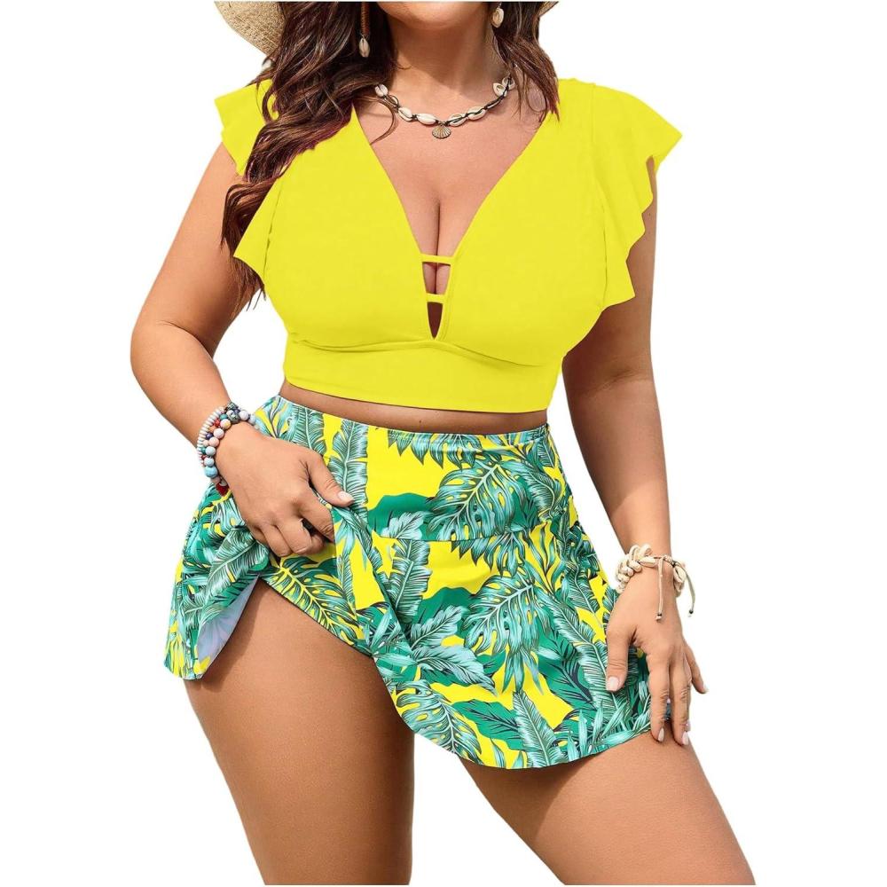 SOLY HUX Women’s Plus Size Tankini Swimsuits V Neck Ruffle Tropical Print Swim Skirt Two Piece Bathing Suit(Yellow Tropical)