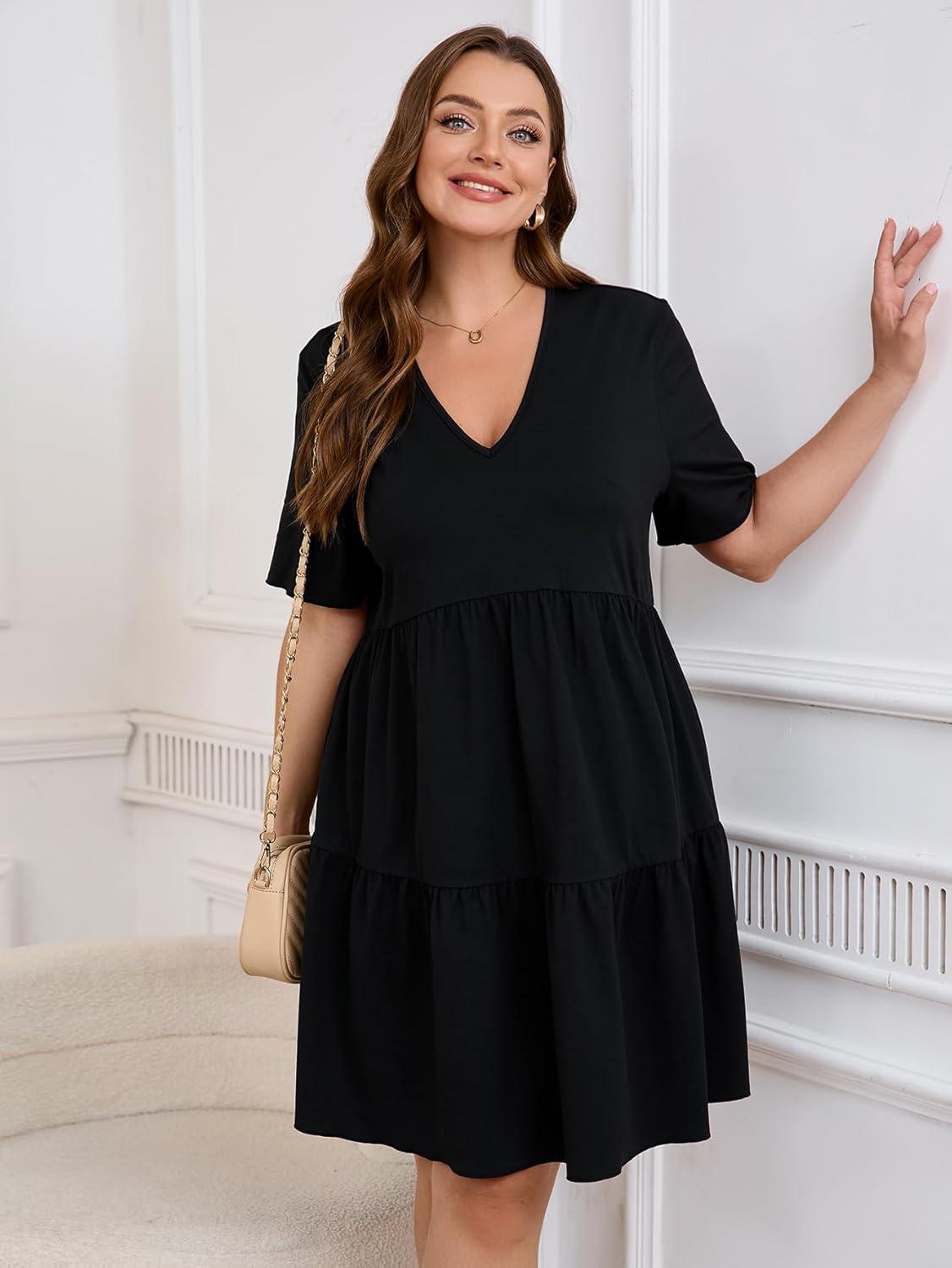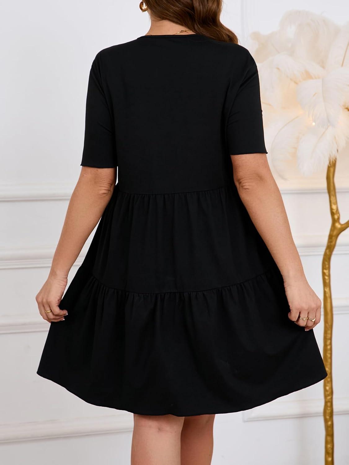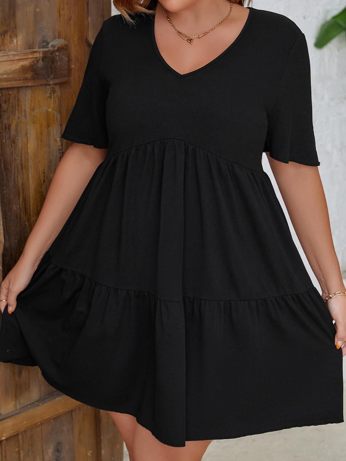 SOLY HUX Women’s Plus Size V Neck Short Sleeve A Line Ruffle Hem Babydoll Flowy Dress(Black)