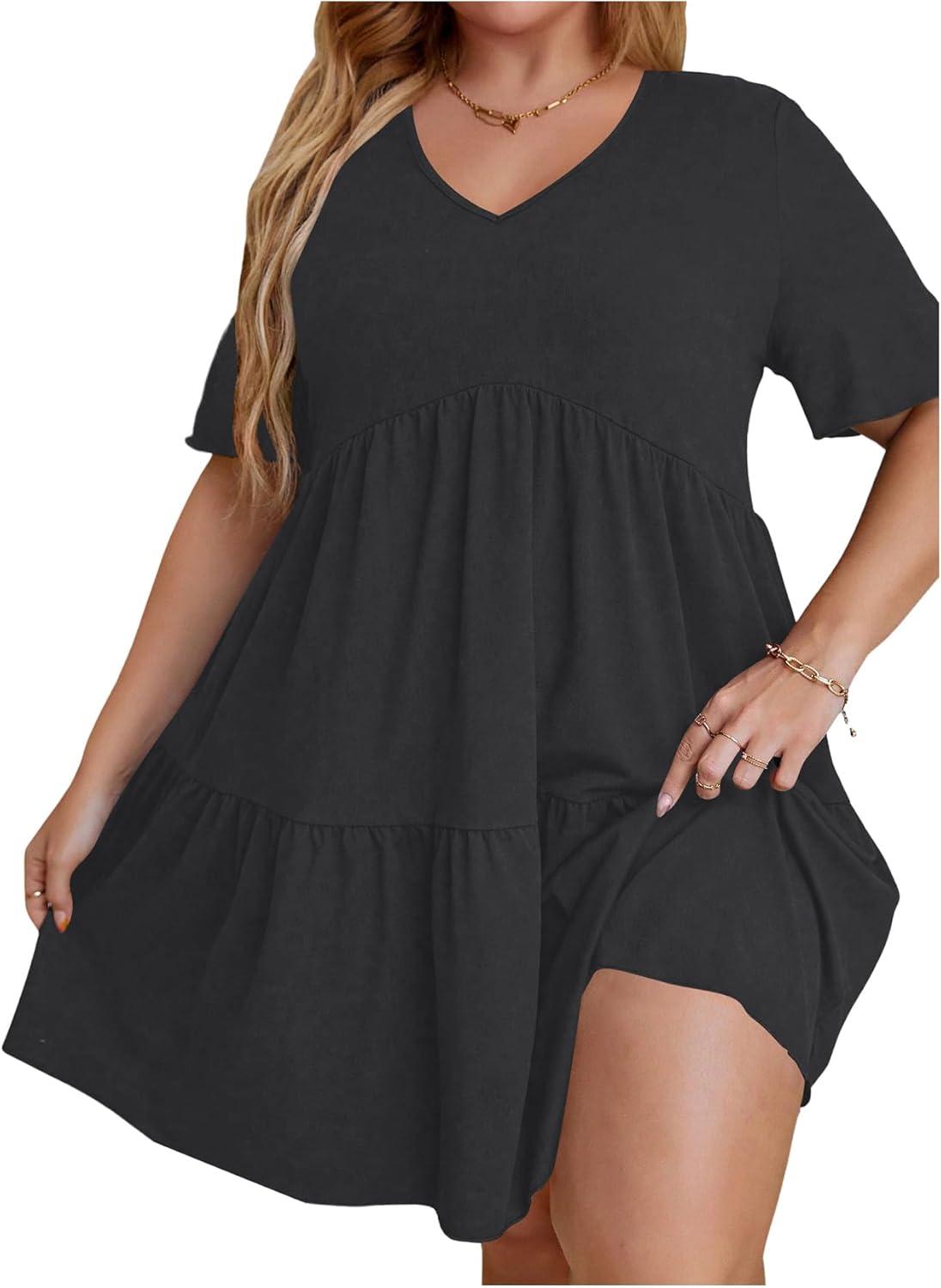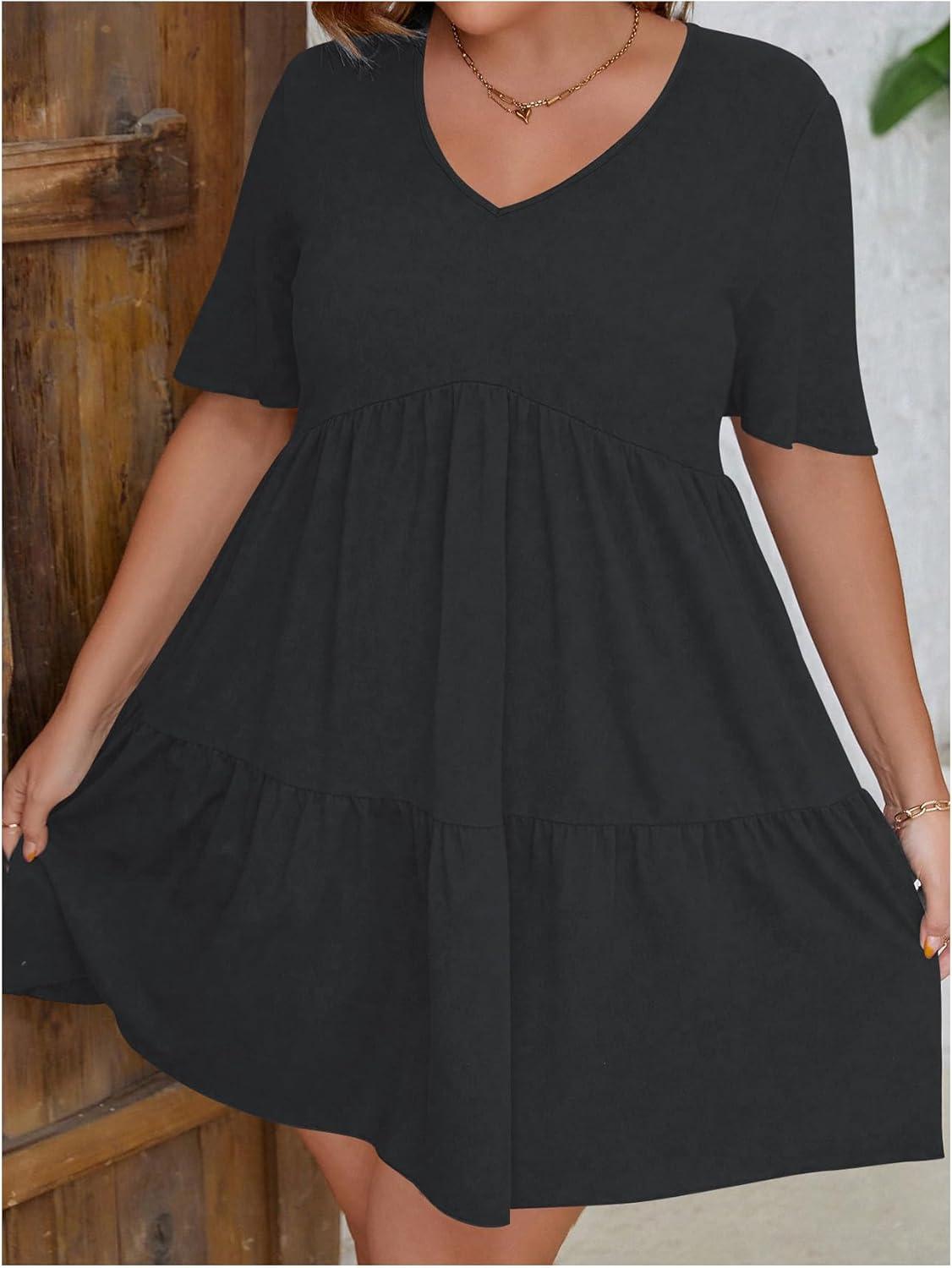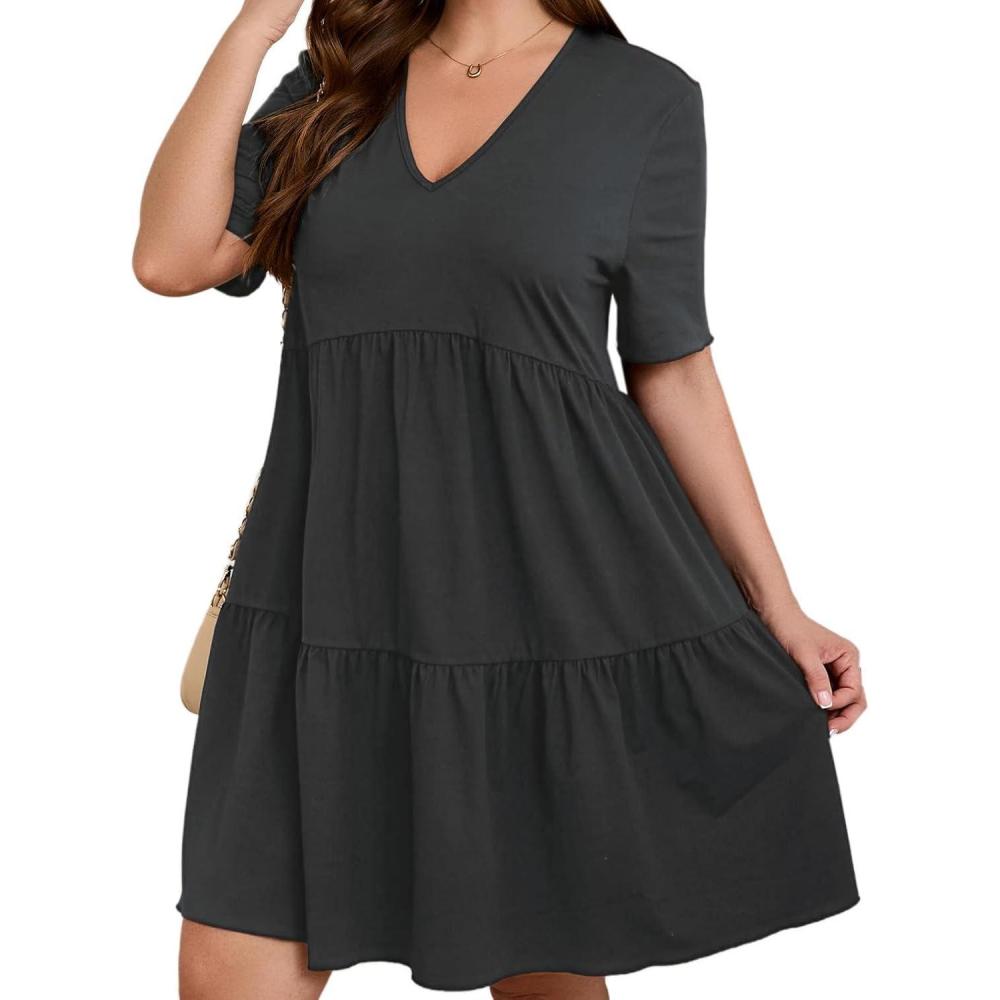 SOLY HUX Women’s Plus Size V Neck Short Sleeve A Line Ruffle Hem Babydoll Flowy Dress(Pure Dark Grey)