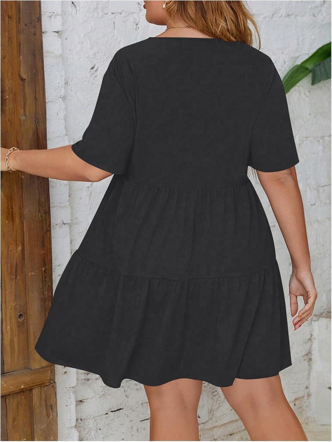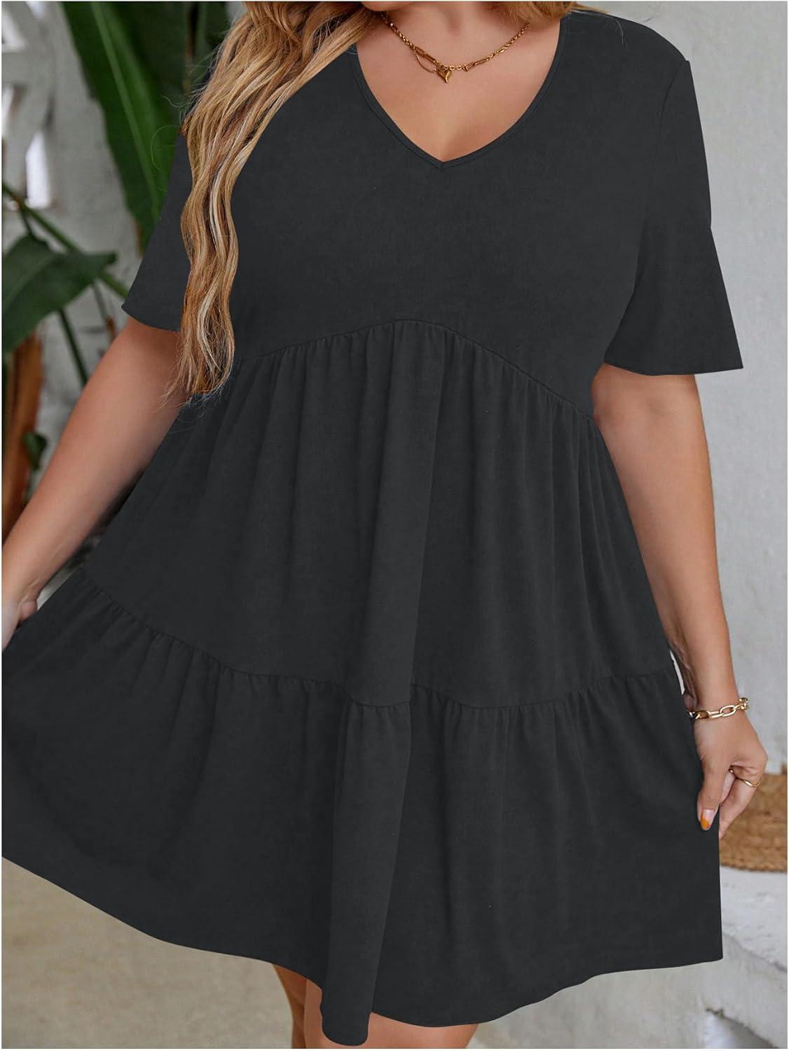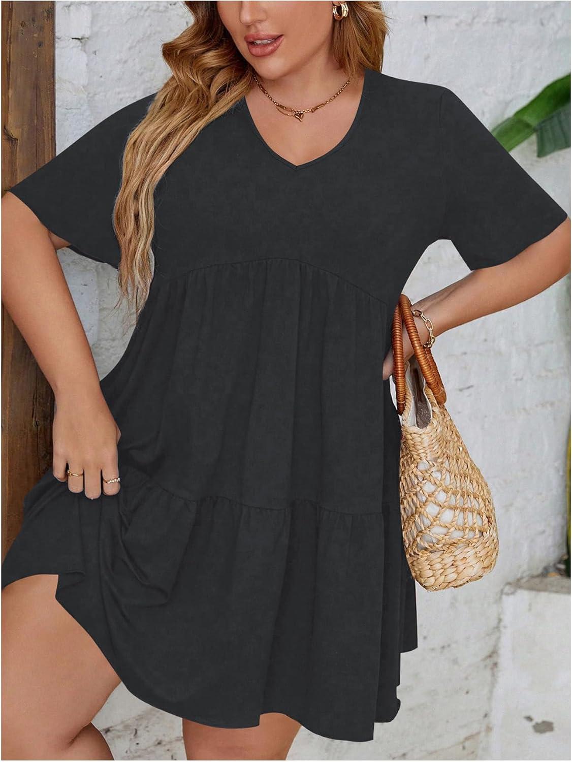 SOLY HUX Women’s Plus Size V Neck Short Sleeve A Line Ruffle Hem Babydoll Flowy Dress(Pure Dark Grey)