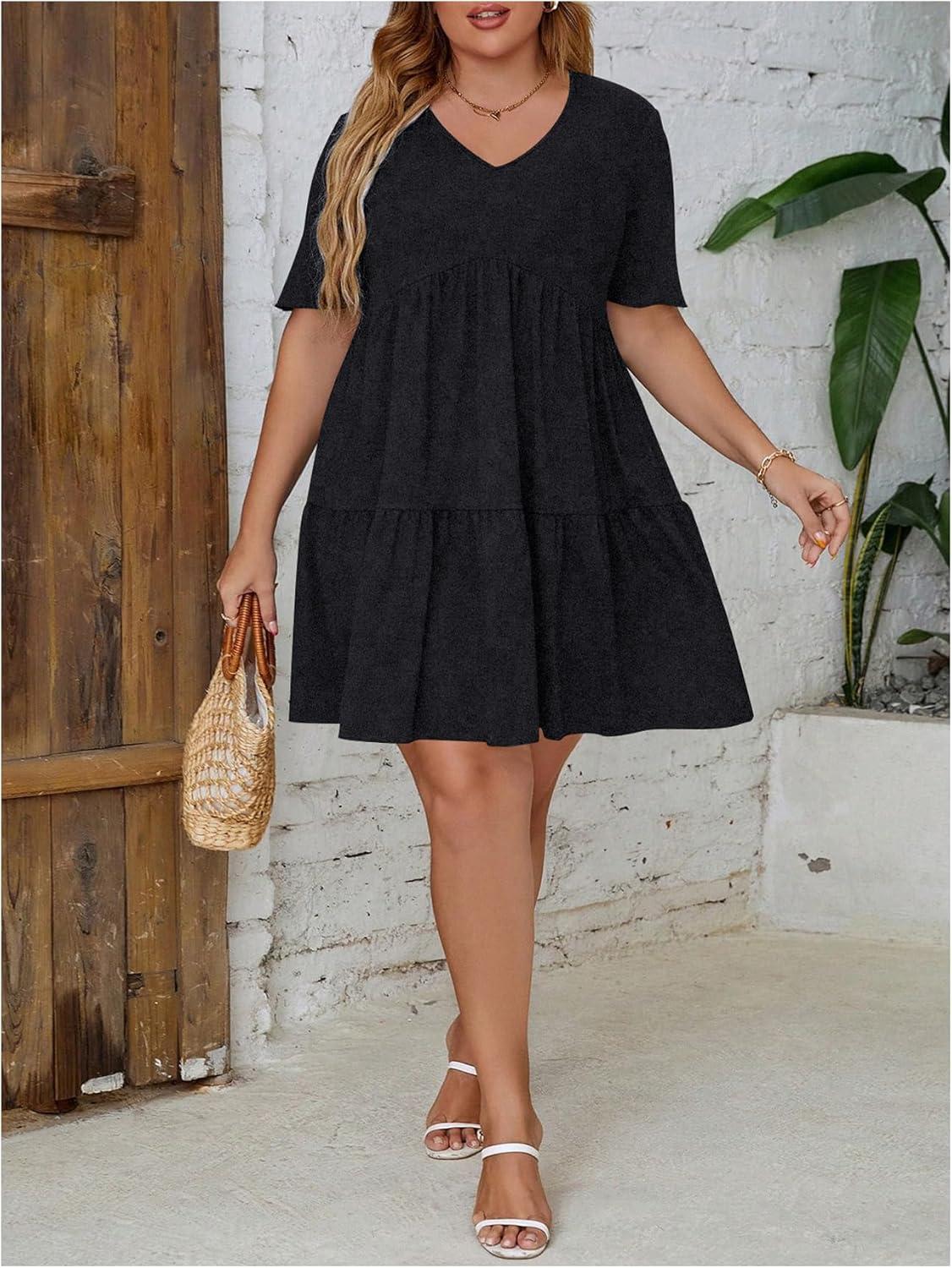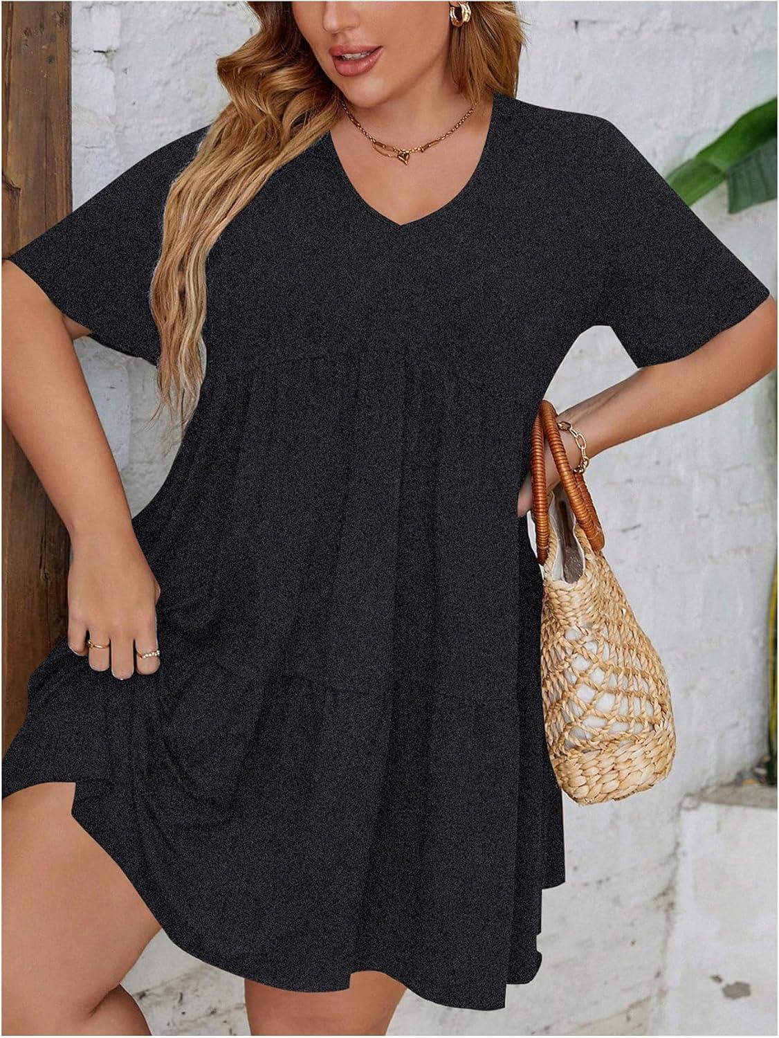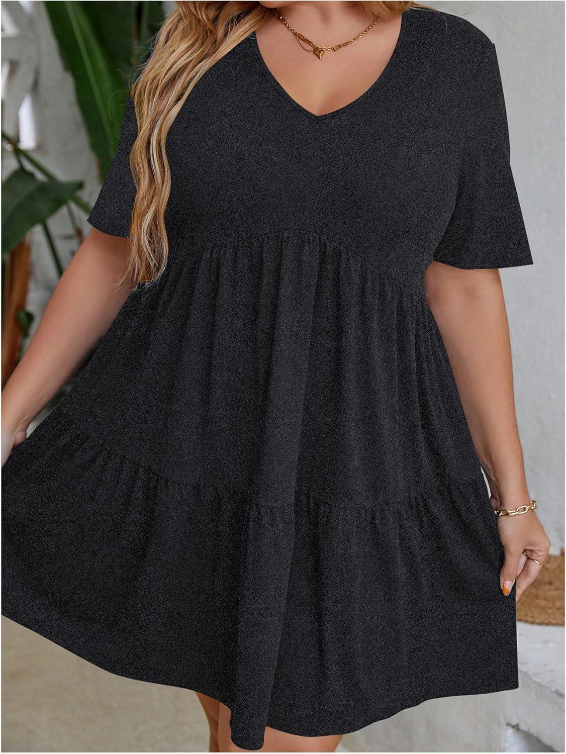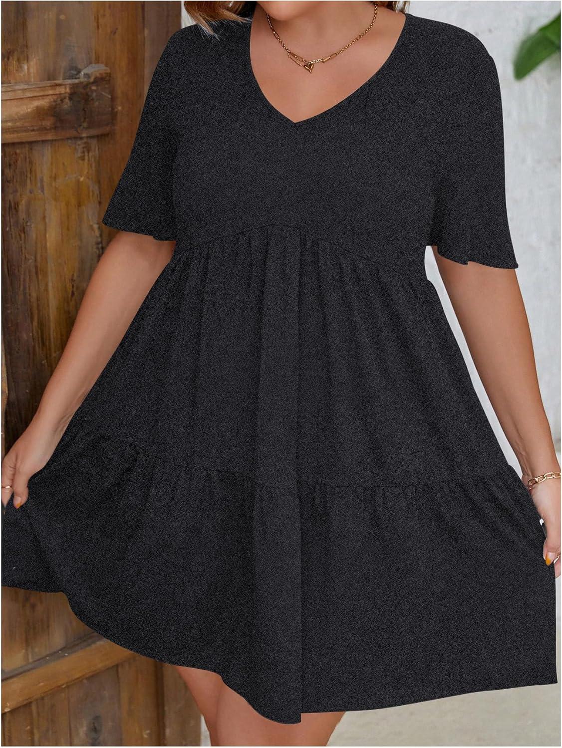 SOLY HUX Women’s Plus Size V Neck Short Sleeve A Line Ruffle Hem Babydoll Flowy Dress(Pure Dark Grey)