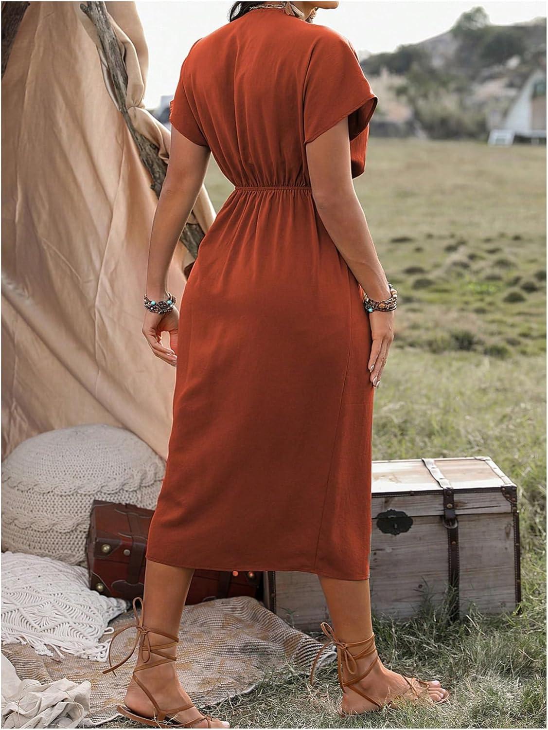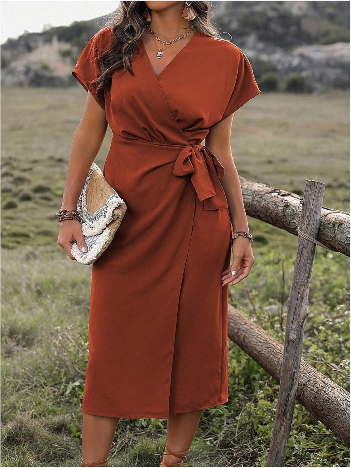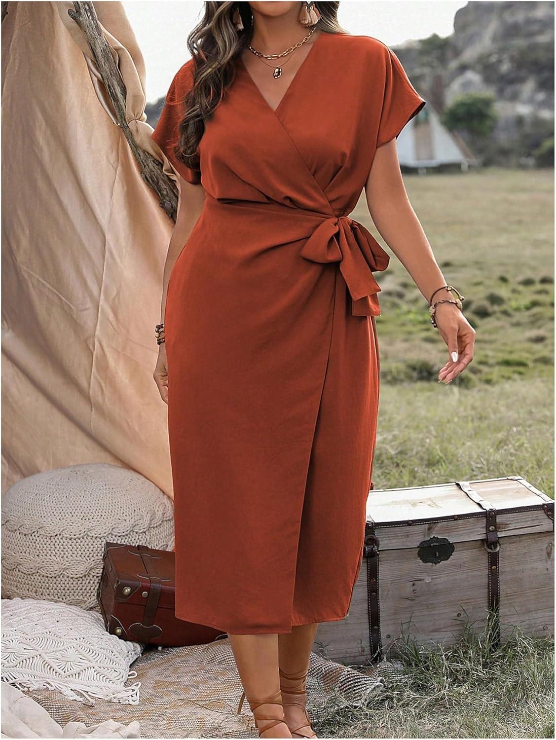 SOLY HUX Women’s Plus Size Wrap V Neck Knot Side Midi Dress Short Sleeve Flowy Party Dresses(Rust Brown)