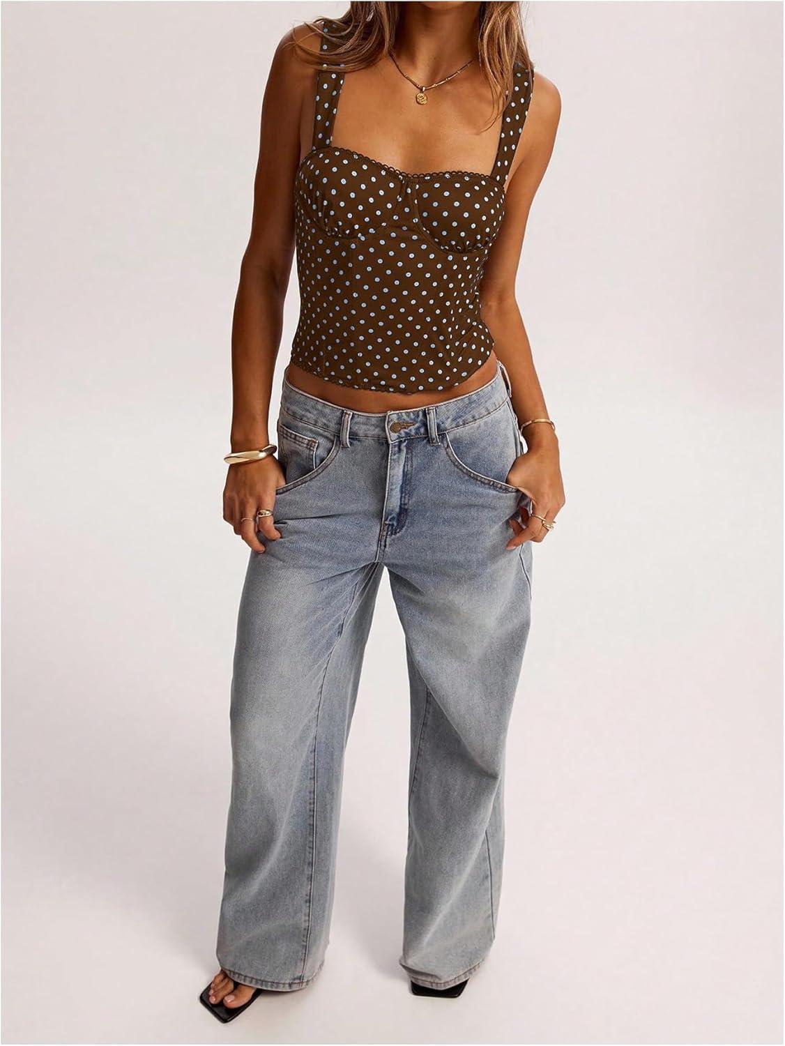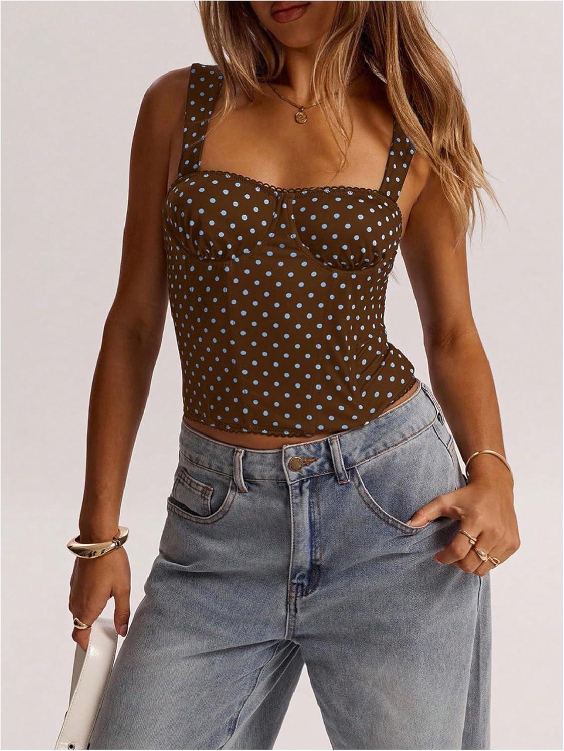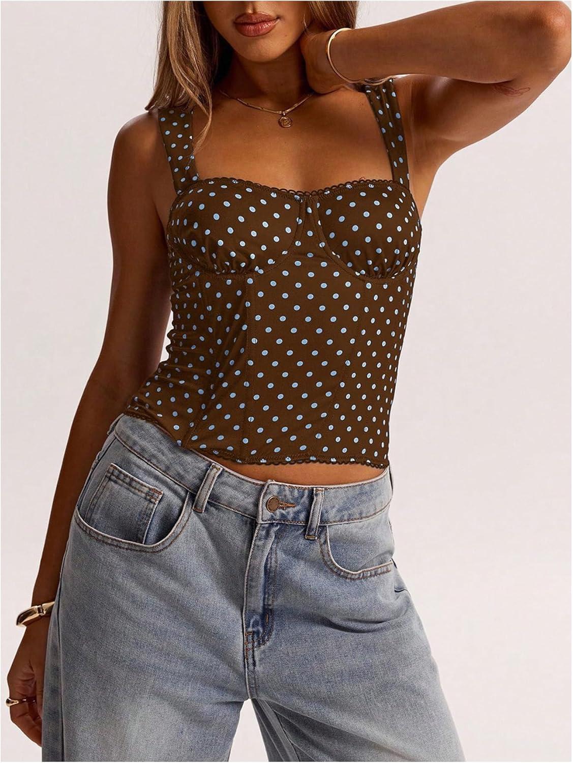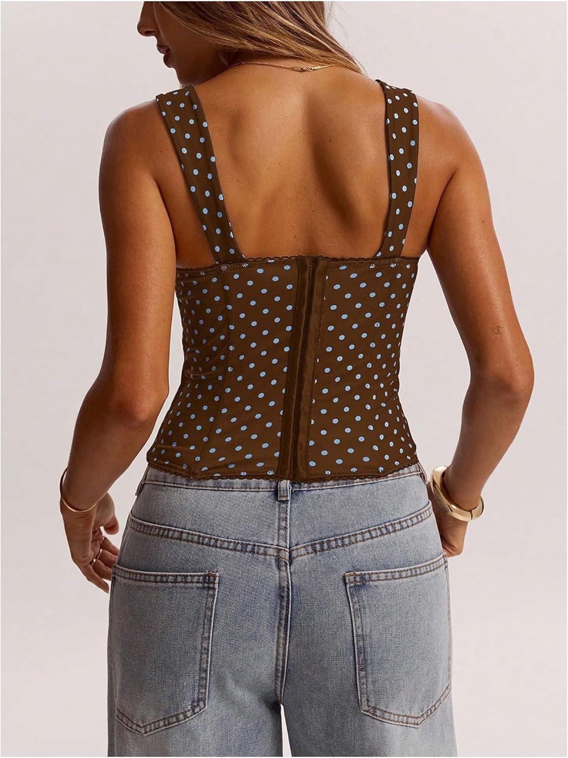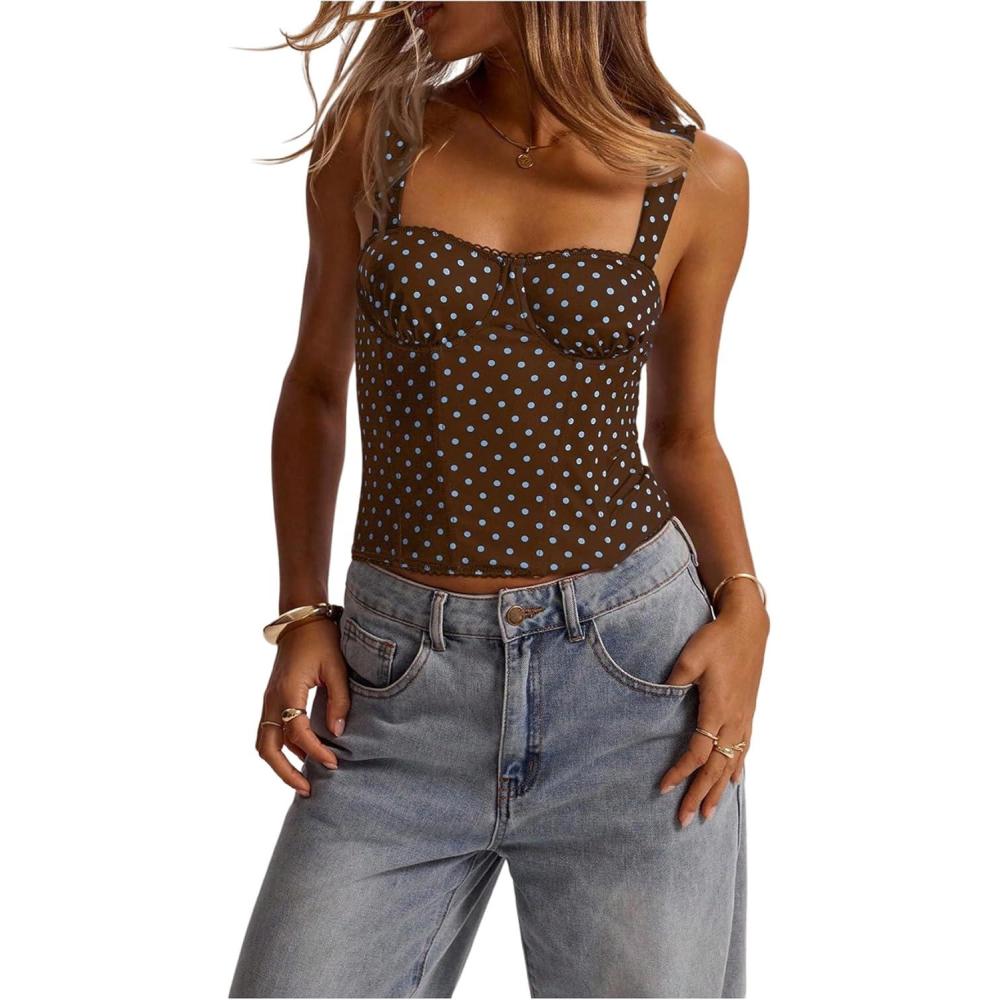 SOLY HUX Women’s Polka Dots Corset Tops Y2k Sleeveless Bustier Going Out Crop Tank Top(Brown and Blue Polka Dots)