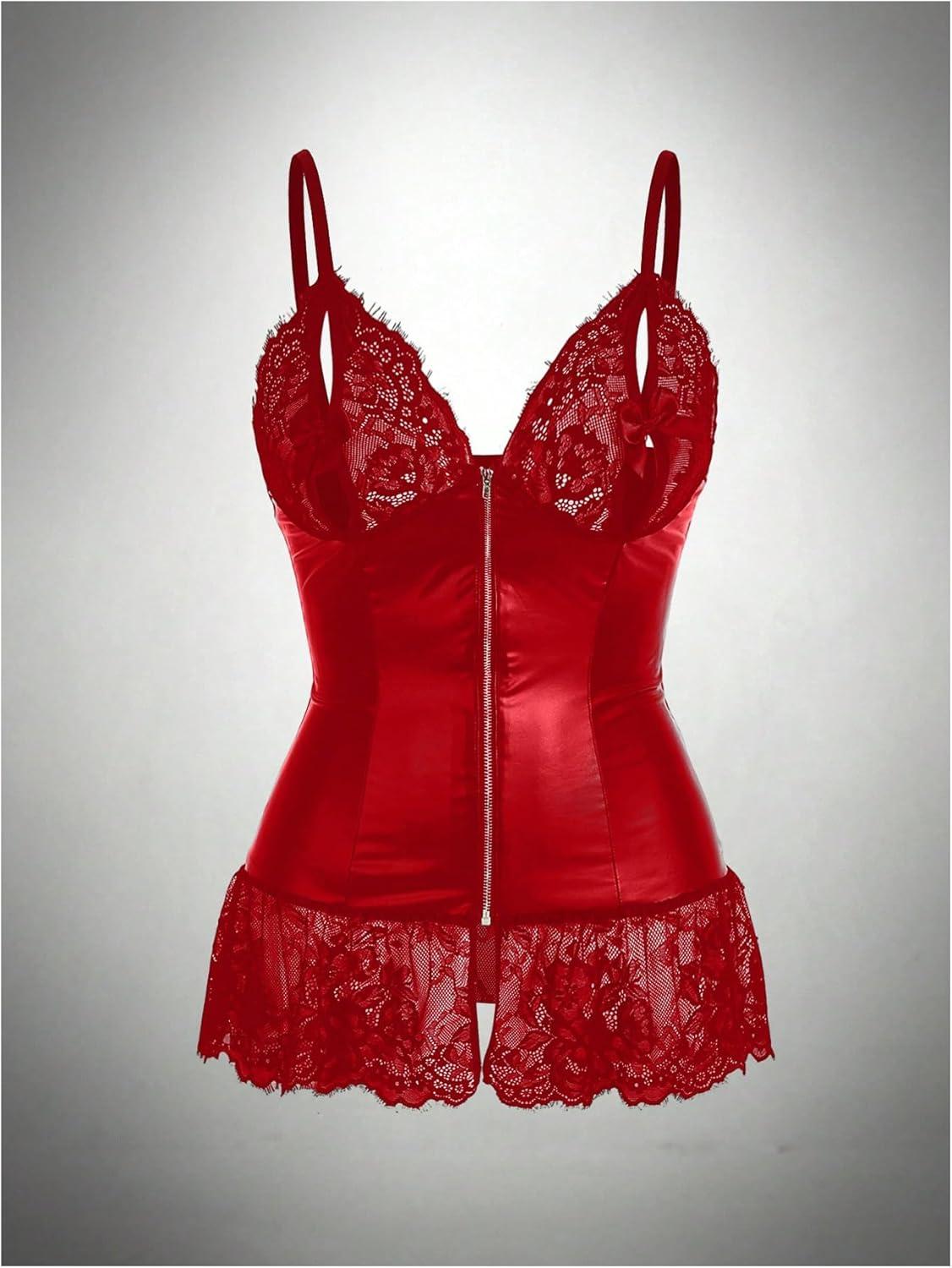 SOLY HUX Women’s PU Leather Sexy Lingerie Lace Zip Up Babydoll Dress with Thong Naughty Outfit Nightwear(Plain Red)
