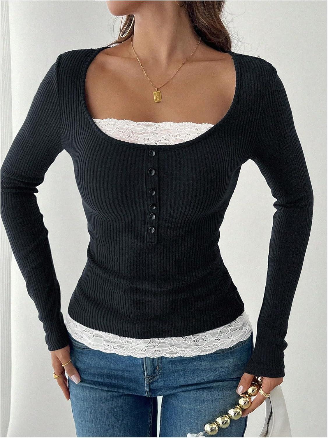 SOLY HUX Women’s Ribbed Scoop Neck Tops Long Sleeve Contrast Lace Button Front Knit Slim Fit Henley T Shirts(Coffee Brown)