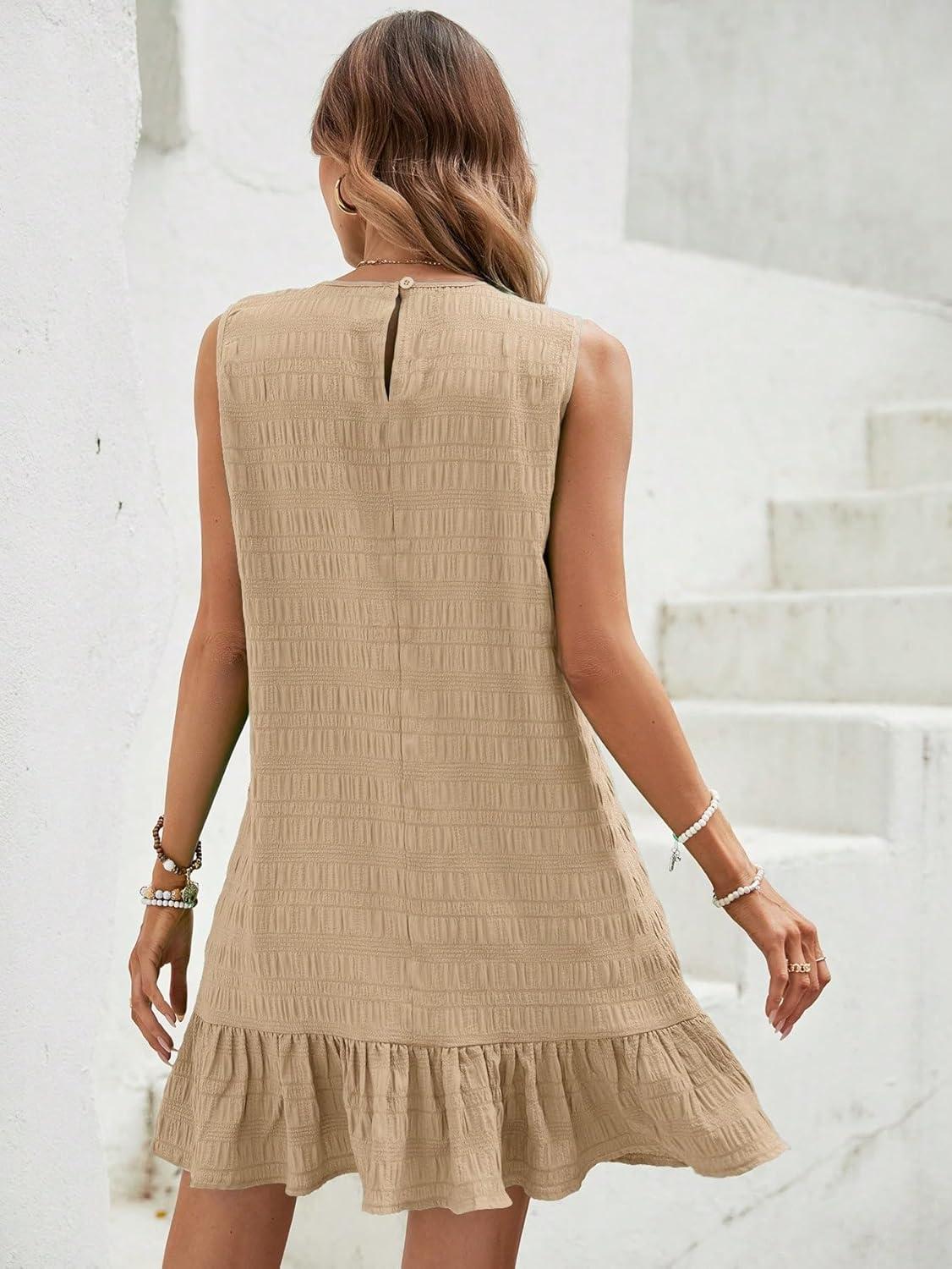 SOLY HUX Women’s Ruffle Hem Sleeveless Tank Dress Round Neck Casual Jacquard Hem Smock Summer Mini Dresses(Solid Beige)