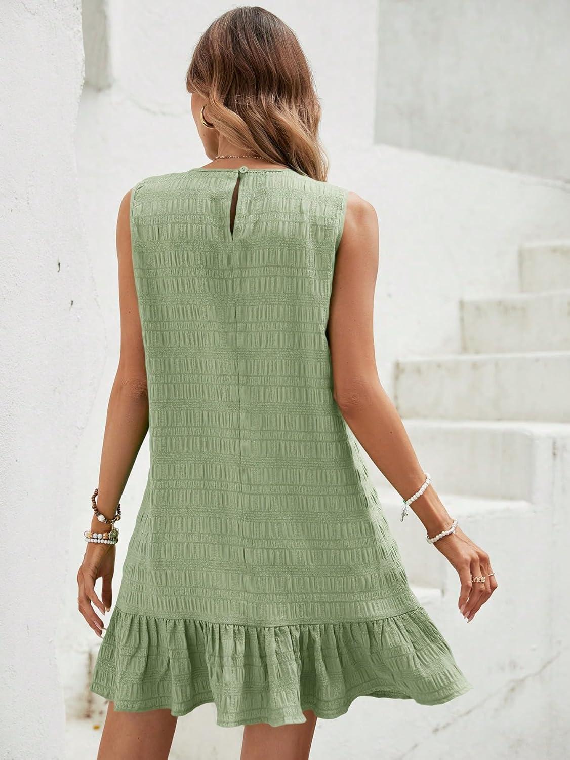 SOLY HUX Women’s Ruffle Hem Sleeveless Tank Dress Round Neck Casual Jacquard Hem Smock Summer Mini Dresses(Plain Green)