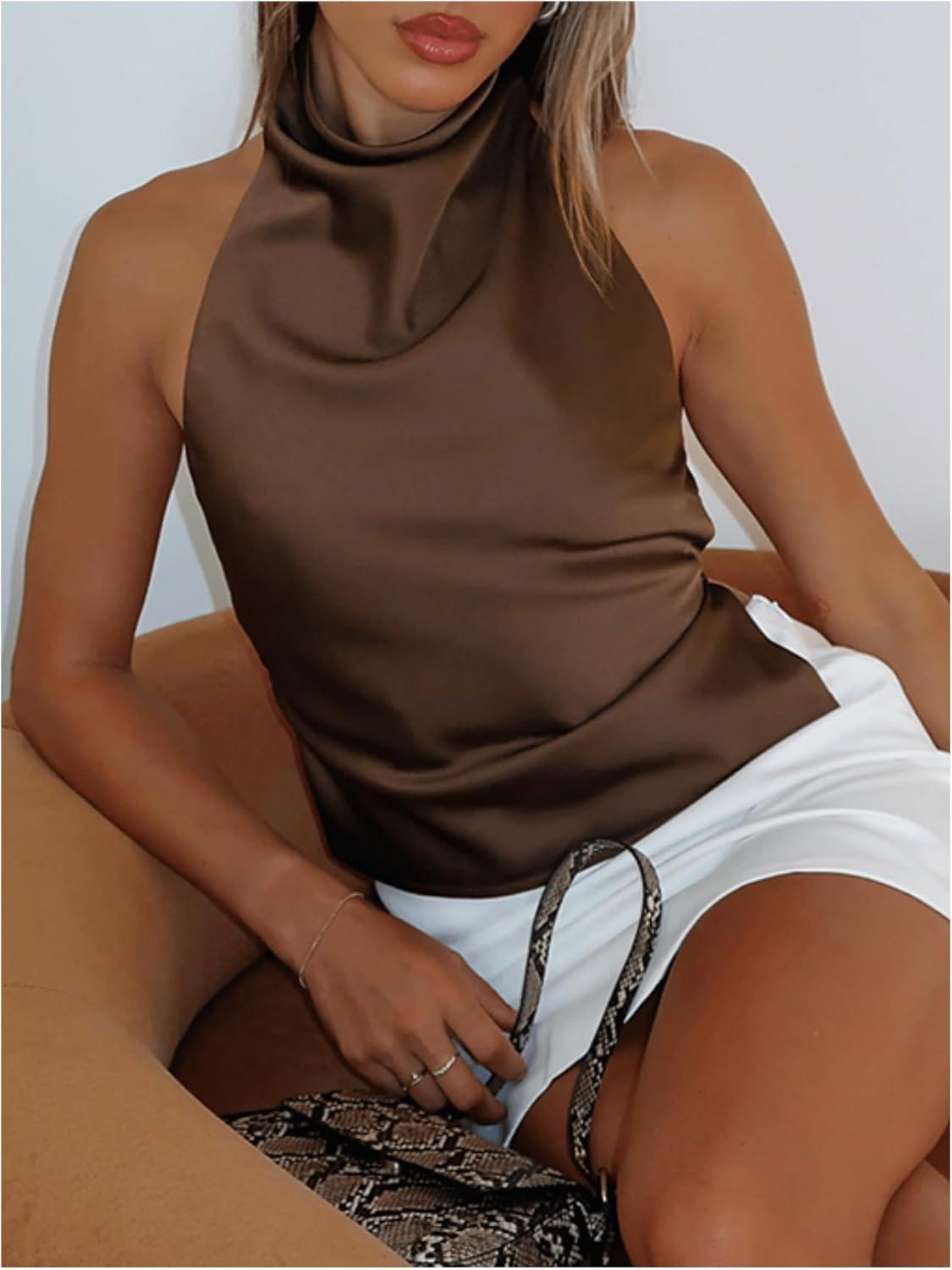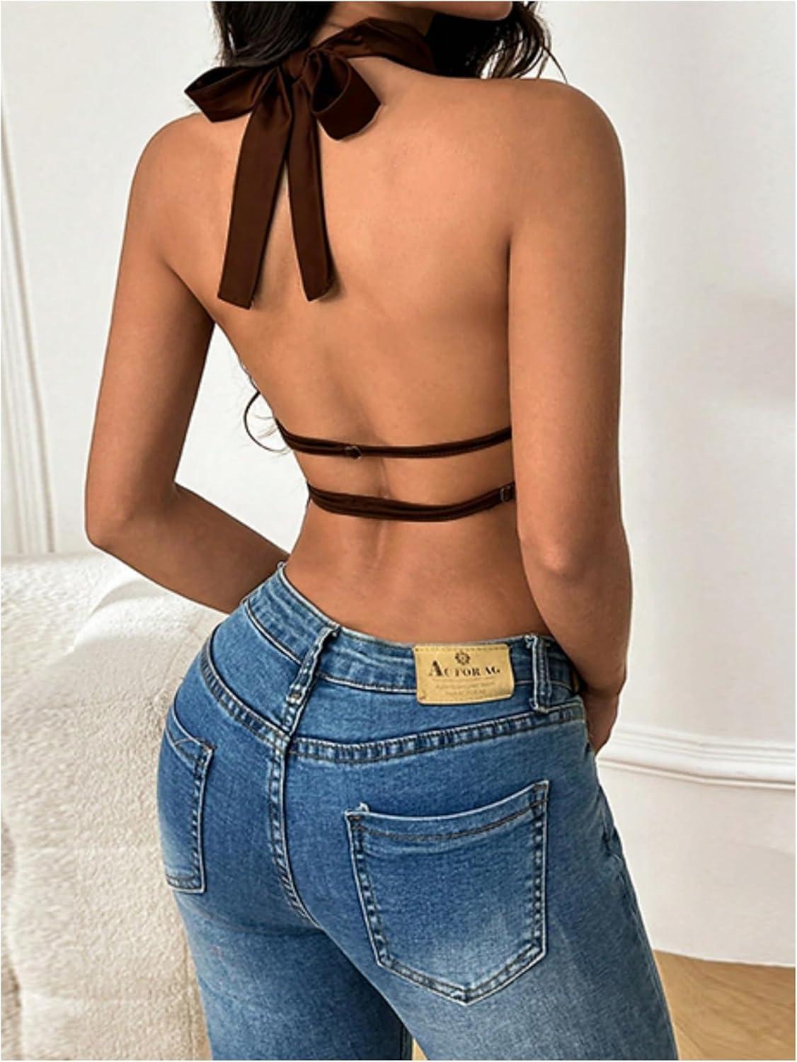 SOLY HUX Women’s Satin Halter Backless Crop Top Sexy Sleeveless Tank Shirts Festival Party Clubwear(Plain Brown)