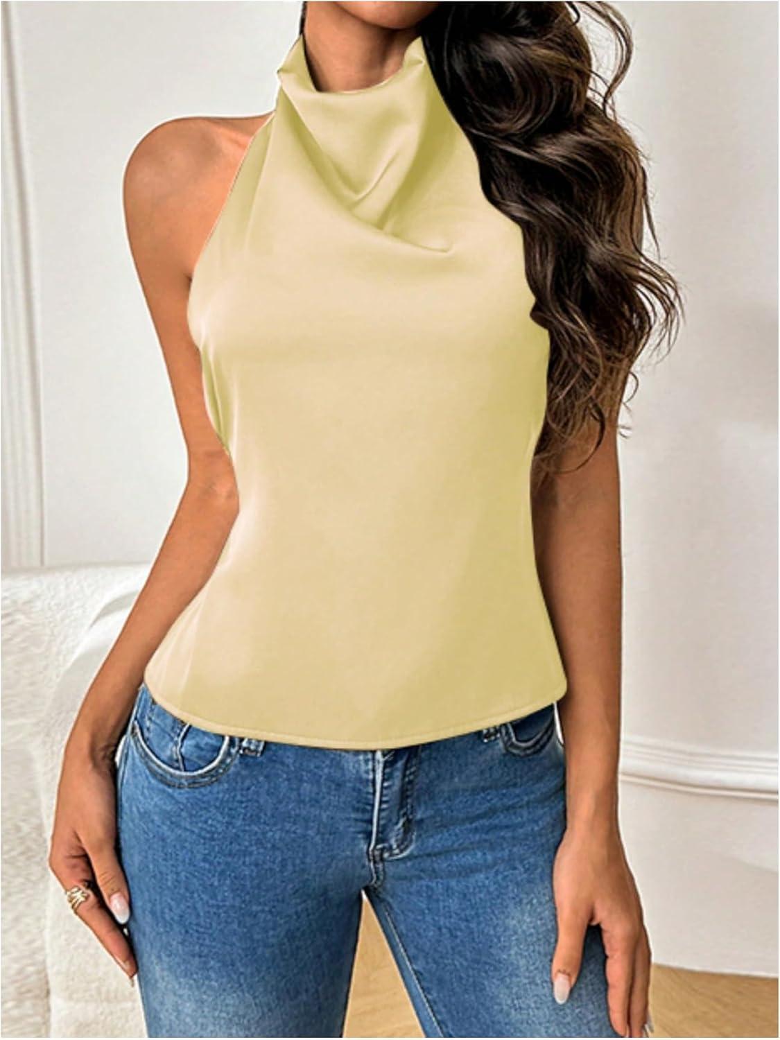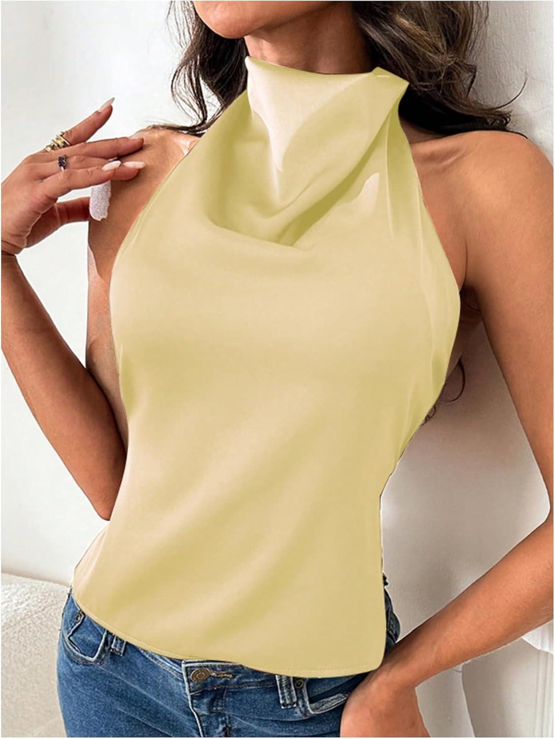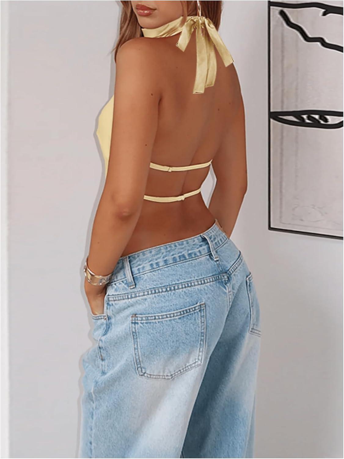 SOLY HUX Women’s Satin Halter Backless Crop Top Sexy Sleeveless Tank Shirts Festival Party Clubwear(Plain Yellow)