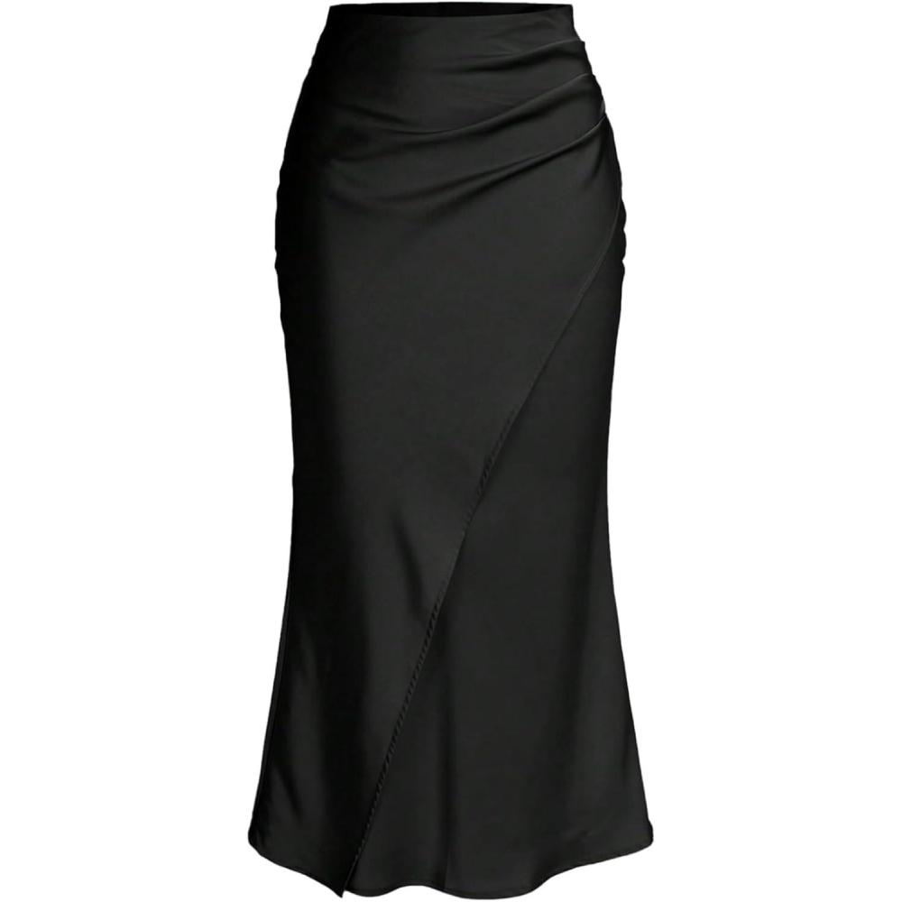 SOLY HUX Women’s Satin Maxi Skirt Elegant Wrap High Waisted Ruched Fishtail Dressy Casual Skirts(Pure Black)