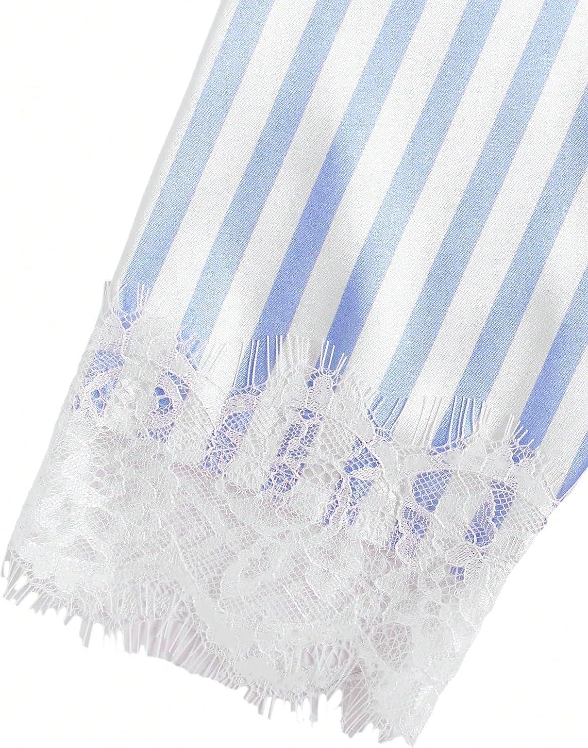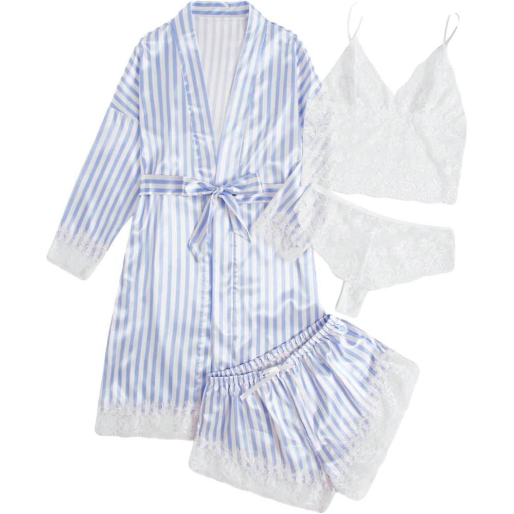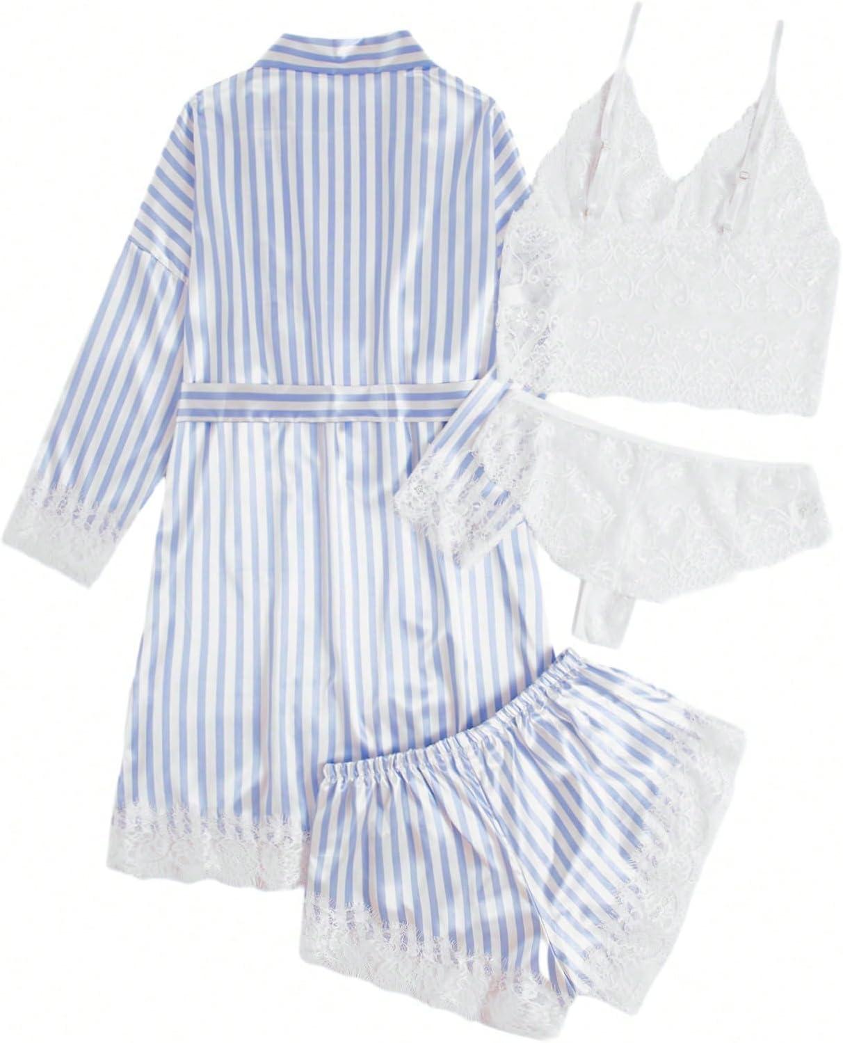 SOLY HUX Women’s Satin Pajama Set 4pcs Floral Lace Trim Cami Lingerie Sleepwear with Robe(Blue Striped)