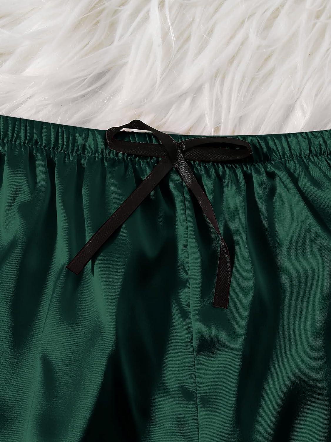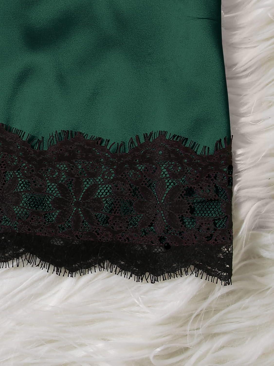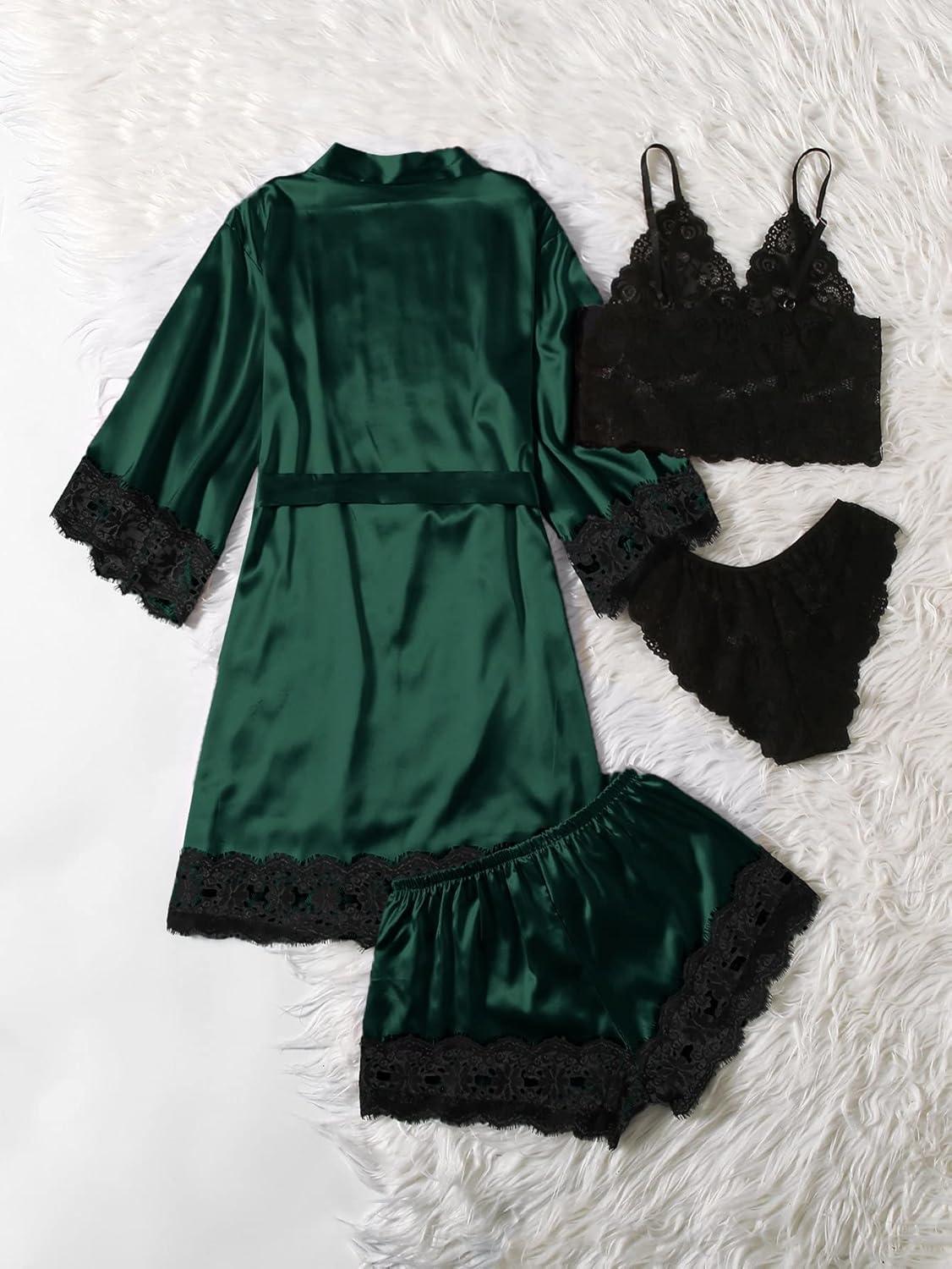 SOLY HUX Women’s Satin Pajama Set 4pcs Floral Lace Trim Cami Lingerie Sleepwear with Robe(Satin Dark Green)