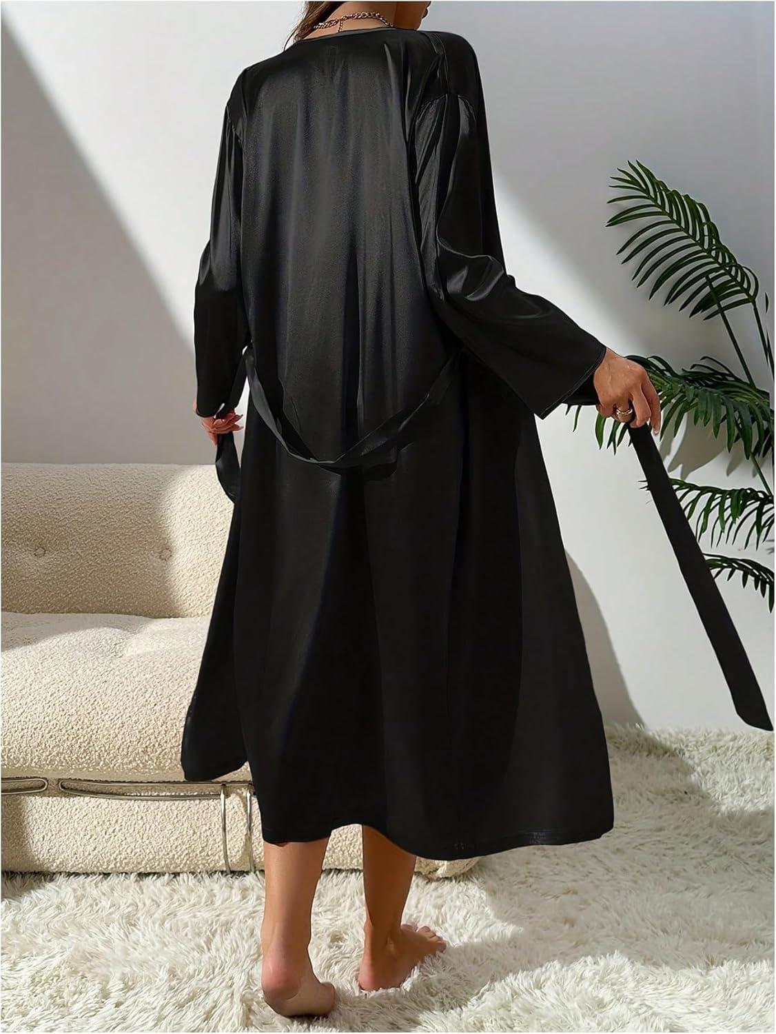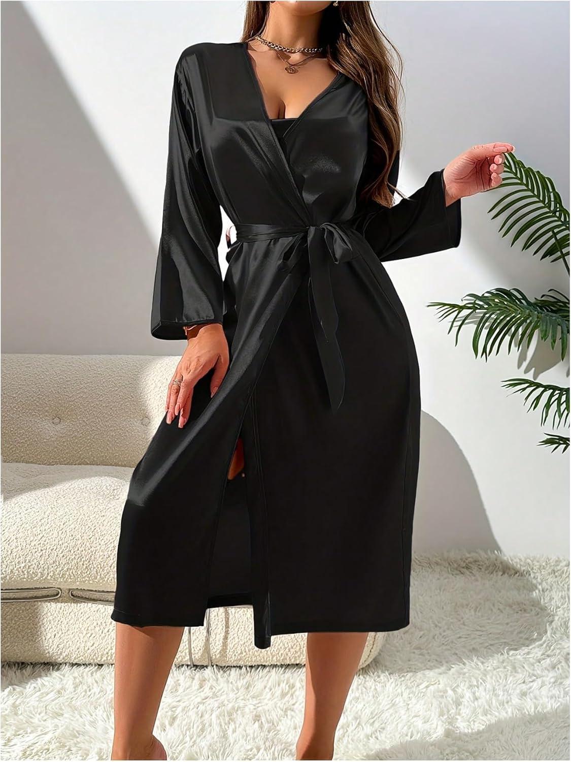 SOLY HUX Women’s Satin Pajama Set Cowl Neck Silk Nightgown Slip Cami Dress with Belted Robe(Pure Black)