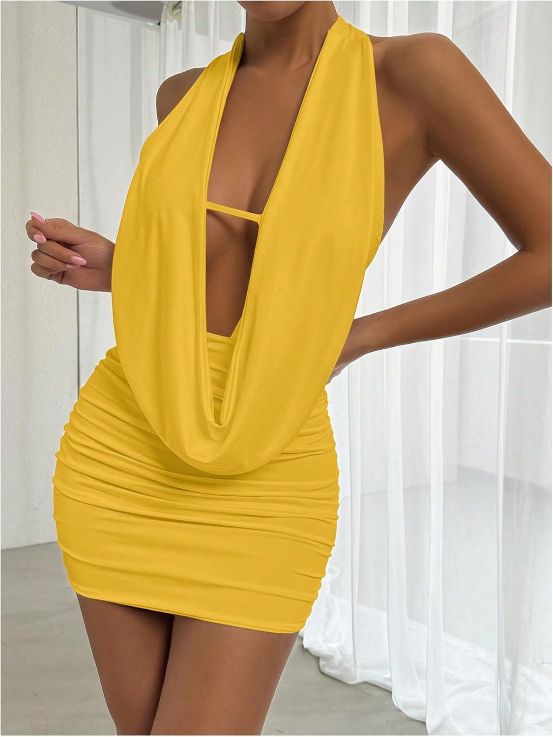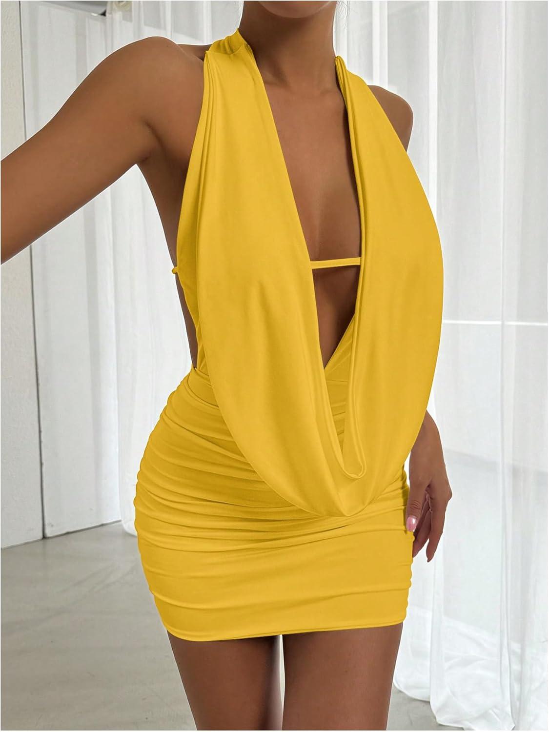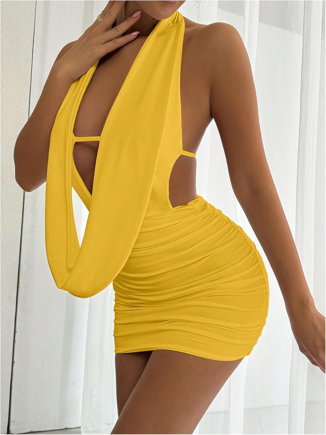 SOLY HUX Women’s Sexy Deep V Neck Halter Bodycon Mini Dress Sleeveless Party Club Dresses(Plain Yellow)