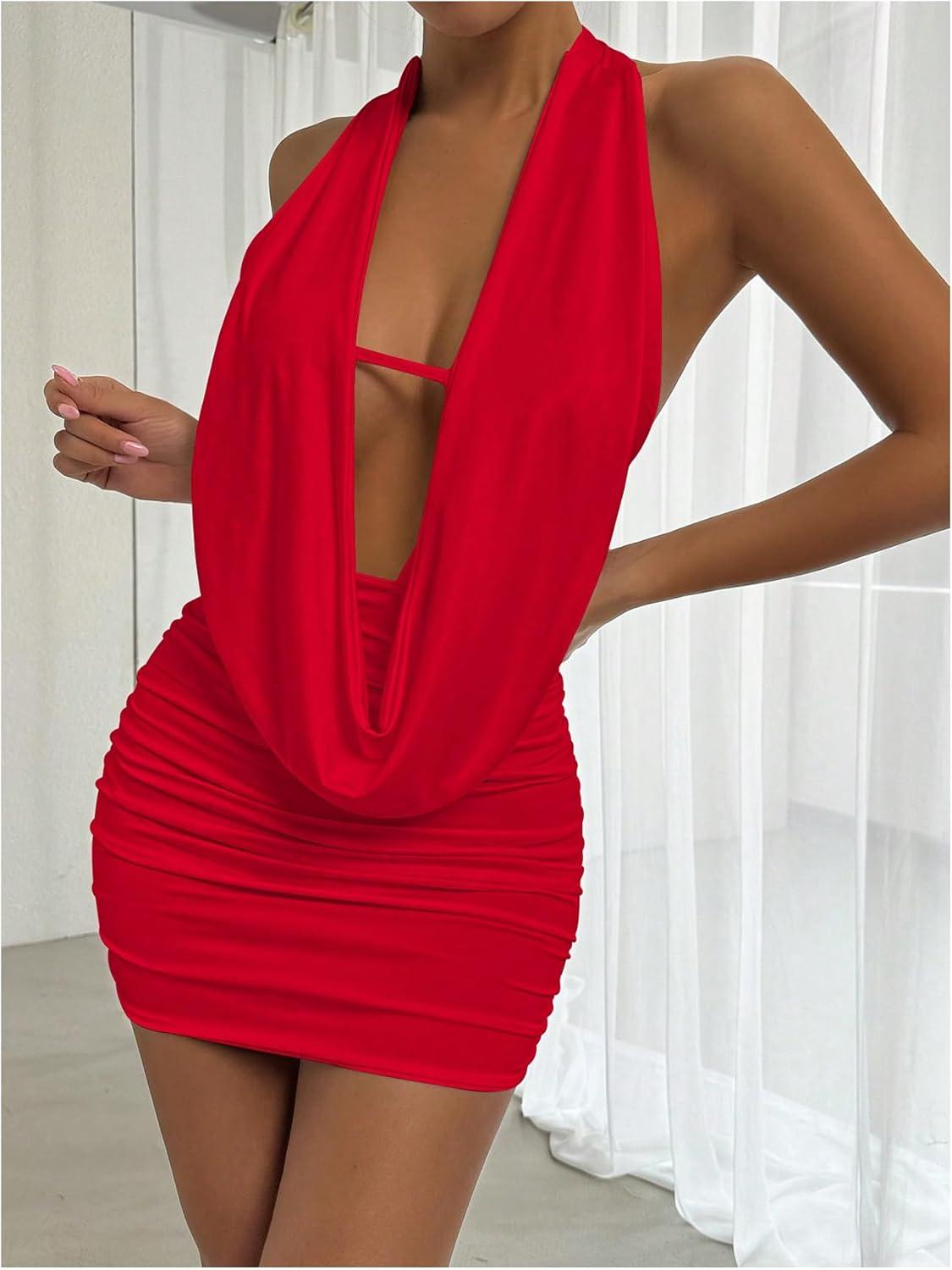 SOLY HUX Women’s Sexy Deep V Neck Halter Bodycon Mini Dress Sleeveless Party Club Dresses(Solid Red)