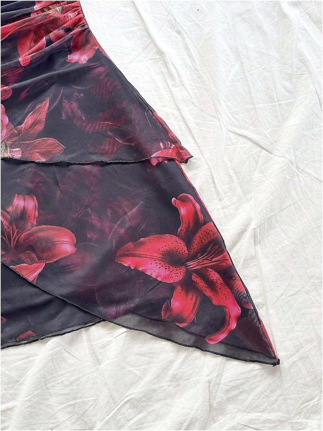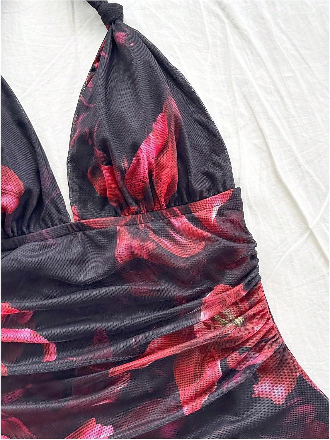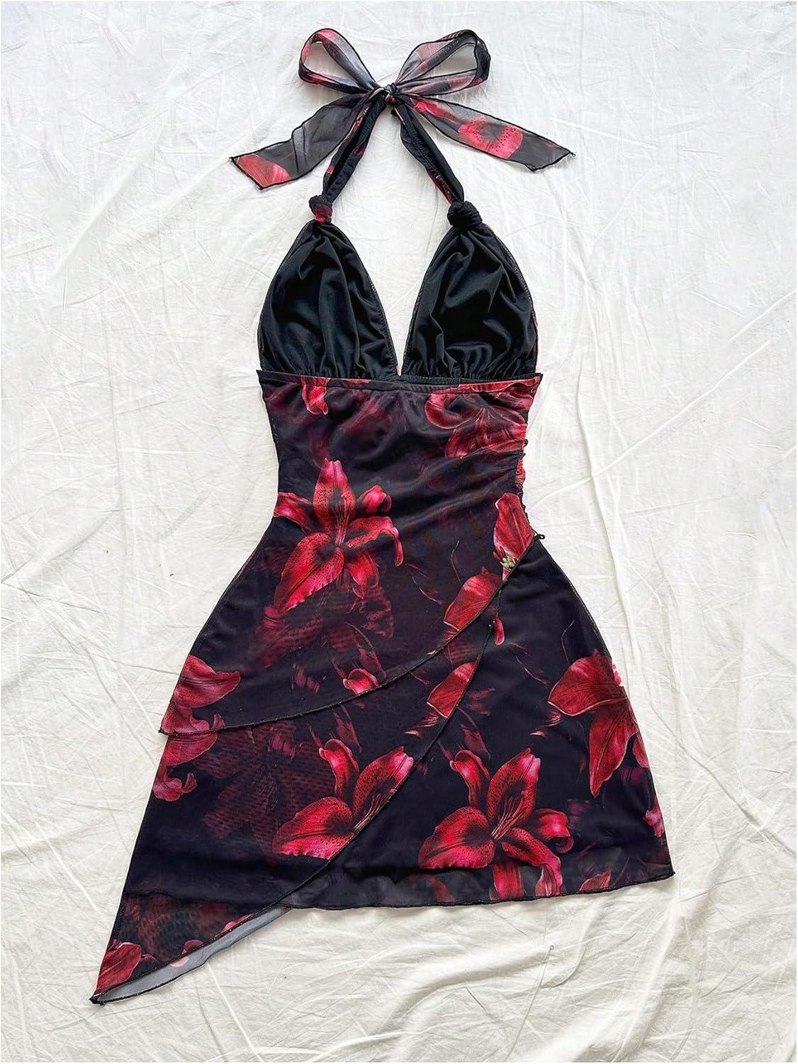 SOLY HUX Women’s Sexy Tie Dye Print Halter V Neck Mini Dress Retro Backless Fitted Bodycon Dresses(Black Floral)