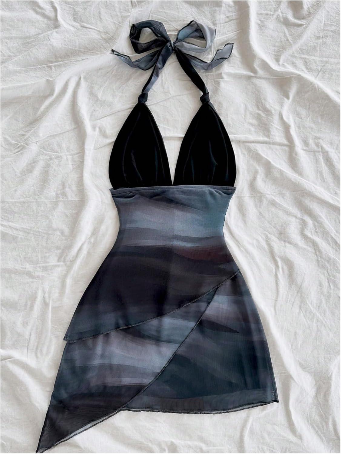 SOLY HUX Women’s Sexy Tie Dye Print Halter V Neck Mini Dress Retro Backless Fitted Bodycon Dresses(Blue Multi)