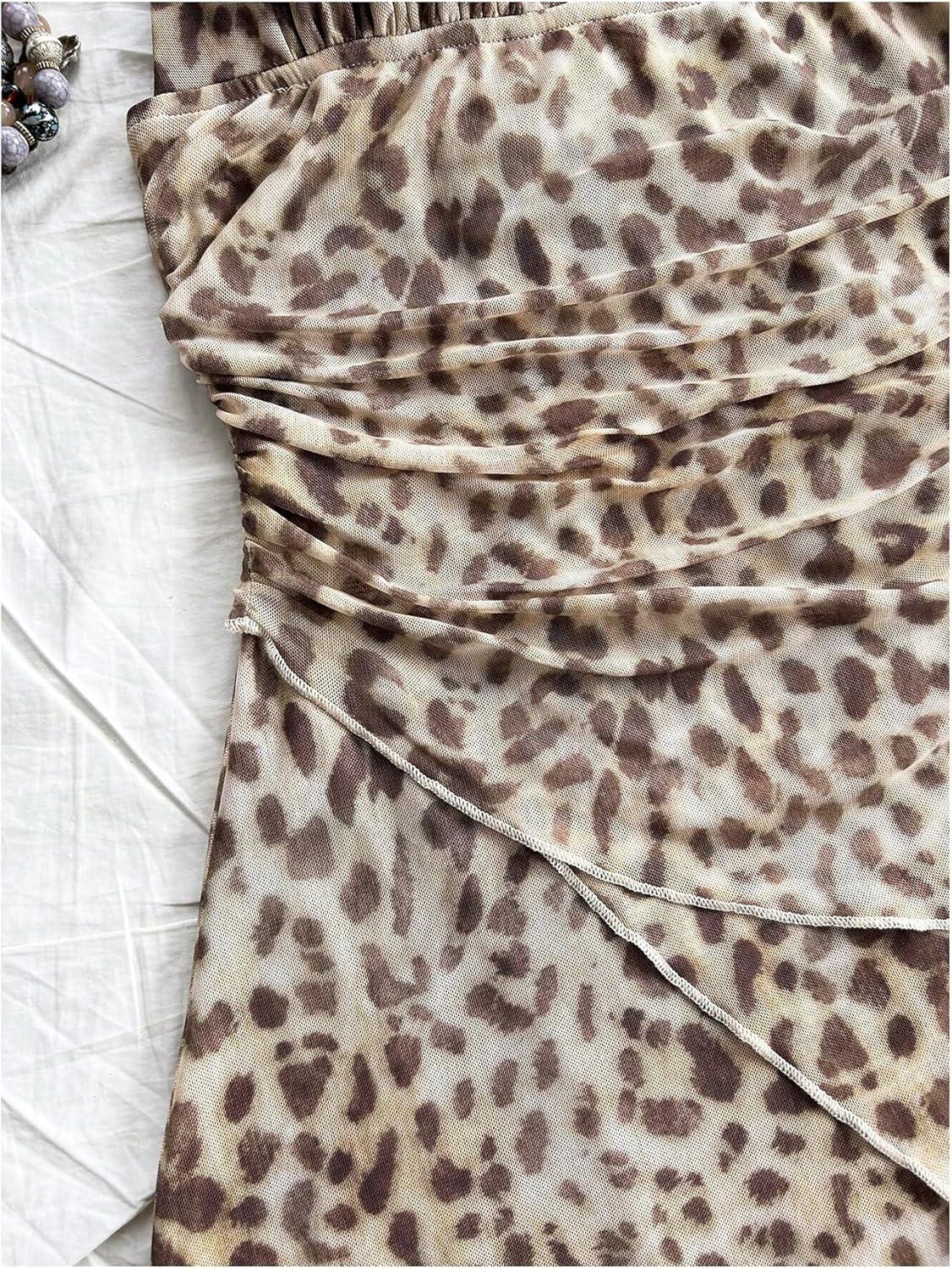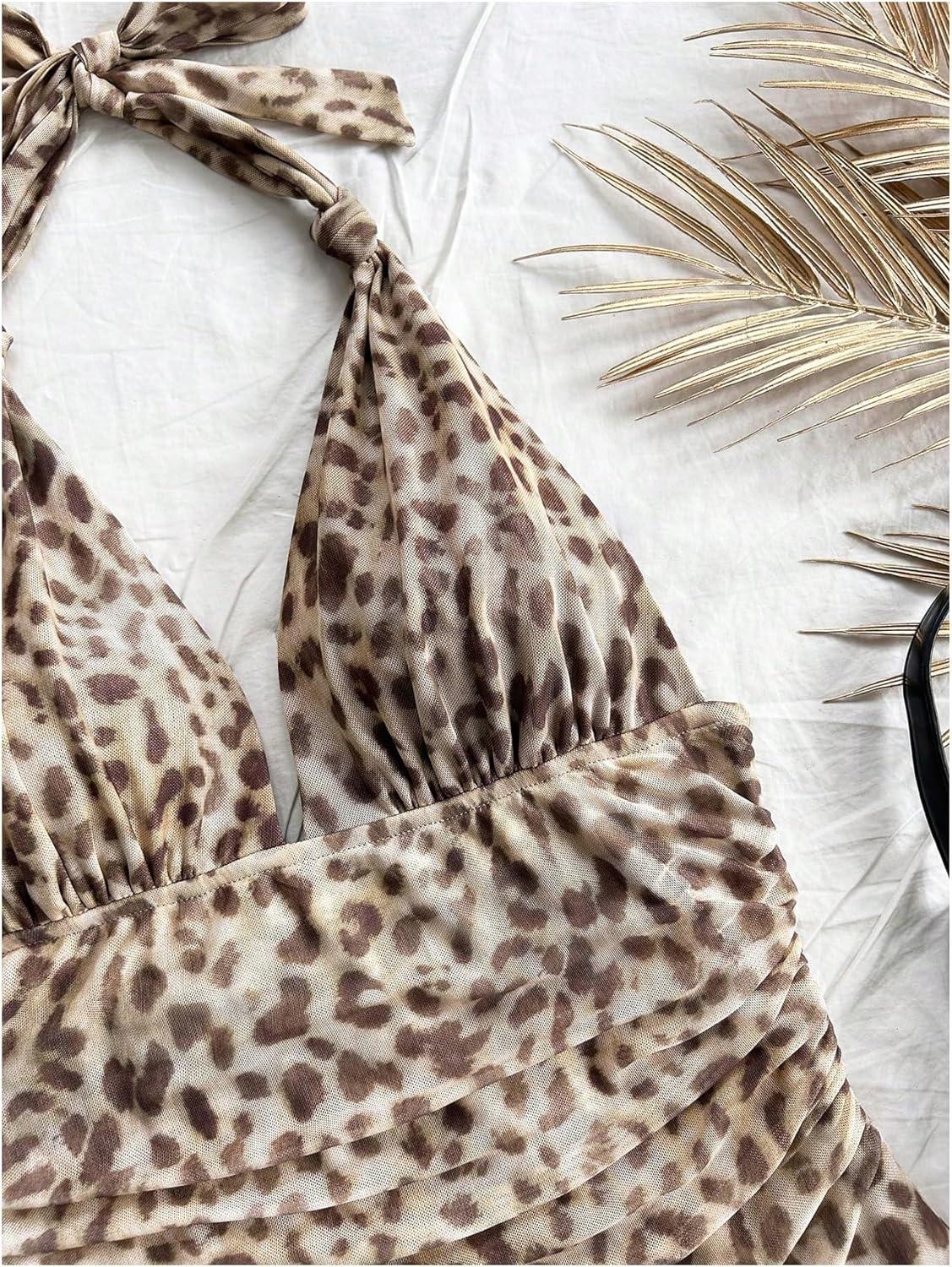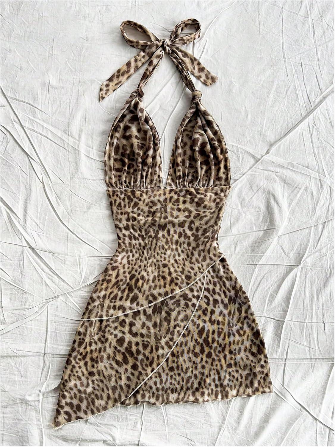 SOLY HUX Women’s Sexy Tie Dye Print Halter V Neck Mini Dress Retro Backless Fitted Bodycon Dresses(Brown Leopard)
