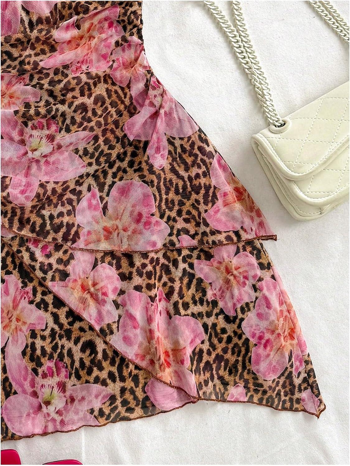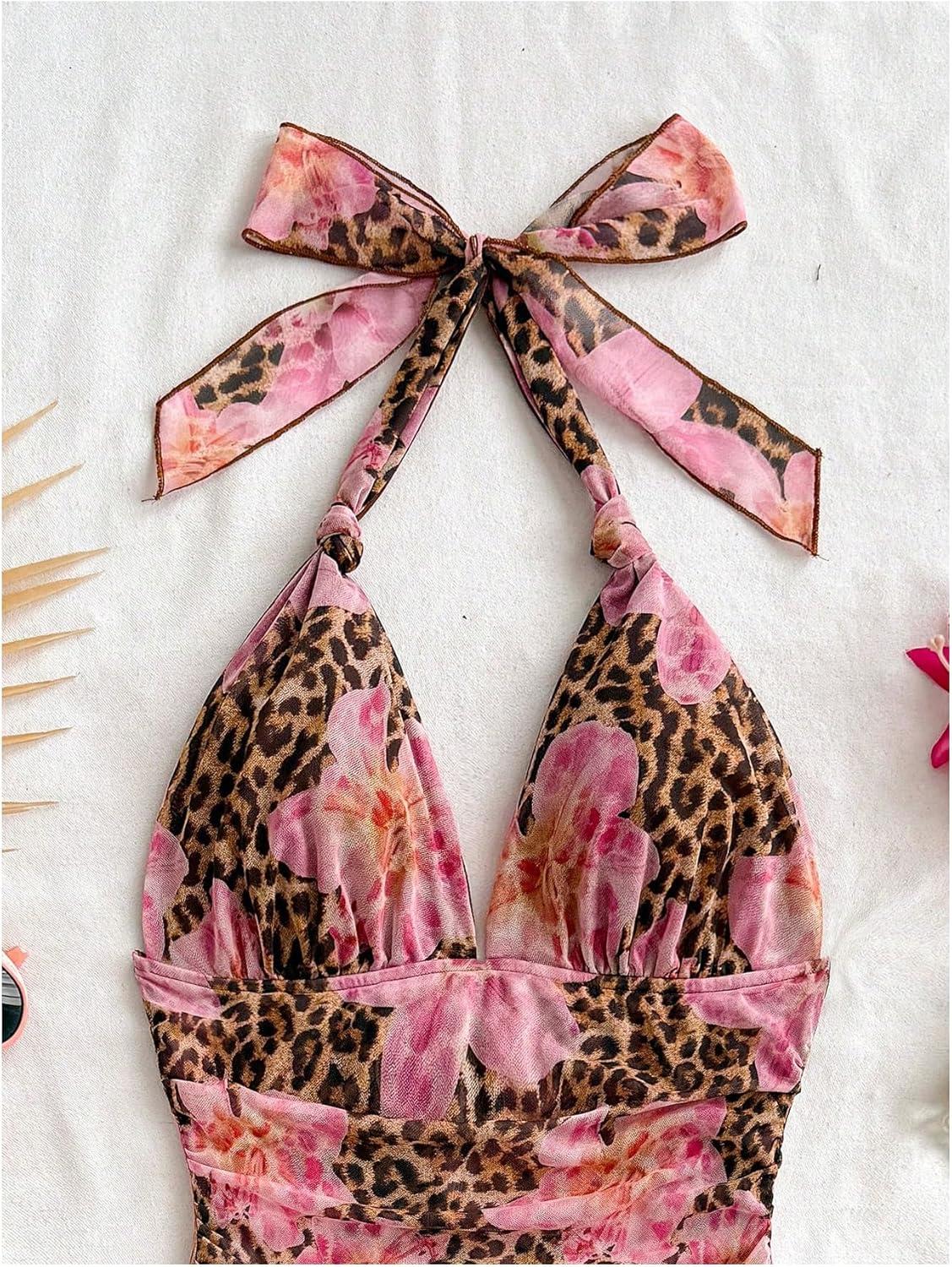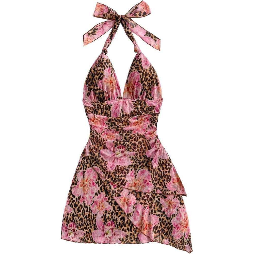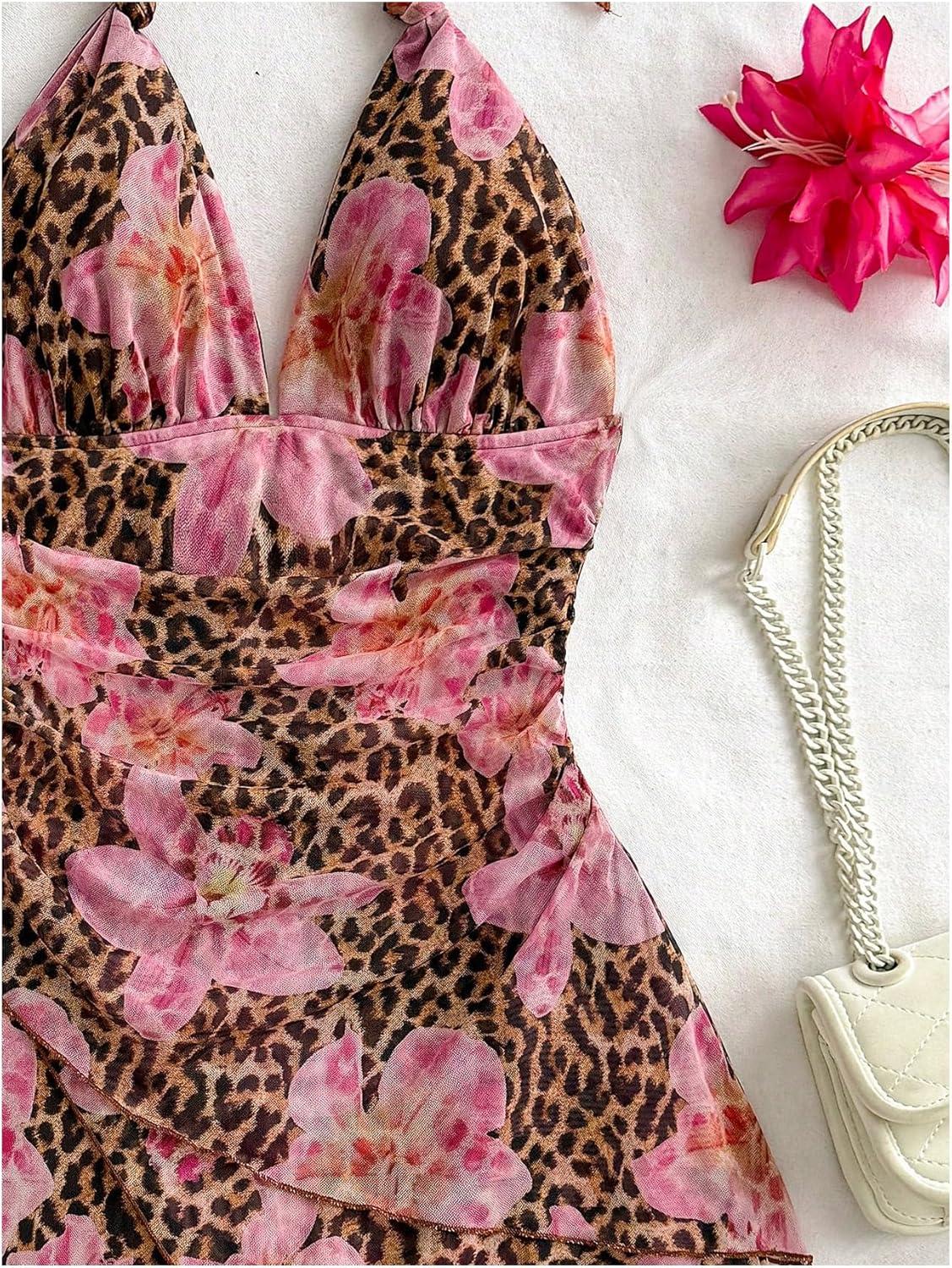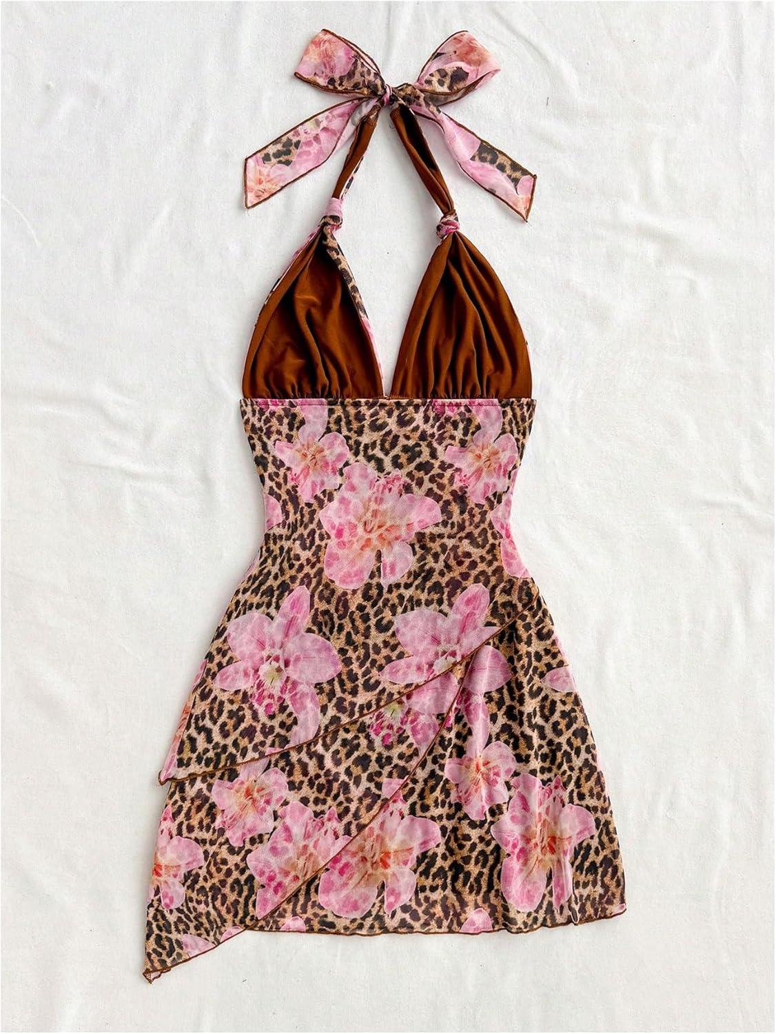 SOLY HUX Women’s Sexy Tie Dye Print Halter V Neck Mini Dress Retro Backless Fitted Bodycon Dresses(Khaki Leopard)