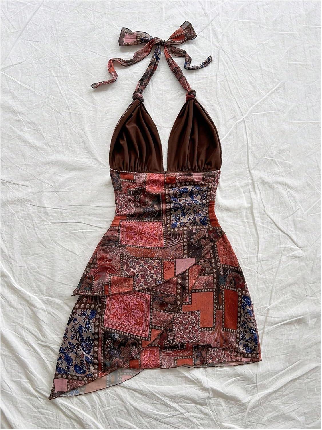 image:imageSOLY HUX Womens Sexy Tie Dye Print Halter V Neck Mini Dress Retro Backless Fitted Bodycon DressesBurgundy Leopard