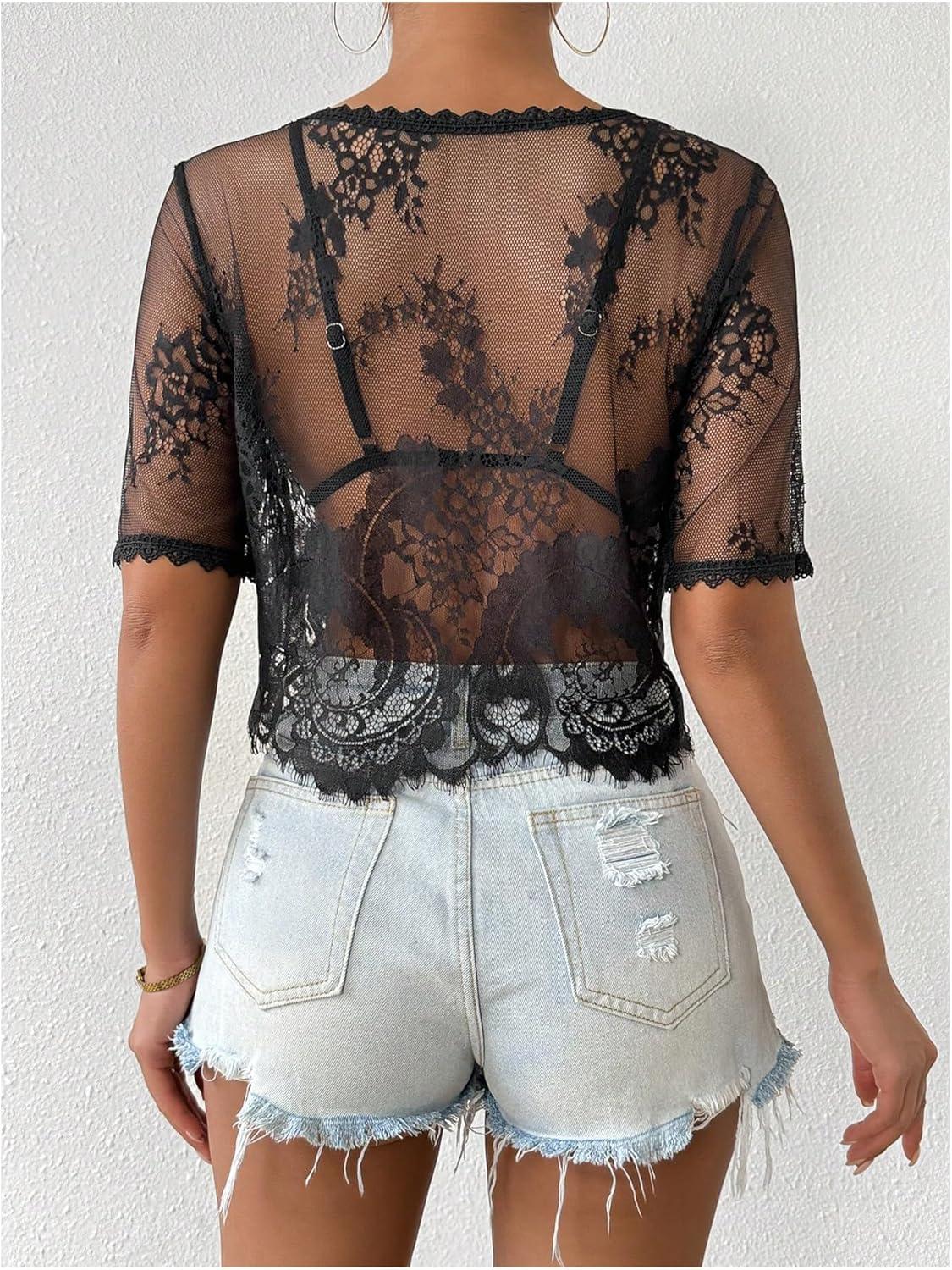 SOLY HUX Women’s Sheer Mesh Crop Top Lace Short Sleeve Crew Neck See Through Tshirts Summer Outfits(Black Sheer)