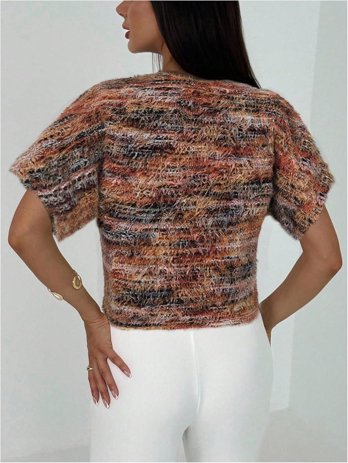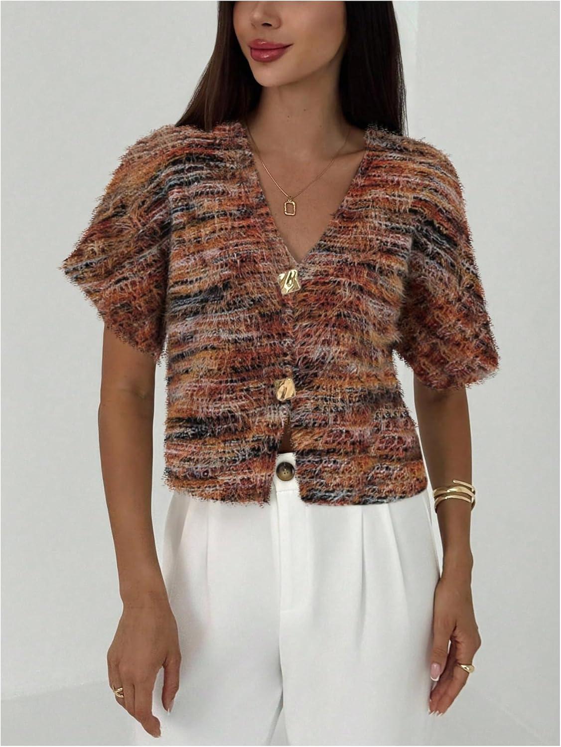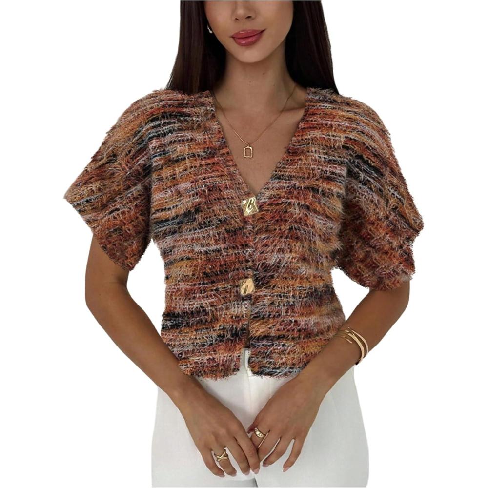 SOLY HUX Women’s Short Sleeve Office Spring Winter Cardigan Sweater Button Down V Neck Slim Fit Elegant Knit Tops(Brown Multi)