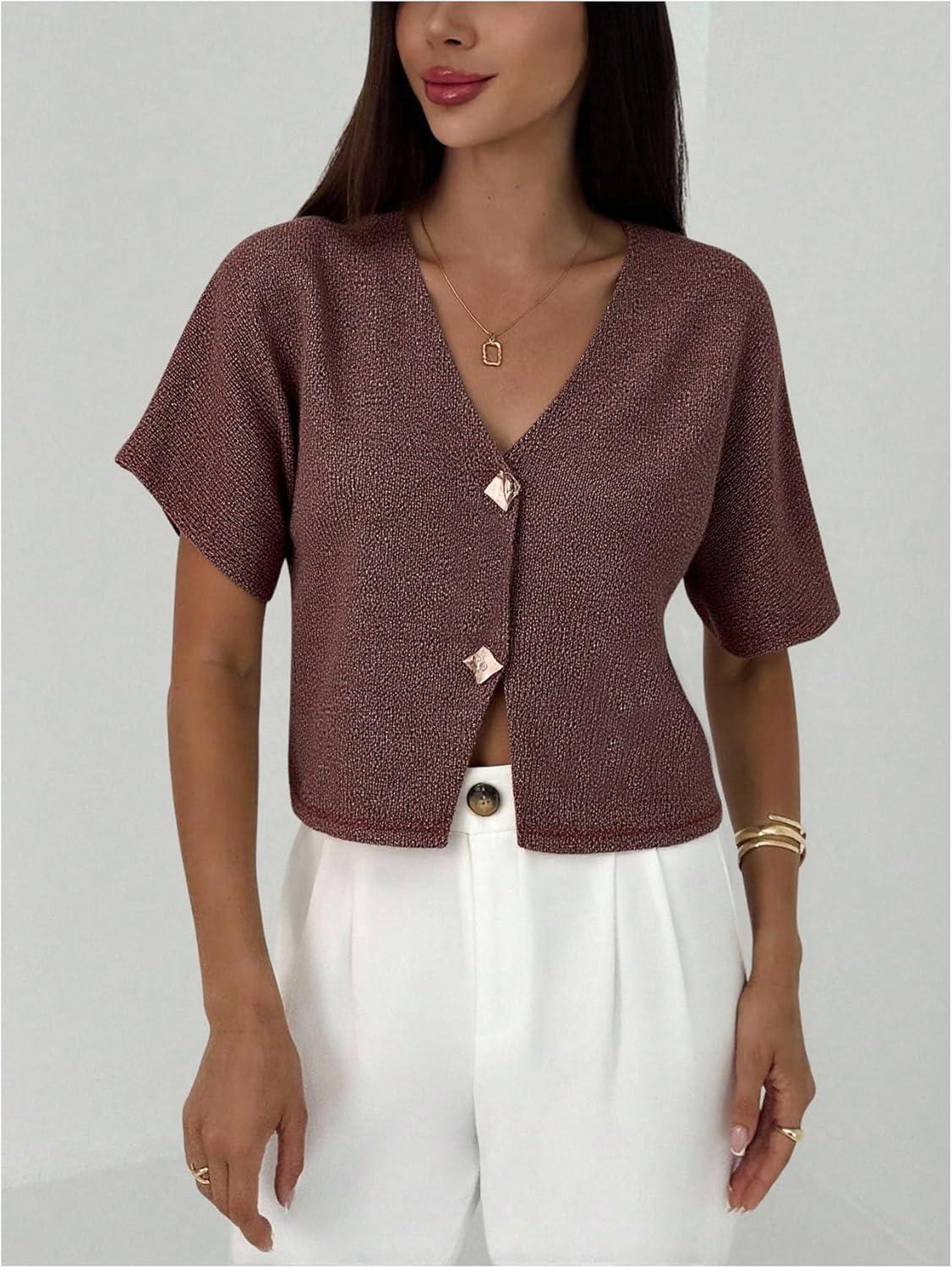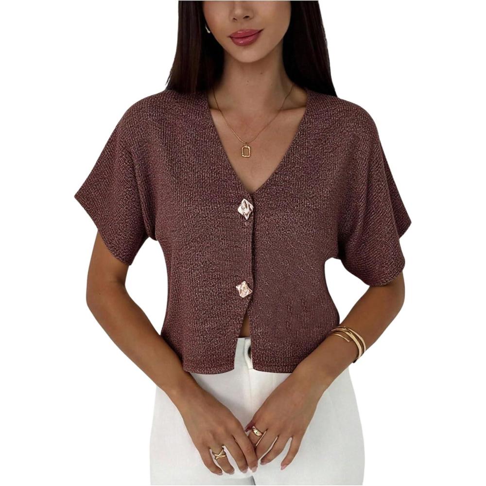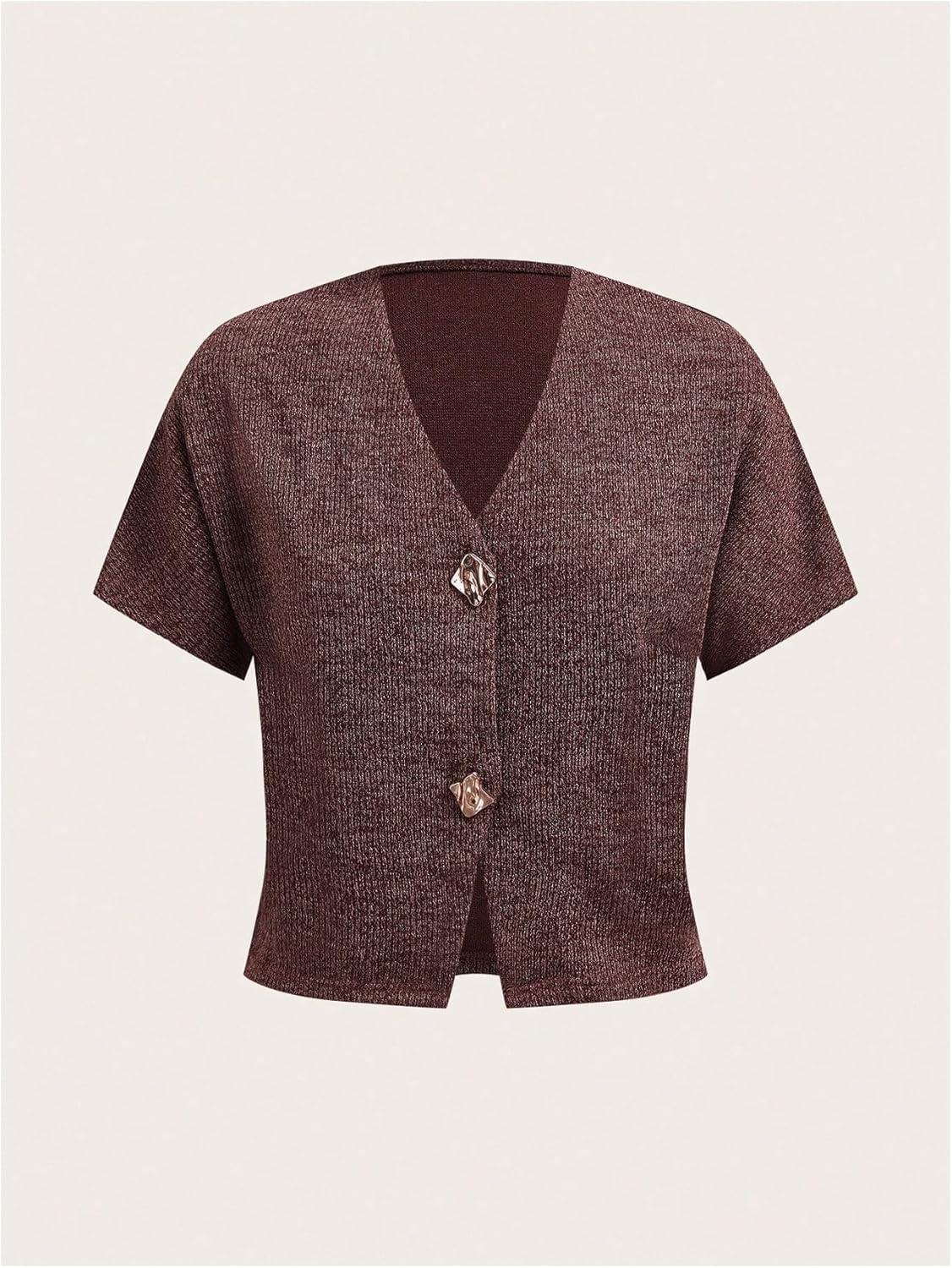SOLY HUX Women’s Short Sleeve Office Spring Winter Cardigan Sweater Button Down V Neck Slim Fit Elegant Knit Tops(Pure Brown)