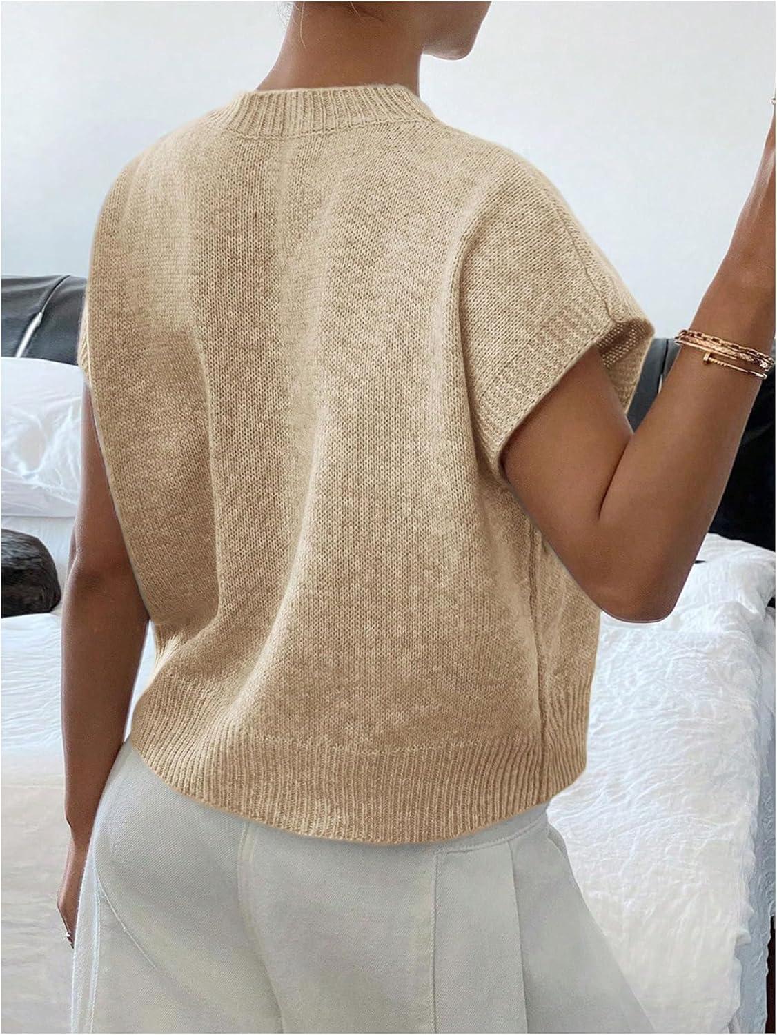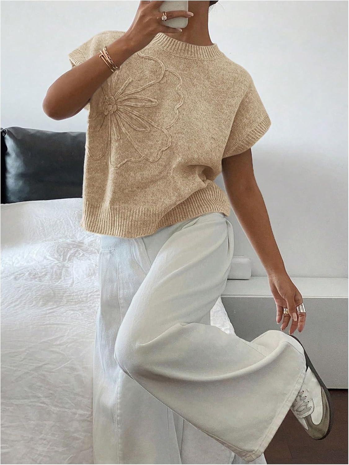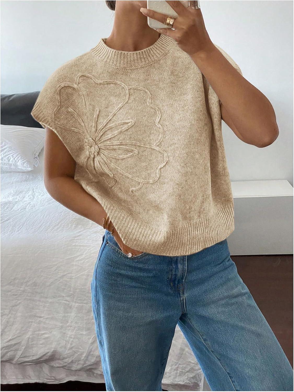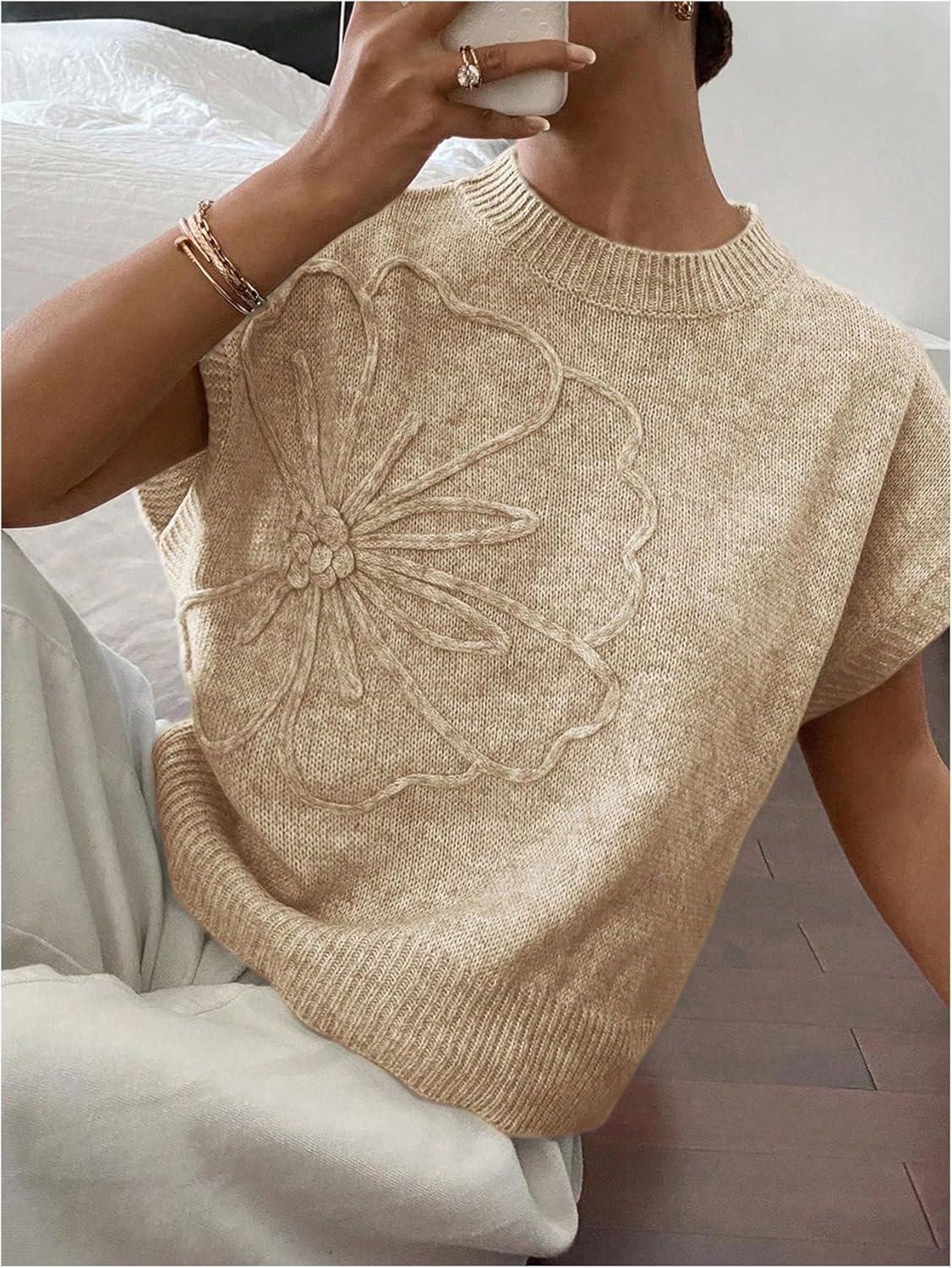 SOLY HUX Women’s Short Sleeve Sweater 3D Floral Sweaters Pullover Tank Tops Knit Vest Trendy Fashion Clothing(Beige Floral)