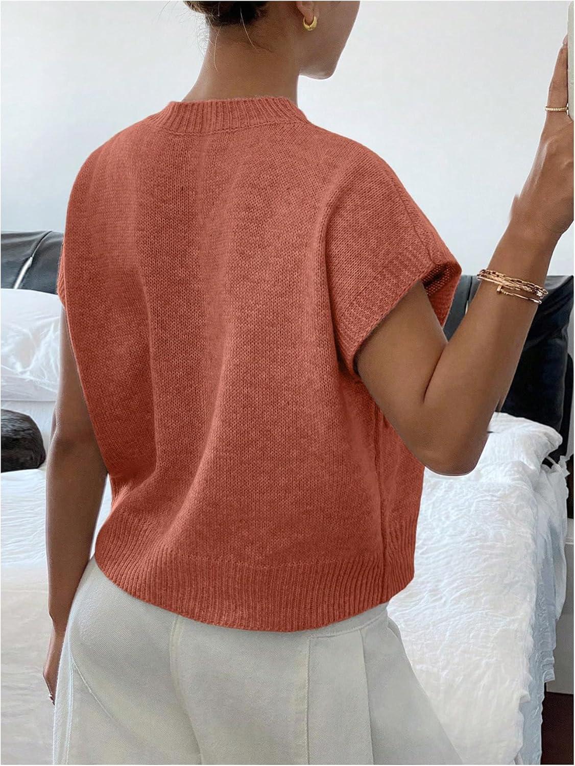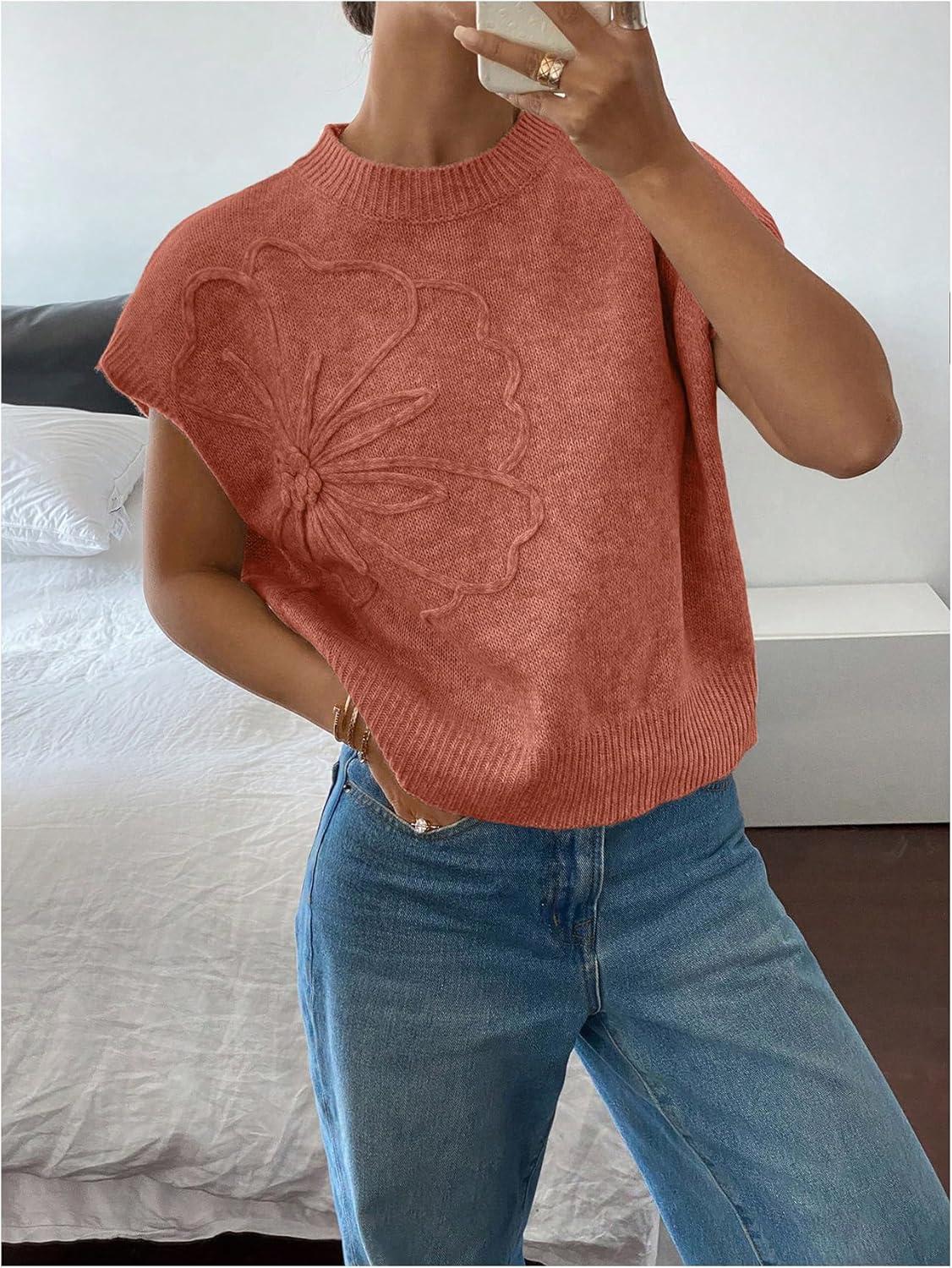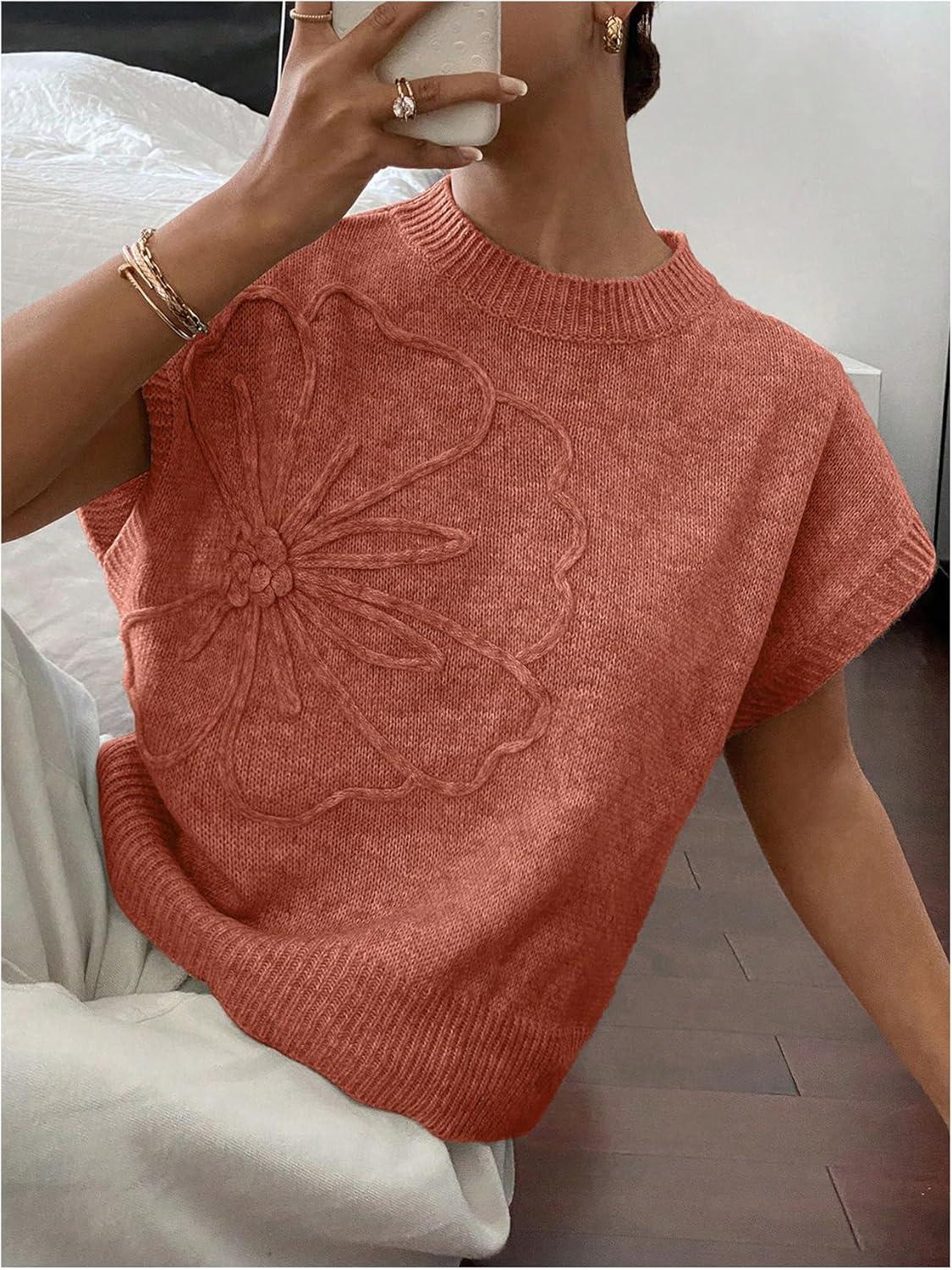 SOLY HUX Women’s Short Sleeve Sweater 3D Floral Sweaters Pullover Tank Tops Knit Vest Trendy Fashion Clothing(Coral Orange)
