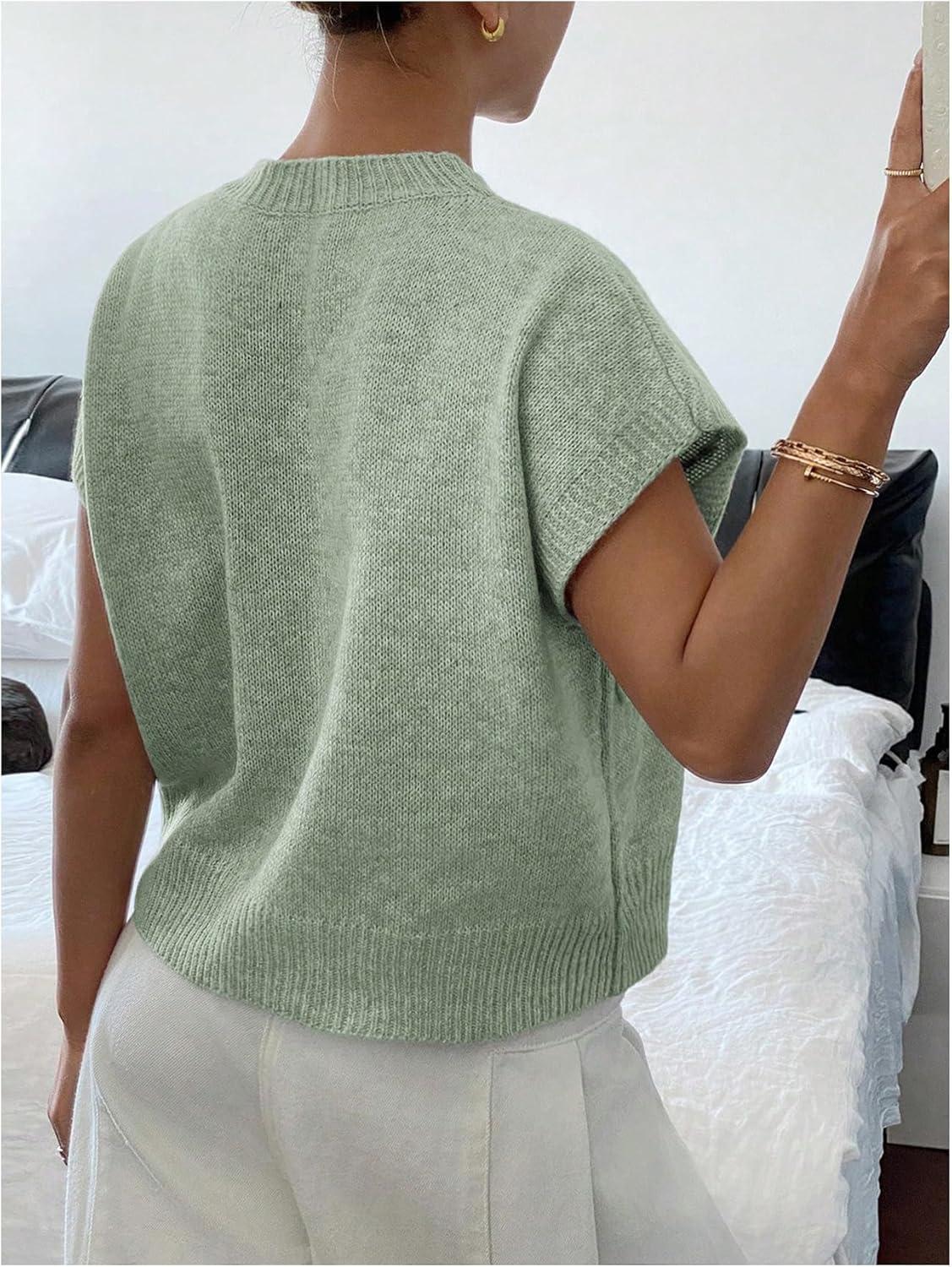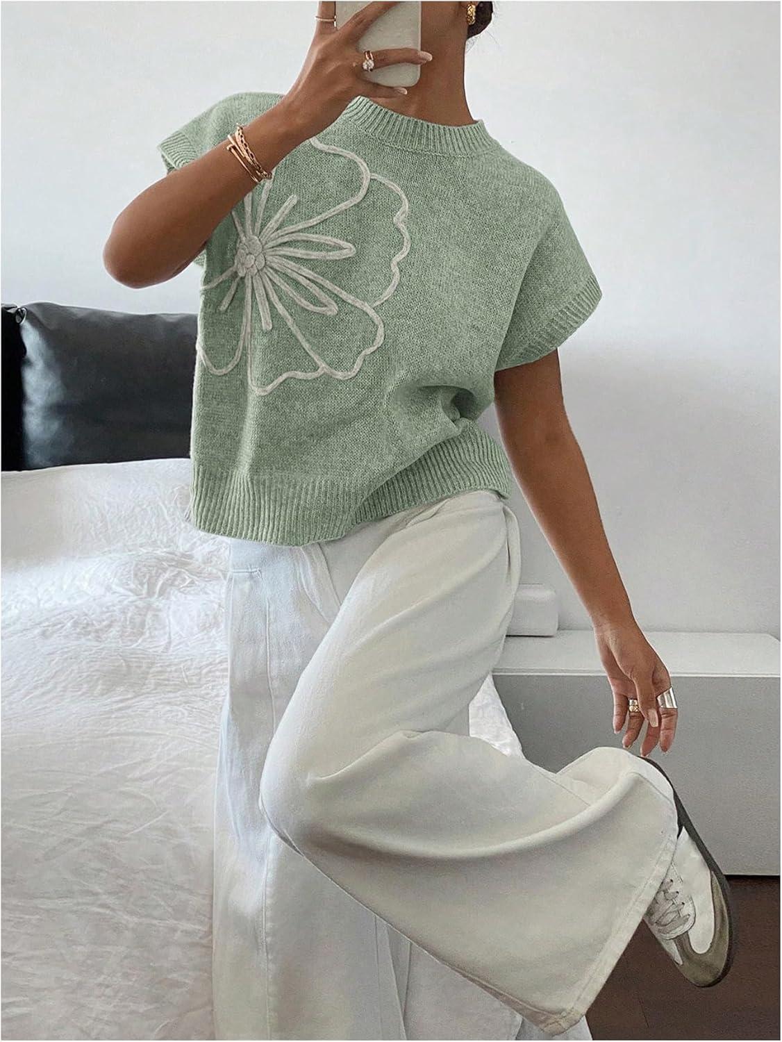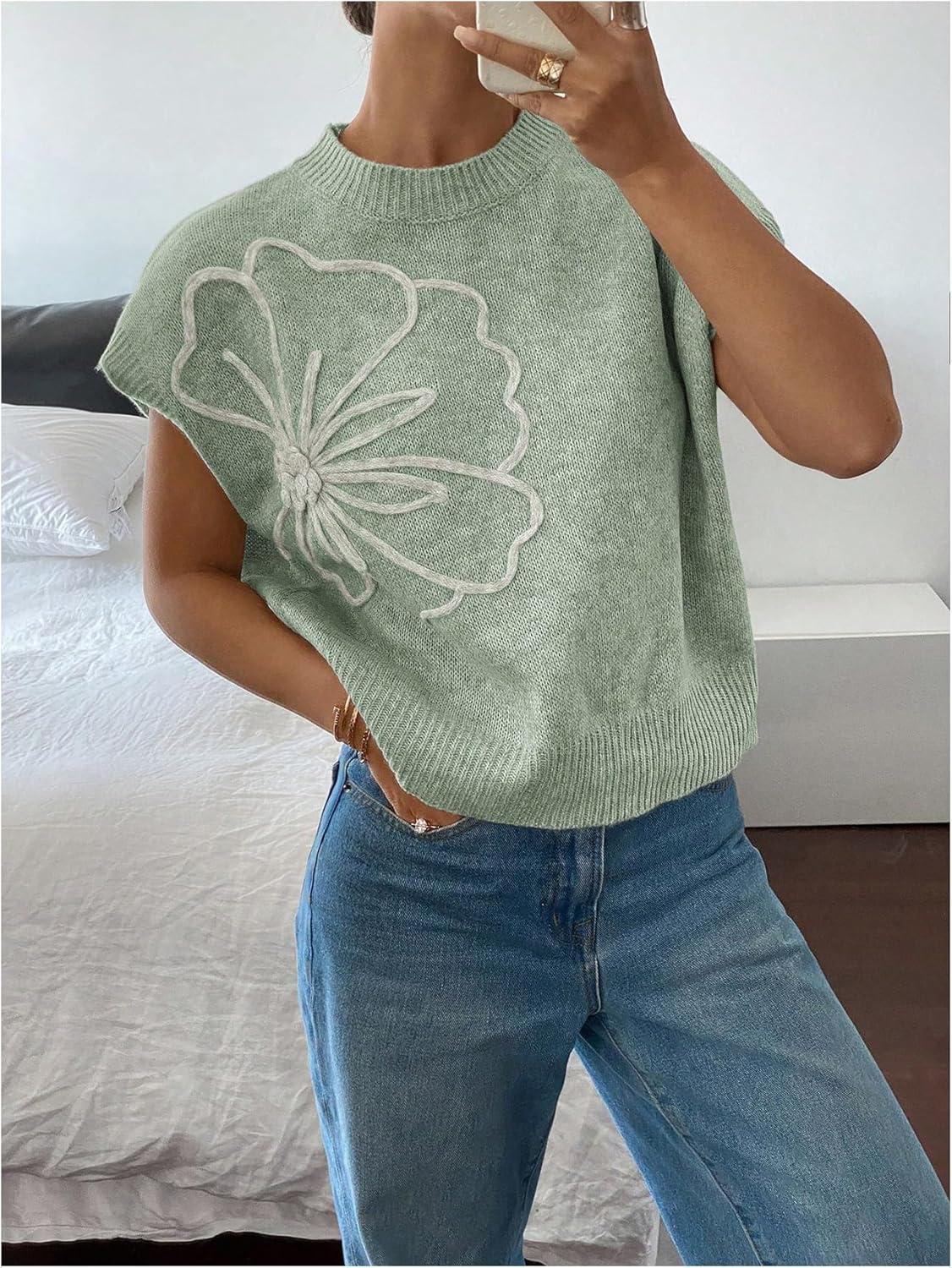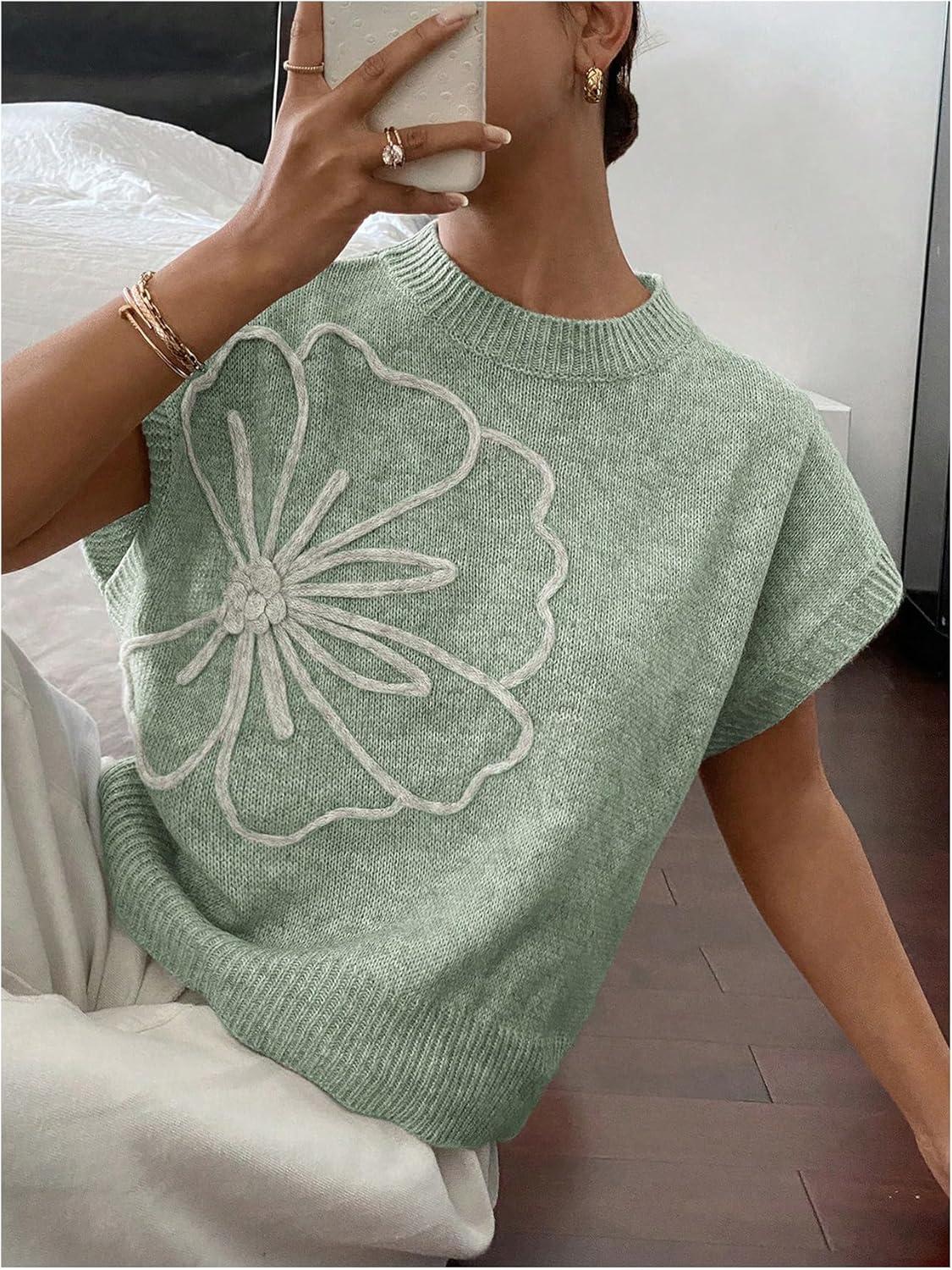 SOLY HUX Women’s Short Sleeve Sweater 3D Floral Sweaters Pullover Tank Tops Knit Vest Trendy Fashion Clothing(Mint Green)