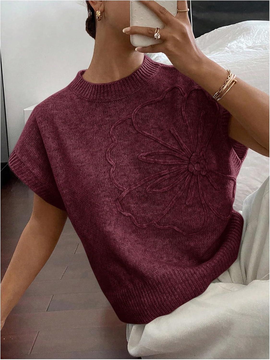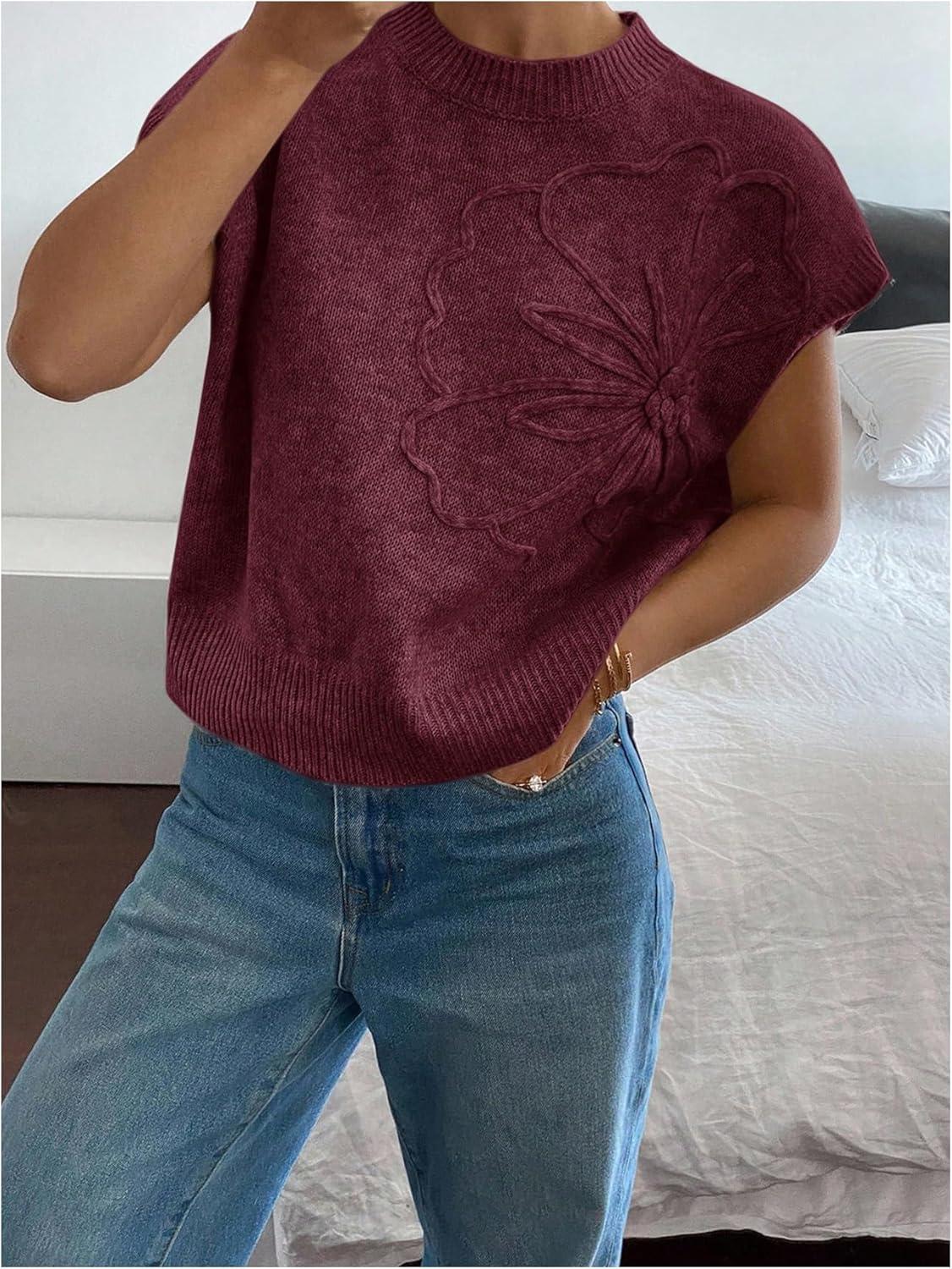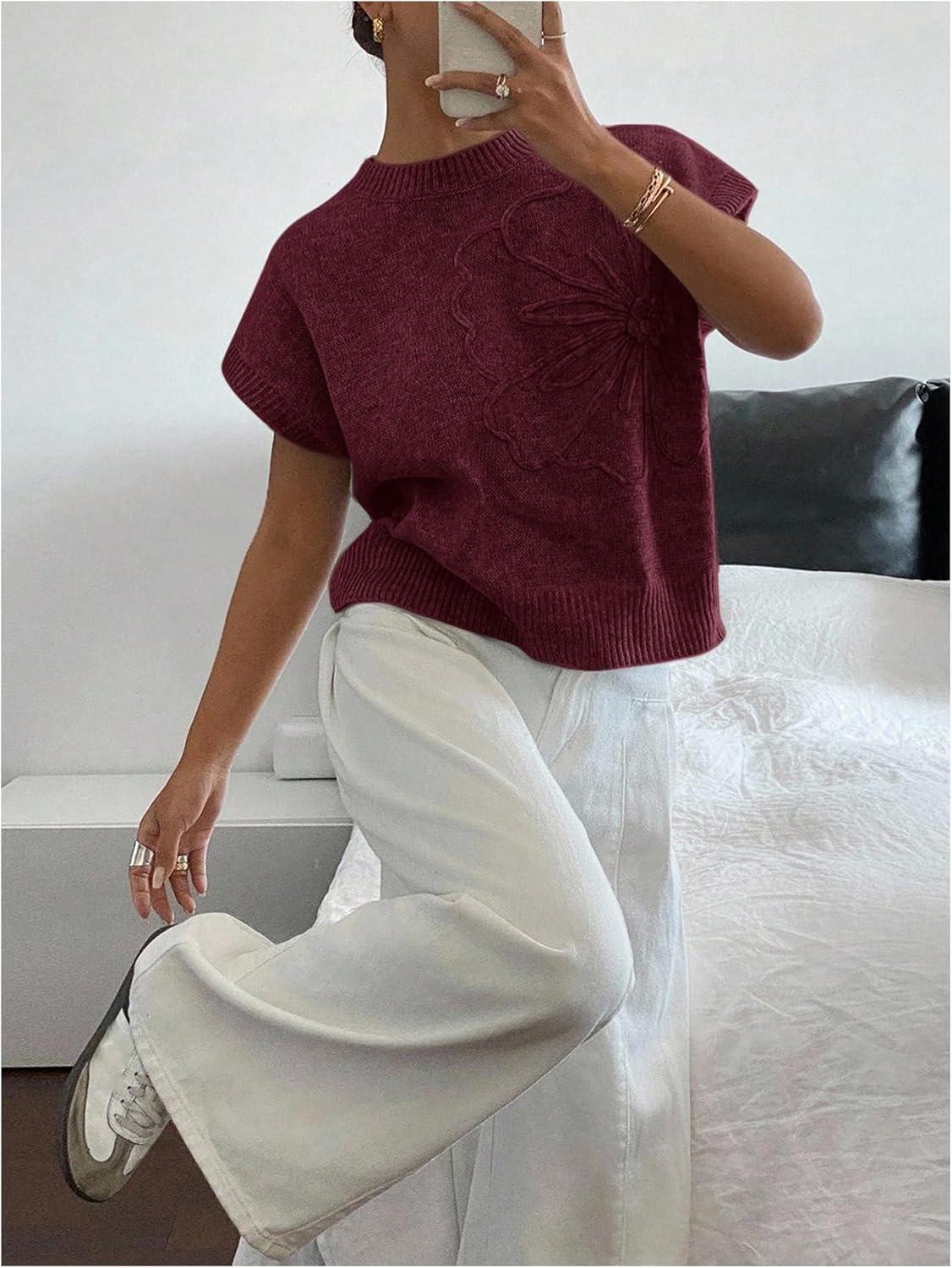 SOLY HUX Women’s Short Sleeve Sweater 3D Floral Sweaters Pullover Tank Tops Knit Vest Trendy Fashion Clothing(Red Violet)