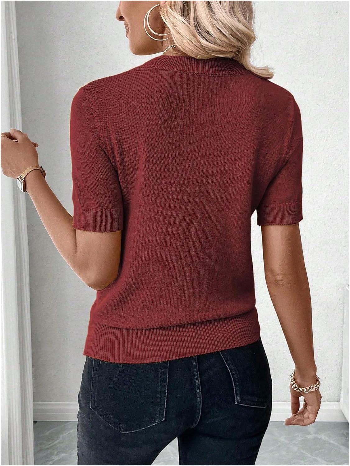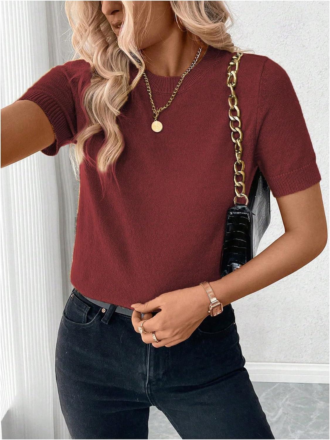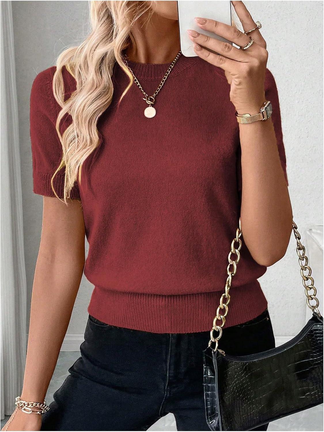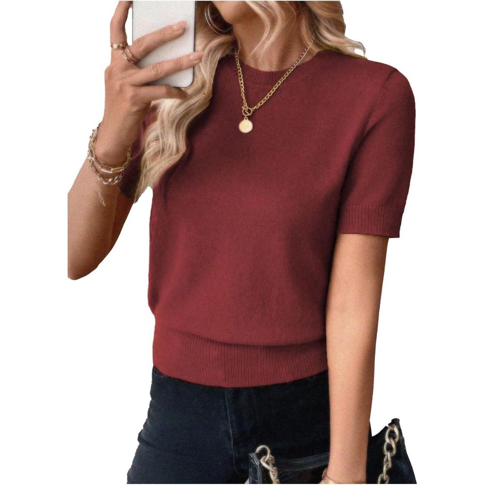 SOLY HUX Women’s Short Sleeve Sweater Crew Neck Dressy Casual Knit Tops(Pure Red)