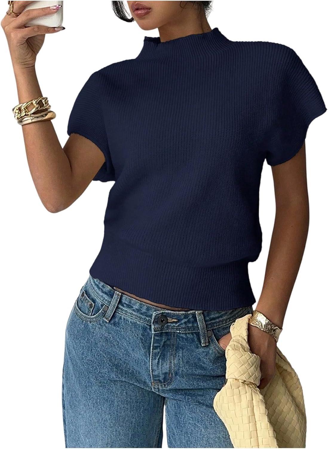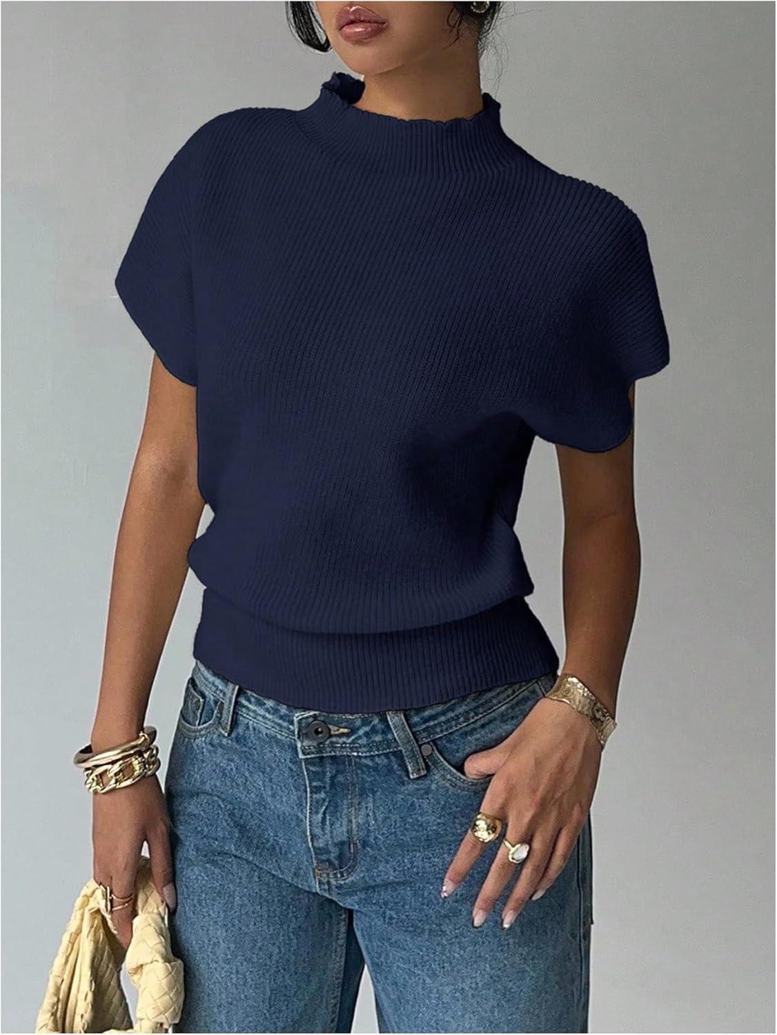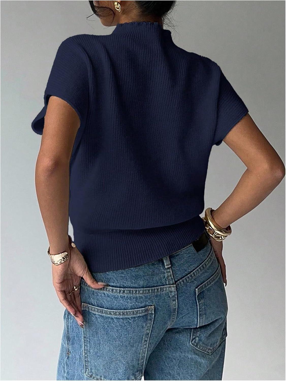SOLY HUX Women’s Short Sleeve Sweater Pullover Mock Neck Ribbed Knit Tops Work Office Outfit(Dark Blue)
