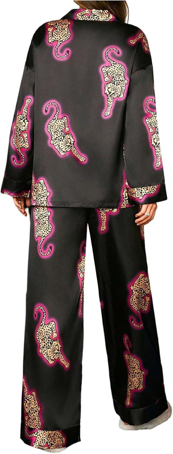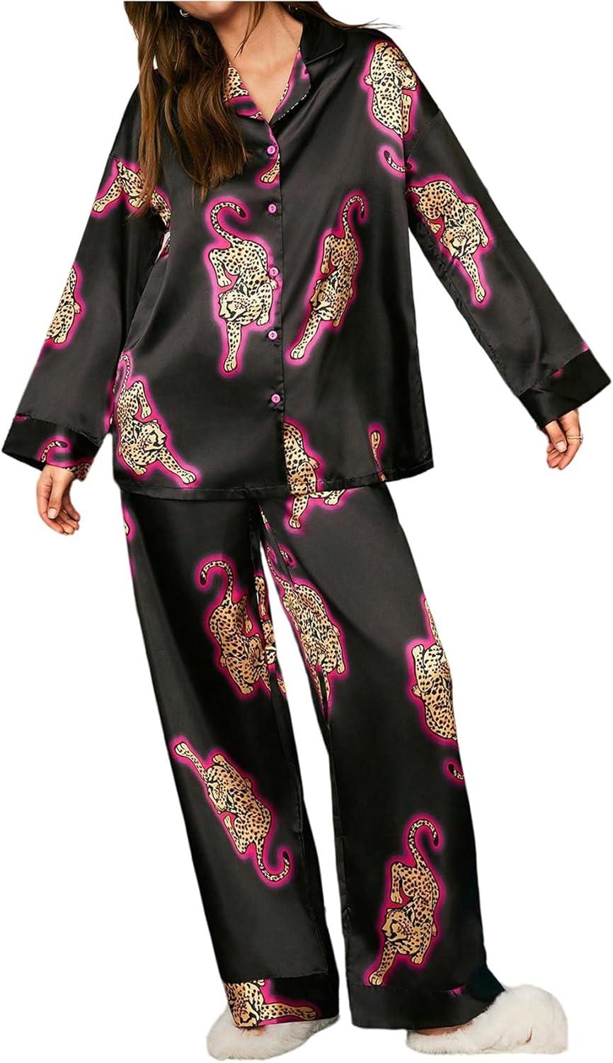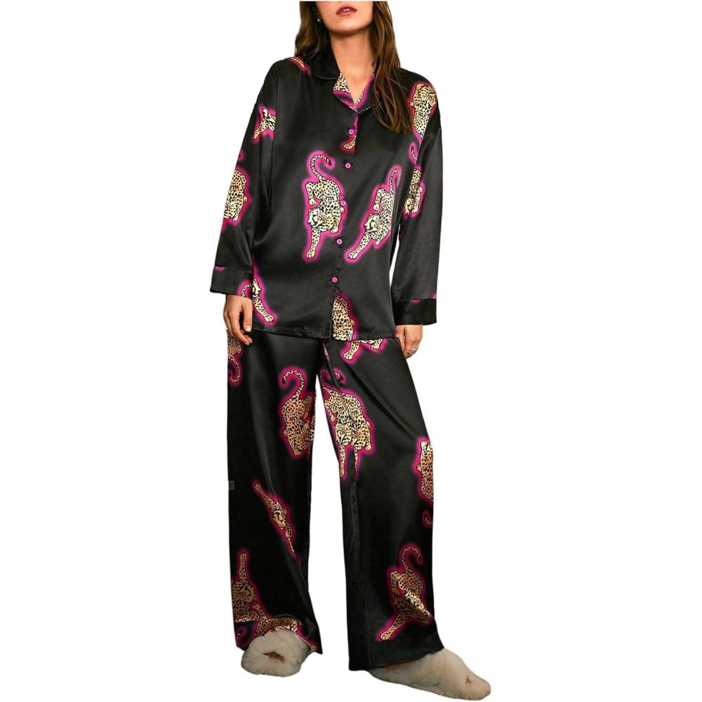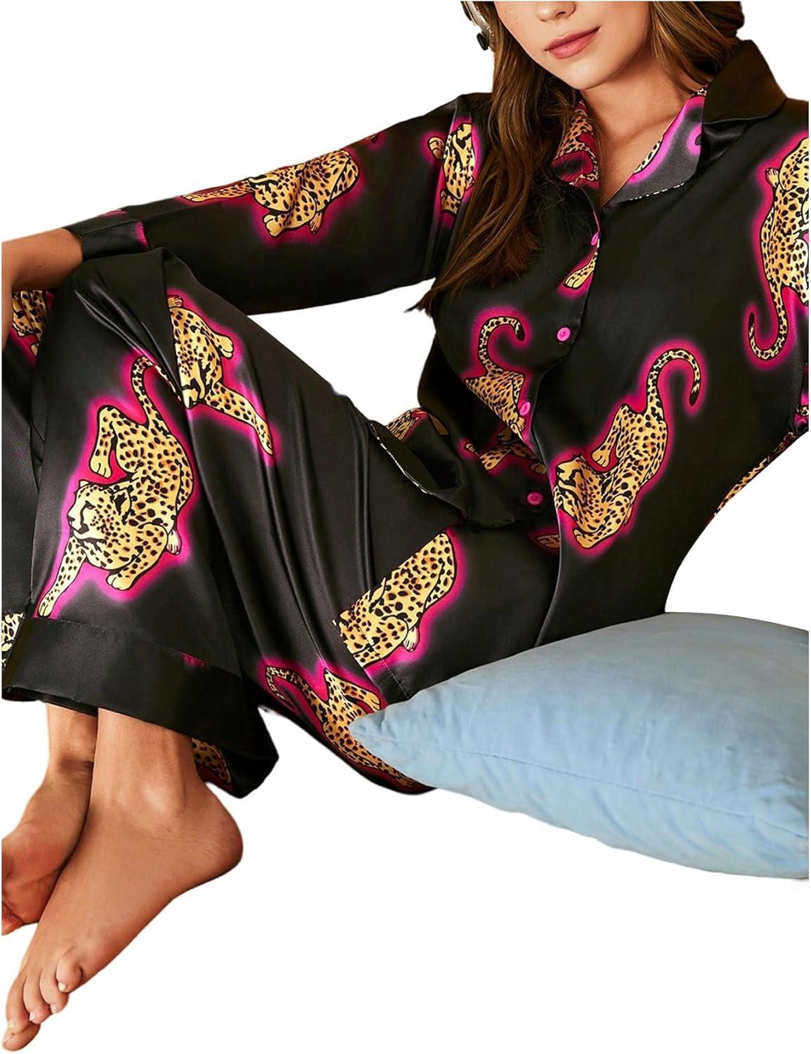 SOLY HUX Women’s Silk Pajama Set Leopard Print Satin Sleepwear Long Sleeve Button Down Shirt and Pants Sets(Black Leopard)