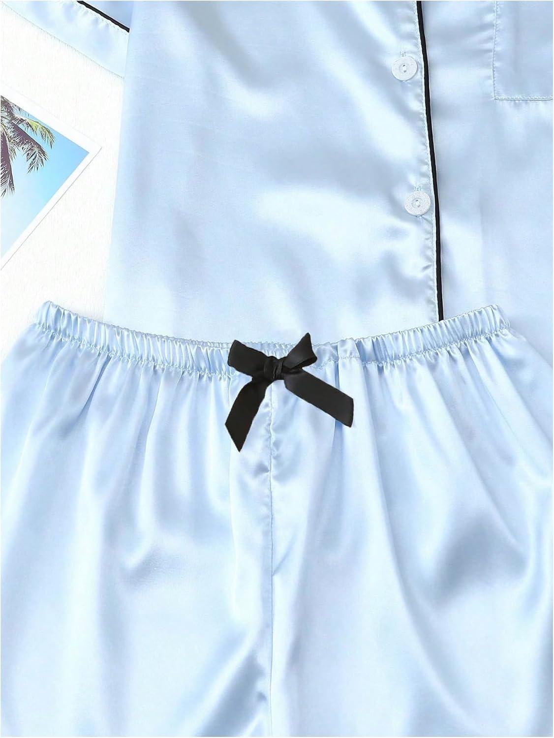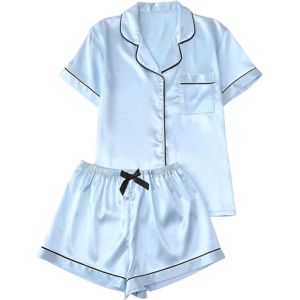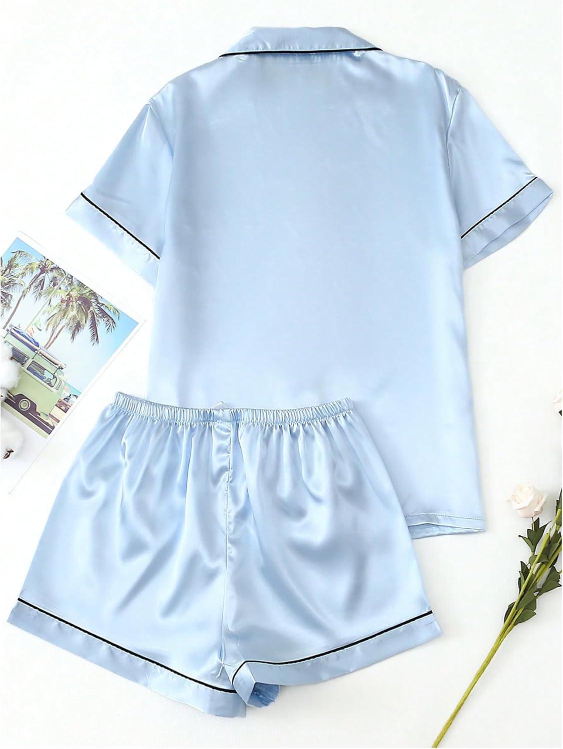 SOLY HUX Women’s Silk Satin Pajamas Short Sleeve Button Down Sleepwear Loungewear Shorts Set 2 Piece(Light Blue)