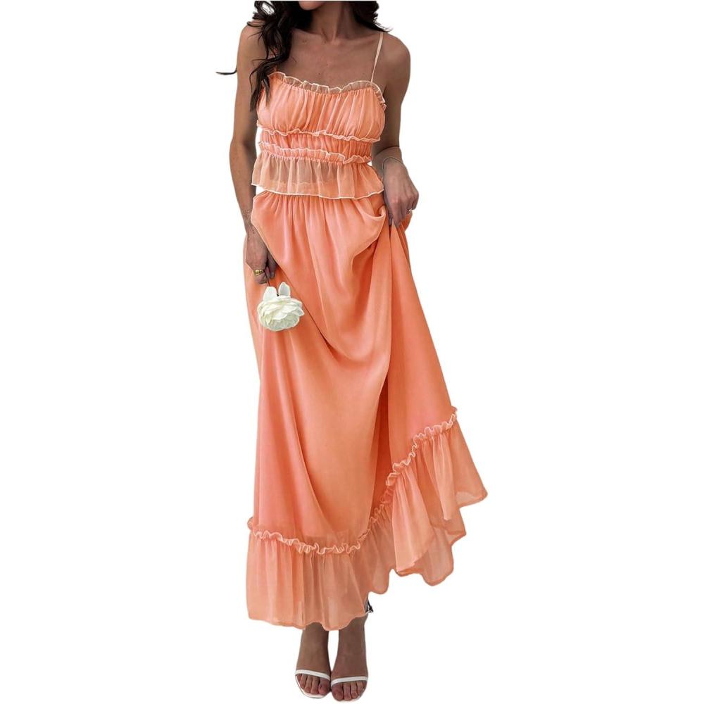 SOLY HUX Women’s Skirt Sets 2 Piece Outfits Contrast Trim Ruffle Hem Cami Tops and Maxi Skirt Vacation Set(Plain Coral Pink)