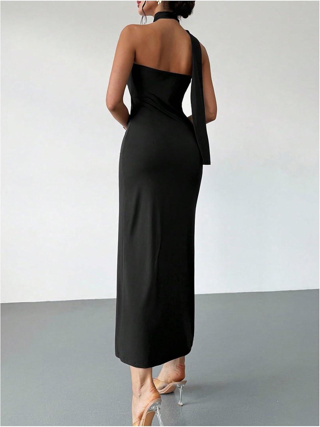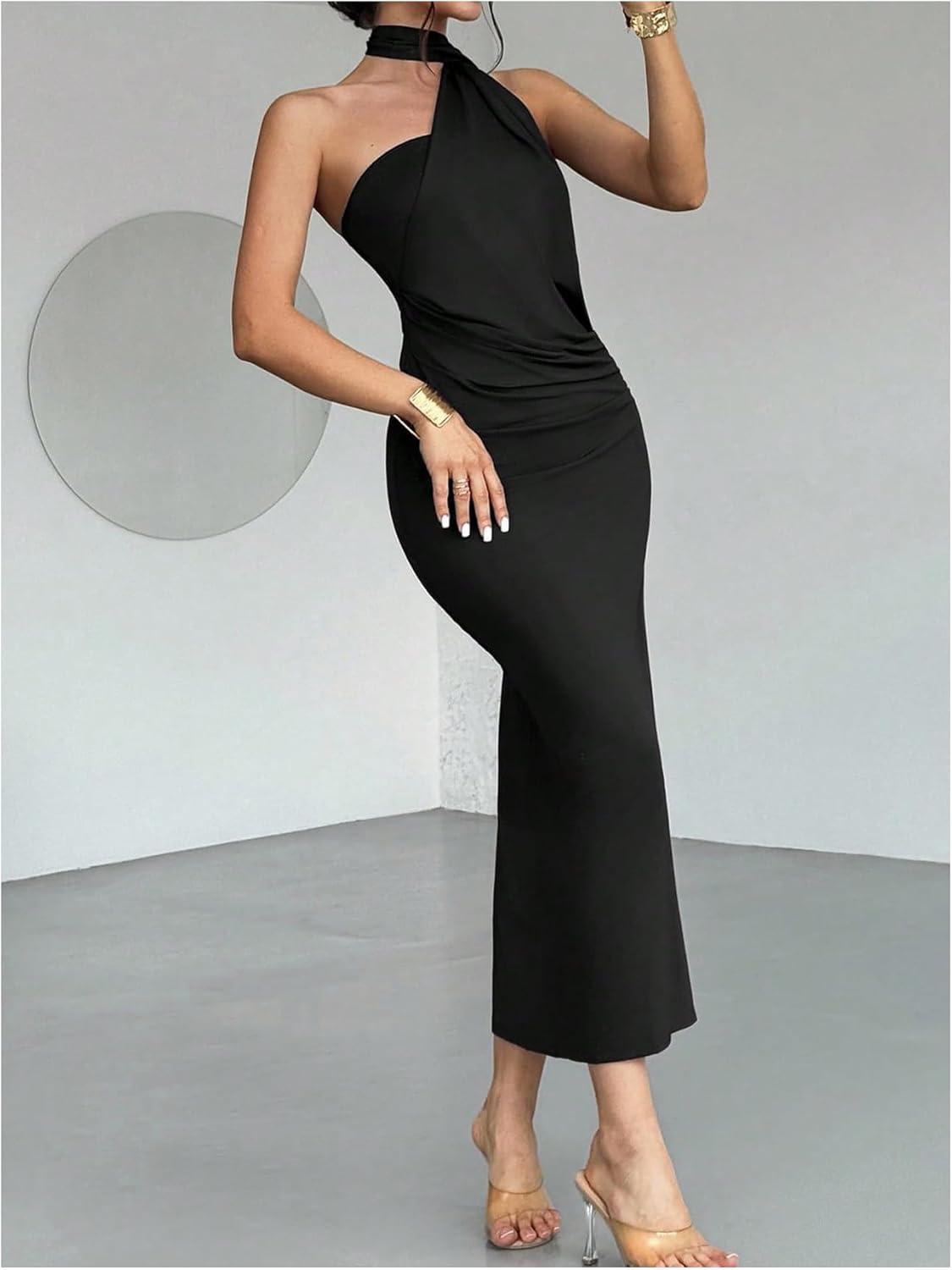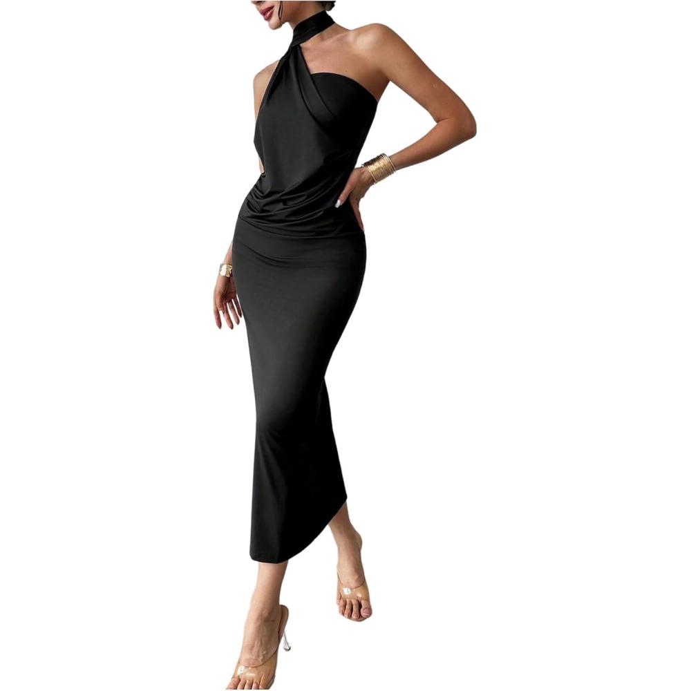 SOLY HUX Women’s Sleeveless Bodycon Dress One Shoulder Backless Ruched Cocktail Party Evening Long Dresses(Pure Black)